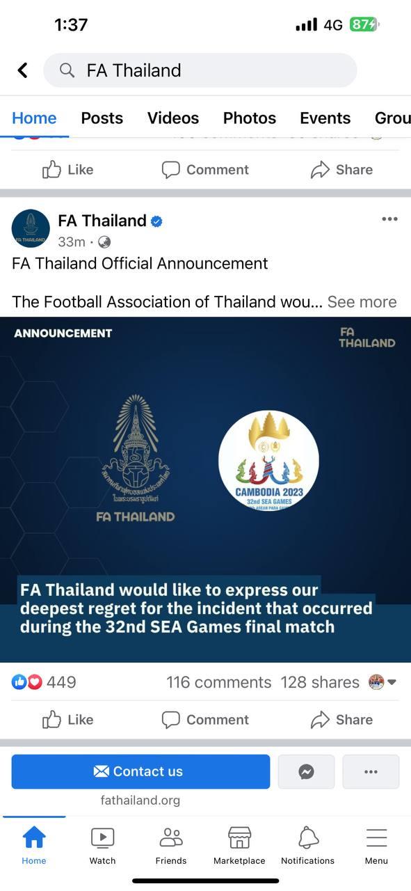 នៅក្នុងសេចក្តីថ្លែងការណ៍សង្ខេបរបស់សហព័ន្ធបាល់ទាត់ថៃបានបញ្ជាក់ថា «FA ថៃពិតជាមានការខកចិត្តជាខ្លាំង និងសុំទោសចំពោះទង្វើដែលមិនសមហេតុផលដែលបានកើតឡើងនៅអំឡុងការប្រកួតនាថ្ងៃទី១៦ ខែឧសភា ឆ្នាំ២០២៣ ក្នុងវិញ្ញាសាបាល់ទាត់បុរសរវាងថៃ និងឥណ្ឌូនេស៊ីដែលមានអ្នកគាំទ្រនៅក្នុងកីឡដ្ឋានច្រើនកុះករ និងជុំវិញពិភពលោក ដែលបានឲ្យខូចកិត្តិយសធ្ងន់ធ្ងរដល់មុខមាត់ព្រឹត្តិការណ៍កីឡាតំបន់អាស៊ីអាគ្នេយ៍ និងមុខមាត់បាល់ទាត់ថៃផងដែរ»។