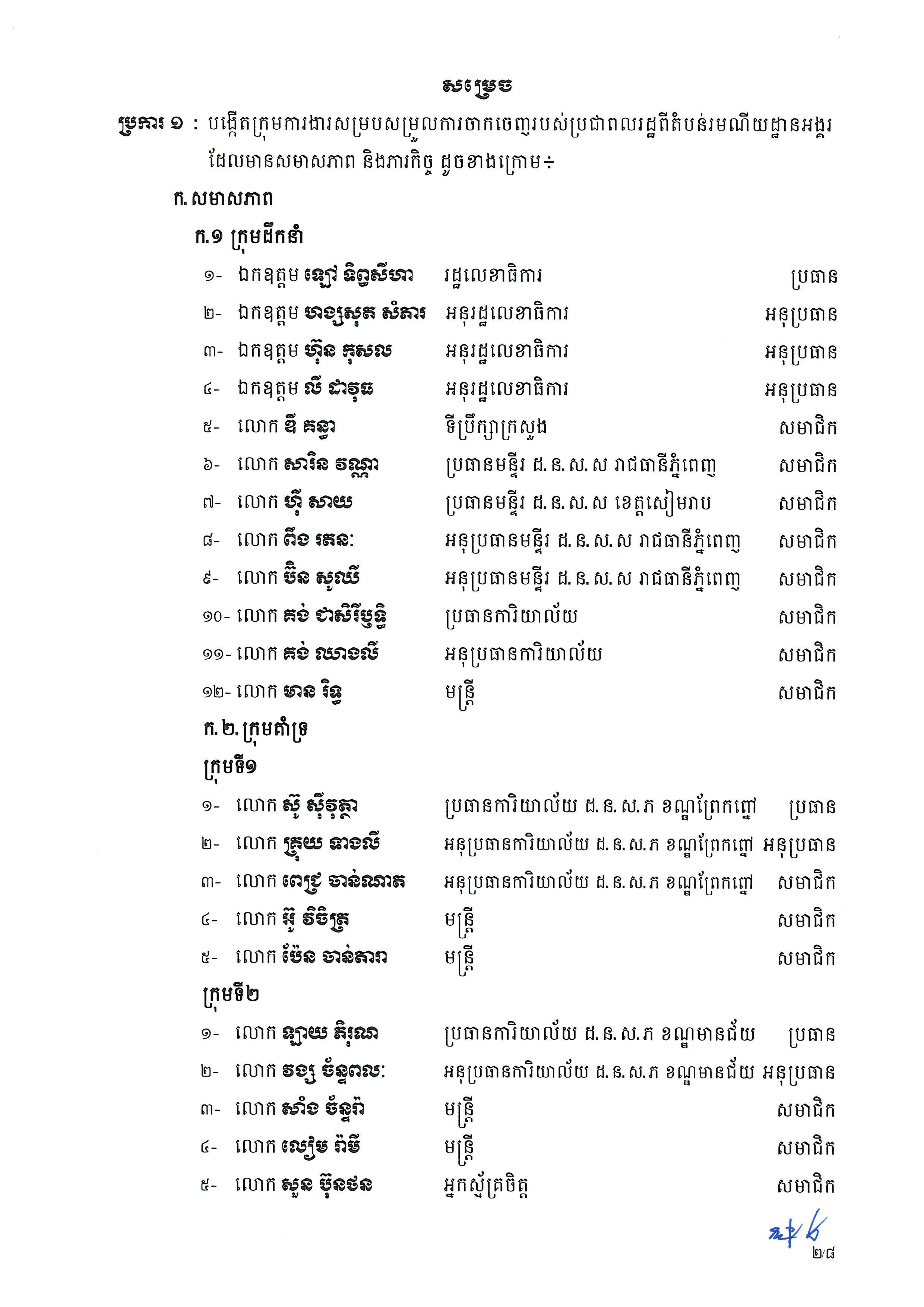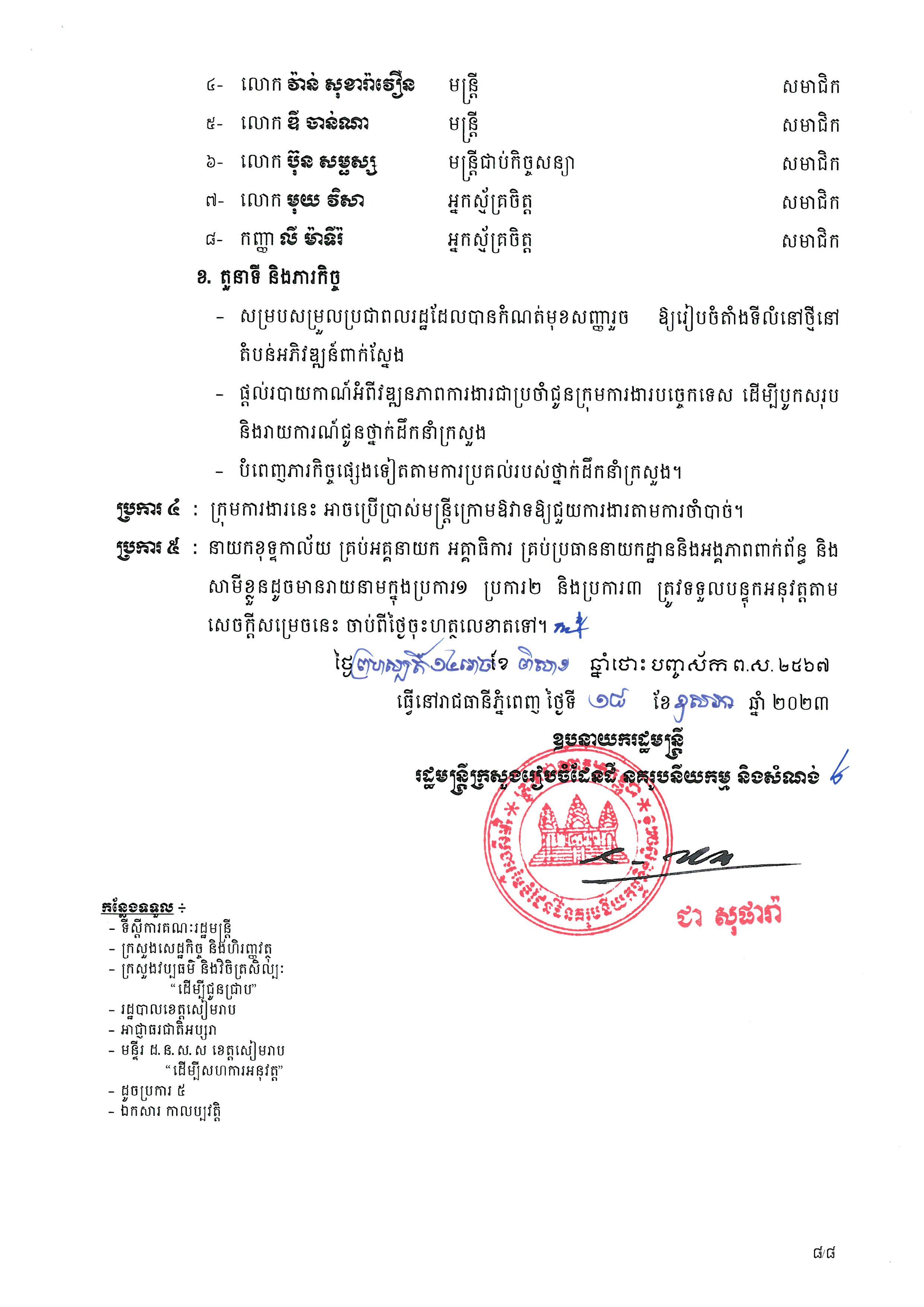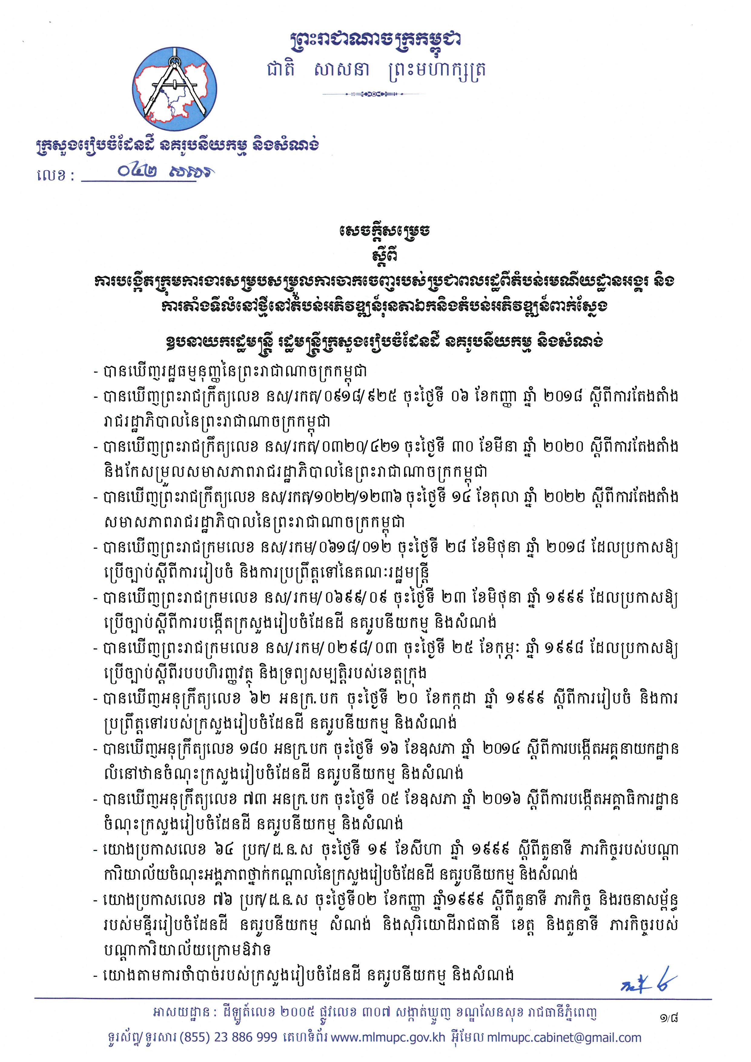 (ភ្នំពេញ)៖ លោកឧបនាយករដ្ឋមន្ត្រី ជា សុផារ៉ា រដ្ឋមន្ត្រីក្រសួងរៀបចំដែនដី នគរូបនីយកម្ម និងសំណង់ បានចេញសេចក្តីសម្រេចបង្កើតក្រុមការងារសម្របសម្រួល ការចាកចេញរបស់ពលរដ្ឋពីតំបន់រមណីយអង្គរ ទៅកាន់ទីតាំងថ្មីនៅតំបន់អភិវឌ្ឍន៍រុនតាឯក និងតំបន់អភិវឌ្ឍន៍ពាក់ស្នែង។ នេះបើតាមសេចក្តីសម្រេចដែលបណ្តាញព័ត៌មាន Fresh News ទទួលបាននៅព្រឹកថ្ងៃទី១៩ ខែឧសភានេះ។