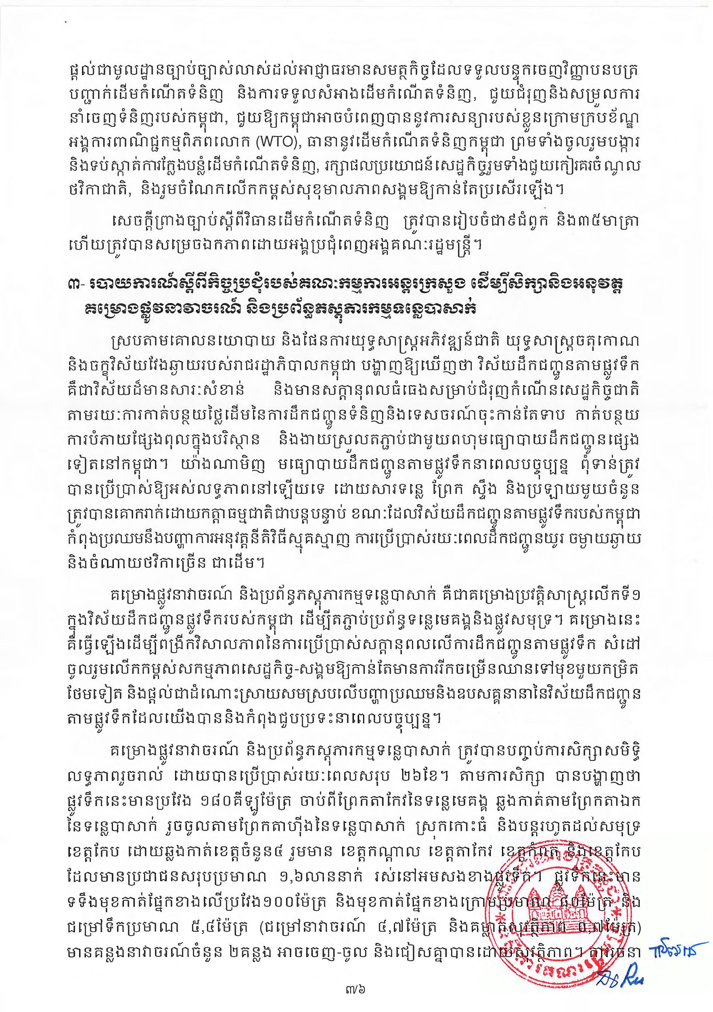 ទន្ទឹមនឹងការទទួលយកគម្រោងនេះ ក្នុងកិច្ចប្រជុំនាព្រឹកមិញនេះ បានប្រគល់ភារកិច្ចដល់គណៈកម្មាធិការជាតិទន្លេមេគង្គកម្ពុជា ជូនដំណឹងពាក់ព័ន្ធគម្រោងសាងសង់ផ្លូវនាវាចរណ៍ទន្លេបាសាក់នេះ ទៅបណ្តាប្រទេសជា សមាជិកនៃគណៈកម្មការទន្លេមេគង្គ ស្របតាមកិច្ចព្រមព្រៀងស្តីពីកិច្ចសហប្រតិបត្តិការសម្រាប់ ការអភិវឌ្ឍប្រកបដោយចីរភាពនៃតំបន់អាងទន្លេមេគង្គឆ្នាំ១៩៩៥ ហៅកាត់ថា កិច្ចព្រមព្រៀងមេគង្គ ឆ្នាំ១៩៩៥។
