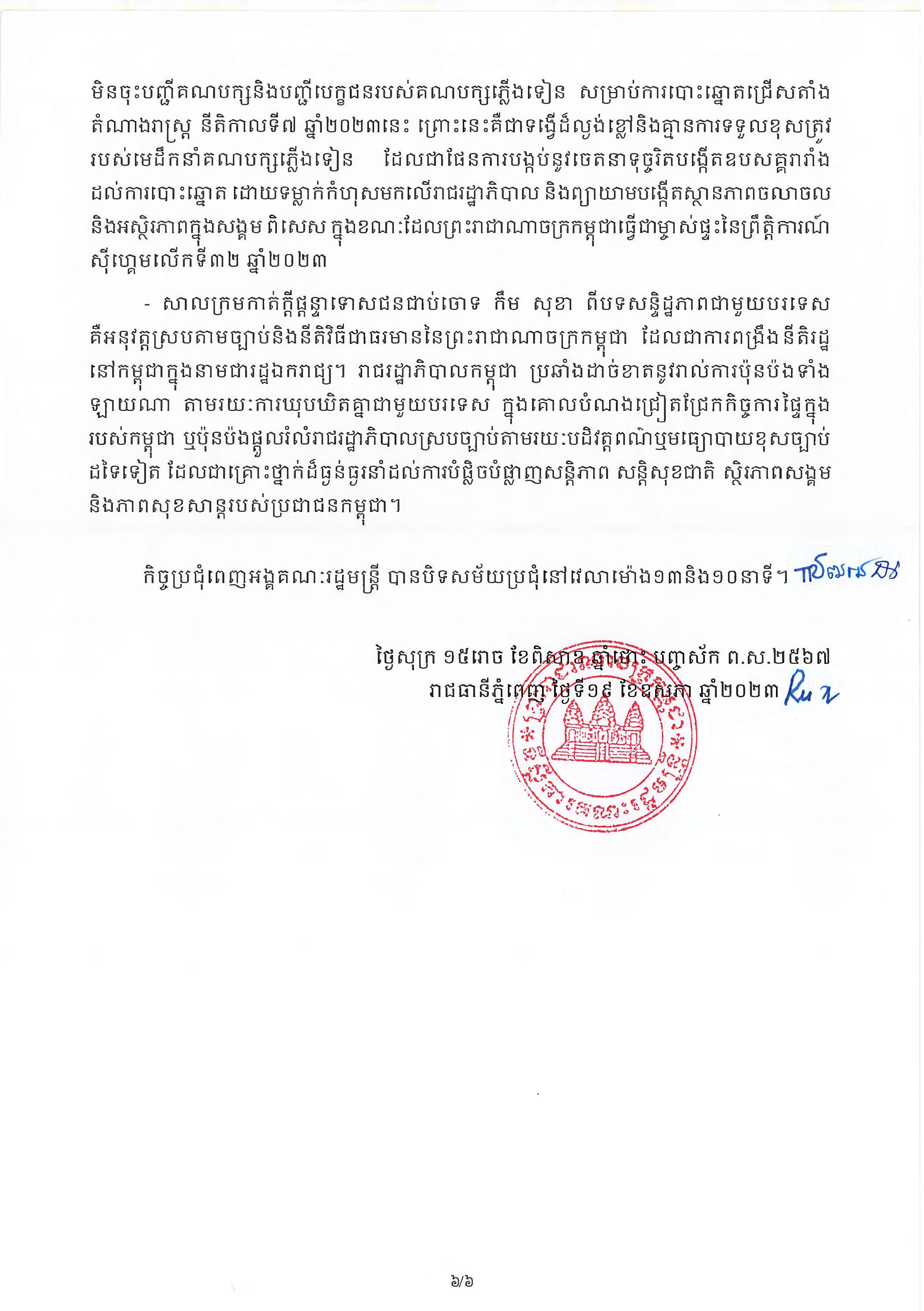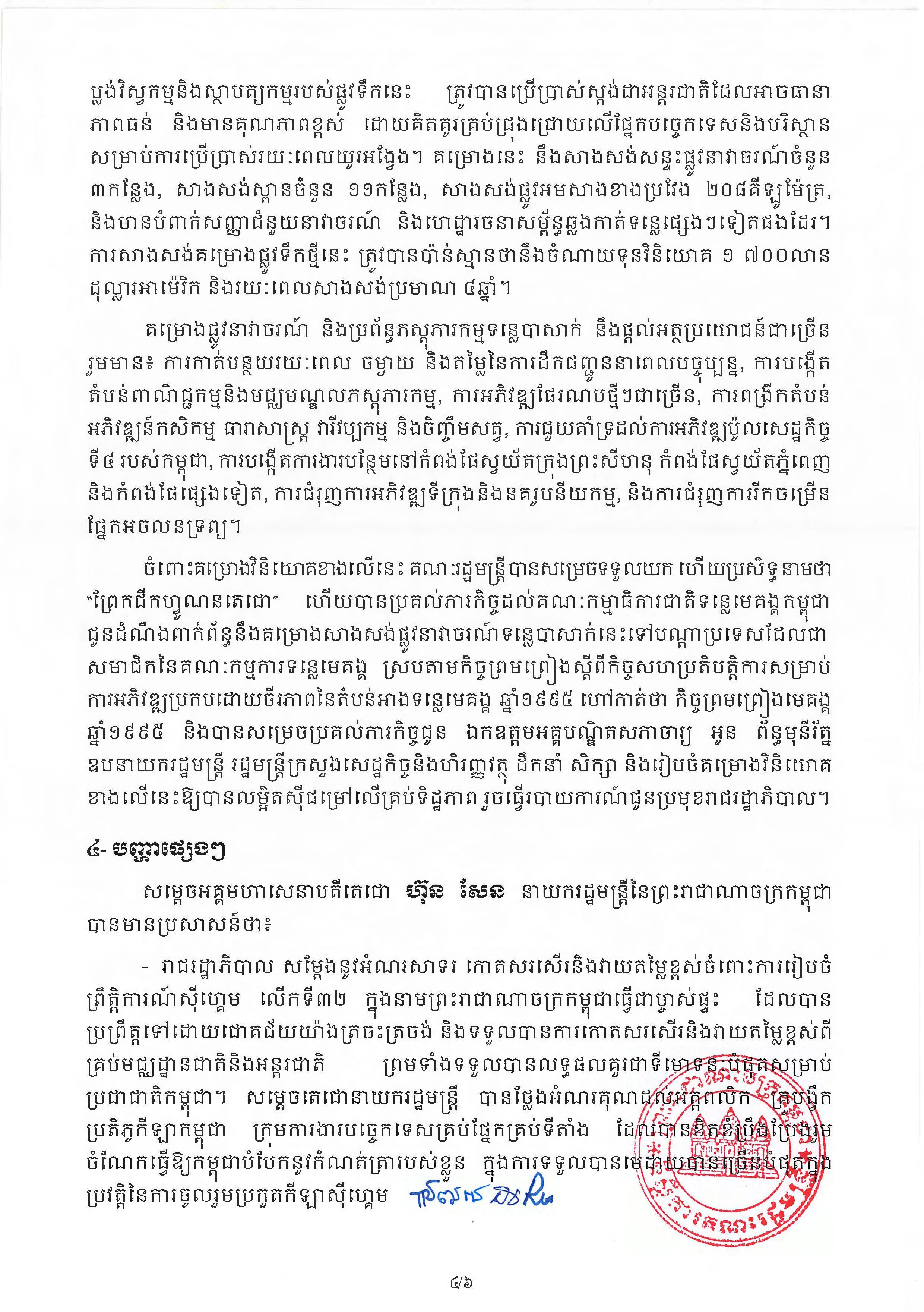 កិច្ចប្រជុំ ក៏បានសម្រេចប្រគល់ភារកិច្ចជូនលោកអគ្គបណ្ឌិតសភាចារ្យ អូន ព័ន្ធមុនីរ័ត្ន ឧបនាយករដ្ឋមន្ត្រី រដ្ឋមន្ត្រីក្រសួងសេដ្ឋកិច្ចនិងហិរញ្ញវត្ថុ ដឹកនាំសិក្សា និងរៀបចំគម្រោងវិនិយោគខាងលើនេះឱ្យបានលម្អិតស៊ីជម្រៅលើគ្រប់ទិដ្ឋភាព រួចធ្វើរបាយការណ៍ជូនប្រមុខរាជរដ្ឋាភិបាល។
