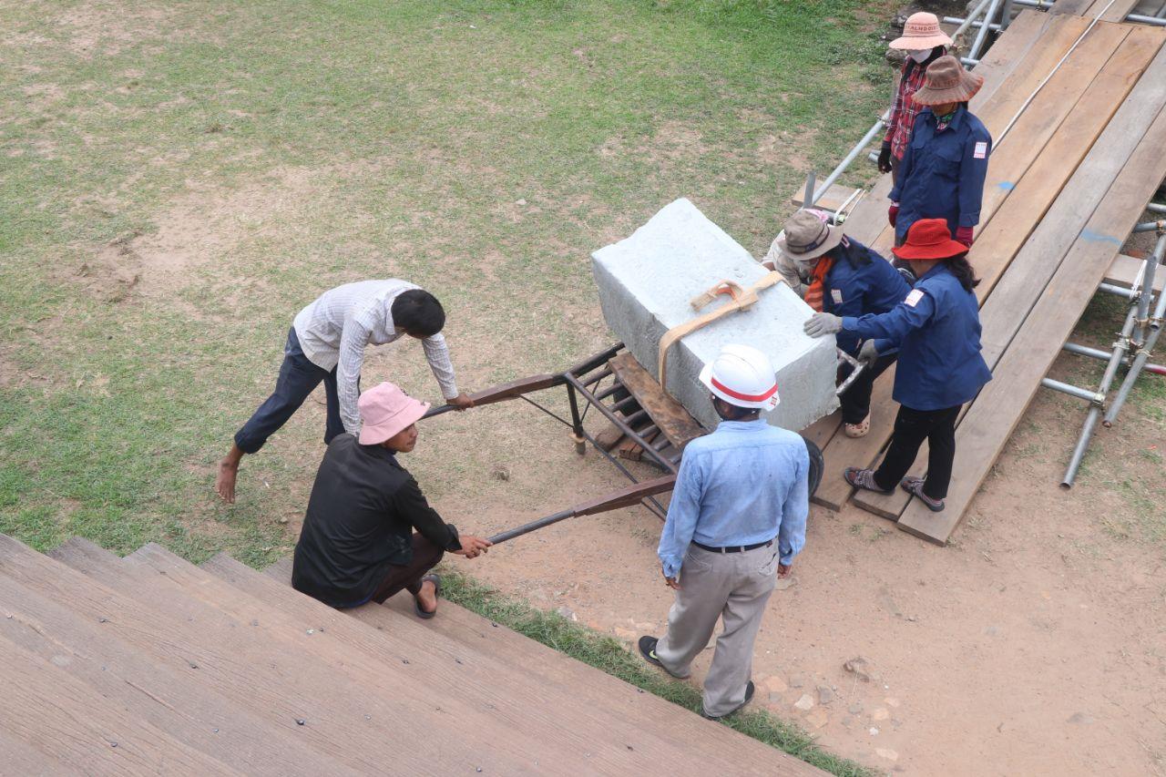 លោក ម៉ៅ ឡាន ក្រុមការងារអូសថ្មម្នាក់បានឱ្យដឹងថា កន្លងមក មិនមានការដ្ឋានការងារណាមានឧបសគ្គច្រើន ត្រូវប្រើកម្លាំងមនុស្សអូសទាញដុំថ្មធំៗ ច្រើនដំណាក់កាលដូចនៅប្រាសាទអង្គរវត្តនោះទេ។ លោកបន្តទៀតថា រូបលោកគឺជាអ្នកដែលមានវ័យចំណាស់ជាងគេនៅក្នុងក្រុម ដែលមានតួនាទីអូសថ្ម។ បើទោះបីជាយ៉ាងណា ក្នុងនាមជាអ្នកមានបទពិសោធន៍លើការងារជួសជុលប្រាសាទជាច្រើនឆ្នាំមកហើយ លោកតែងតែផ្តល់យោបល់ដល់ក្មេងៗជំនាន់ក្រោយជានិច្ច។