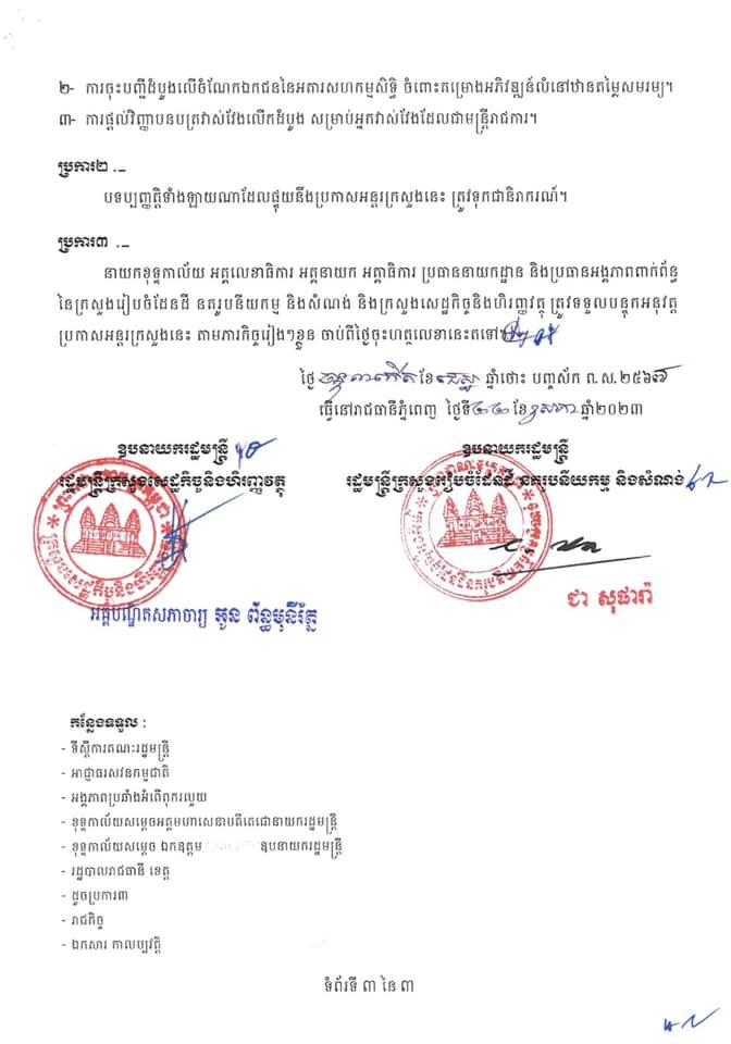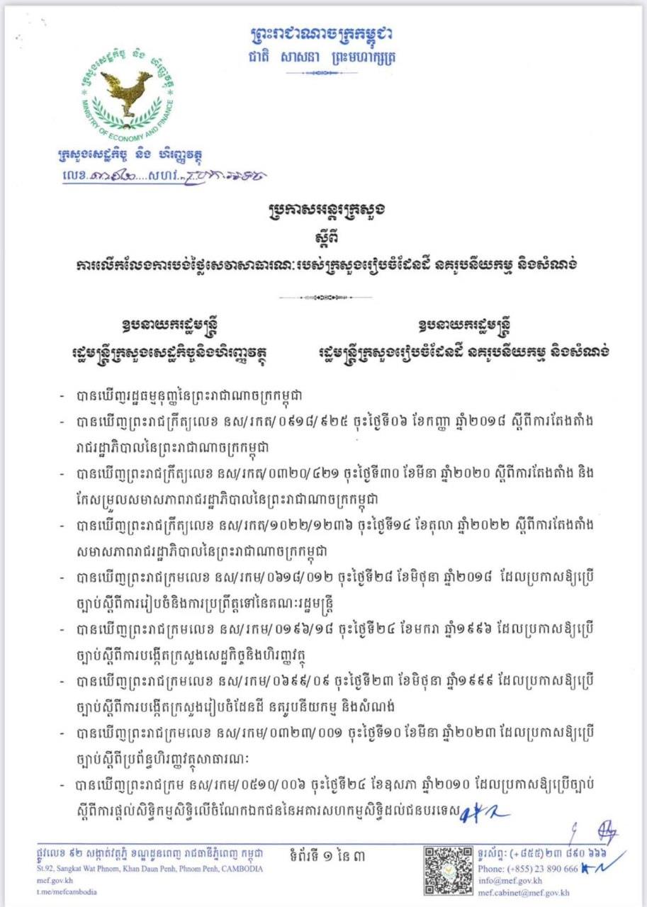(ភ្នំពេញ)៖ រដ្ឋមន្ត្រីក្រសួងសេដ្ឋកិច្ច និងហិរញ្ញវត្ថុ និងក្រសួងរៀបចំដែនដី នគរូបនីយកម្ម និងសំណង់ បានចេញប្រកាសរួមគ្នាមួយ ស្តីពីការលើកលែងការបង់ថ្លៃសេវាសាធារណៈរបស់ក្រសួងរៀបចំដែនដី នគរូបនីយកម្ម និងសំណង់។ នេះបើតាមប្រកាសដែលបណ្តាញព័ត៌មាន Fresh News ទទួលបាននៅថ្ងៃទី២៥ ខែឧសភា ឆ្នាំ២០២៣នេះ។