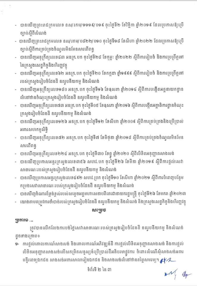 រដ្ឋសម្រេចលើកលែងការបង់ថ្លៃសេវាសាធារណៈ របស់ក្រសួងរៀបចំដែនដី នគរូបនីយកម្ម និងសំណង់
