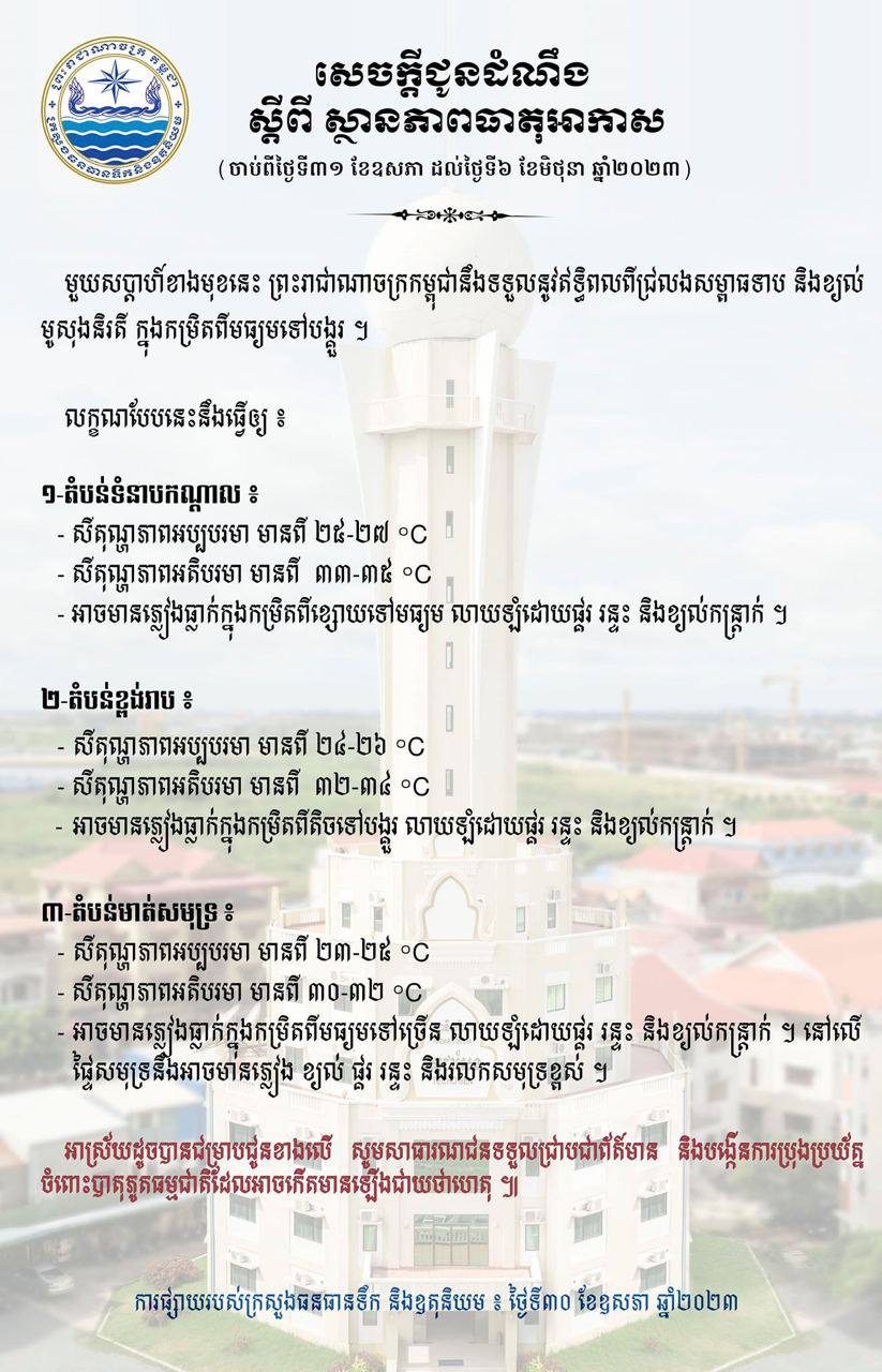 (ភ្នំពេញ)៖ ក្រសួងធនធានទឹក និងឧតុនិយម នៅព្រឹកថ្ងៃទី៣០ ខែឧសភា ឆ្នាំ២០២៣នេះ បានចេញសេចក្តីជូនដំណឹងពីស្ថានភាពធាតុអាកាស ចាប់ពីថ្ងៃទី៣១ ខែឧសភា ដល់ថ្ងៃទី៦ ខែមិថុនា ឆ្នាំ២០២៣។