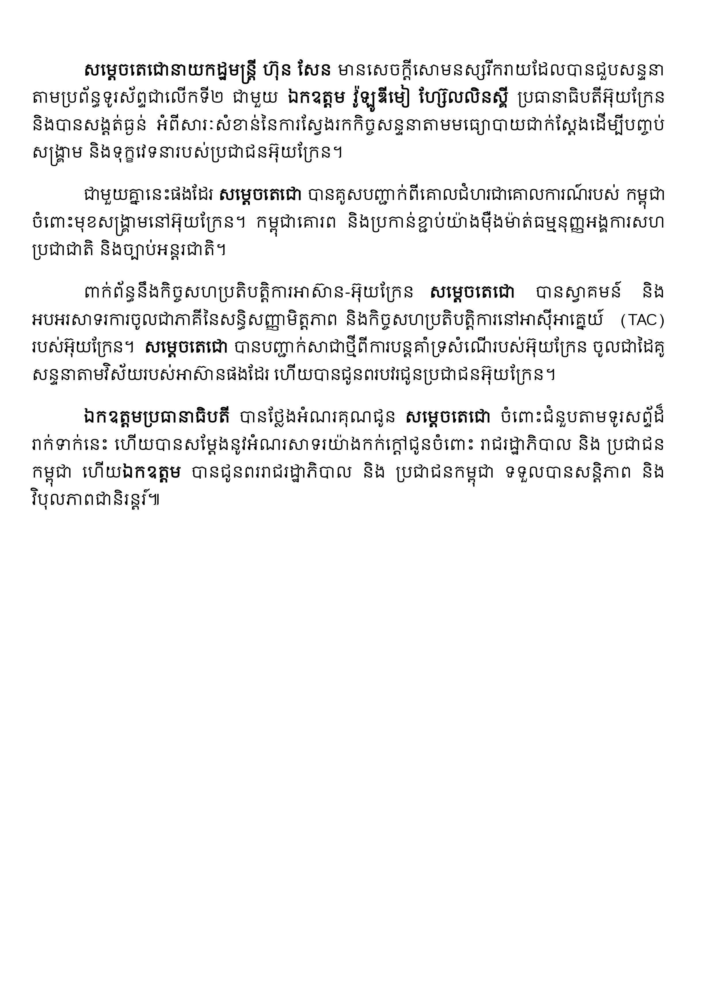 សម្តេចតេជោនាយកដ្ឋមន្ត្រី ហ៊ុន សែន មានសេចក្តីសោមនស្សរីករាយដែលបានជួបសន្ទនាតាមប្រព័ន្ធទូរស័ព្ទជាលើកទី២ ជាមួយ លោក វ៉ូឡូឌីមៀ ហ្សេលិនស្គី ប្រធានាធិបតីអ៊ុយក្រែន និងបានសង្តត់ធ្ងន់ អំពីសារៈសំខាន់នៃការស្វែងរកកិច្ចសន្ទនាតាមមធ្យោបាយជាក់ស្តែងដើម្បីបញ្ចប់សង្គ្រាម និងទុក្ខវេទនារបស់ប្រជាជនអ៊ុយក្រែន។