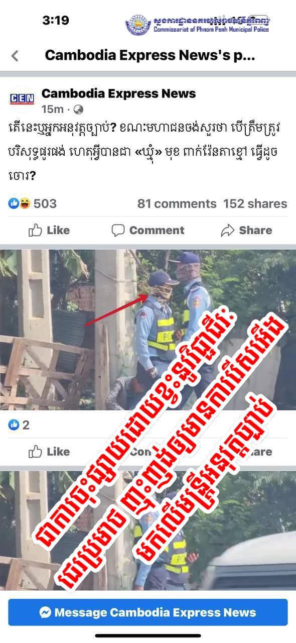 ស្នងការដ្ឋាននគរបាលរាជធានីភ្នំពេញ បានឱ្យដឹងថា បន្ទាប់ពីបានឃើញការចុះផ្សាយព័ត៌មានរបស់ផេកហ្វេសប៊ុកមួយមានឈ្មោះថា Cambodia Express News ដែលមានលក្ខណៈញុះញង់ បង្កឲ្យមានការរើសអើង បំផុសបំផុល ប្រមាថមើលងាយ មកលើមន្ត្រីនគរបាលចរាចរណ៍ជាអ្នកអនុវត្តច្បាប់ ដោយបានប្រៀបសមត្ថកិច្ចថាជា “ចោរ” ពាក្យមួយនេះគឺ ធ្ងន់ធ្ងរណាស់ សម្រាប់សមត្ថកិច្ចជាមន្ត្រីនគរបាលជាតិ អ្នកអនុវត្តច្បាប់ បែរជាសារព័ត៌មានខ្វះវិជ្ជាជីវៈមួយនេះ ចុះផ្សាយប្រមាថមើលងាយយ៉ាងធ្ងន់ធ្ងរបំផុតមកលើមន្ត្រីនគរបាលជាតិ។