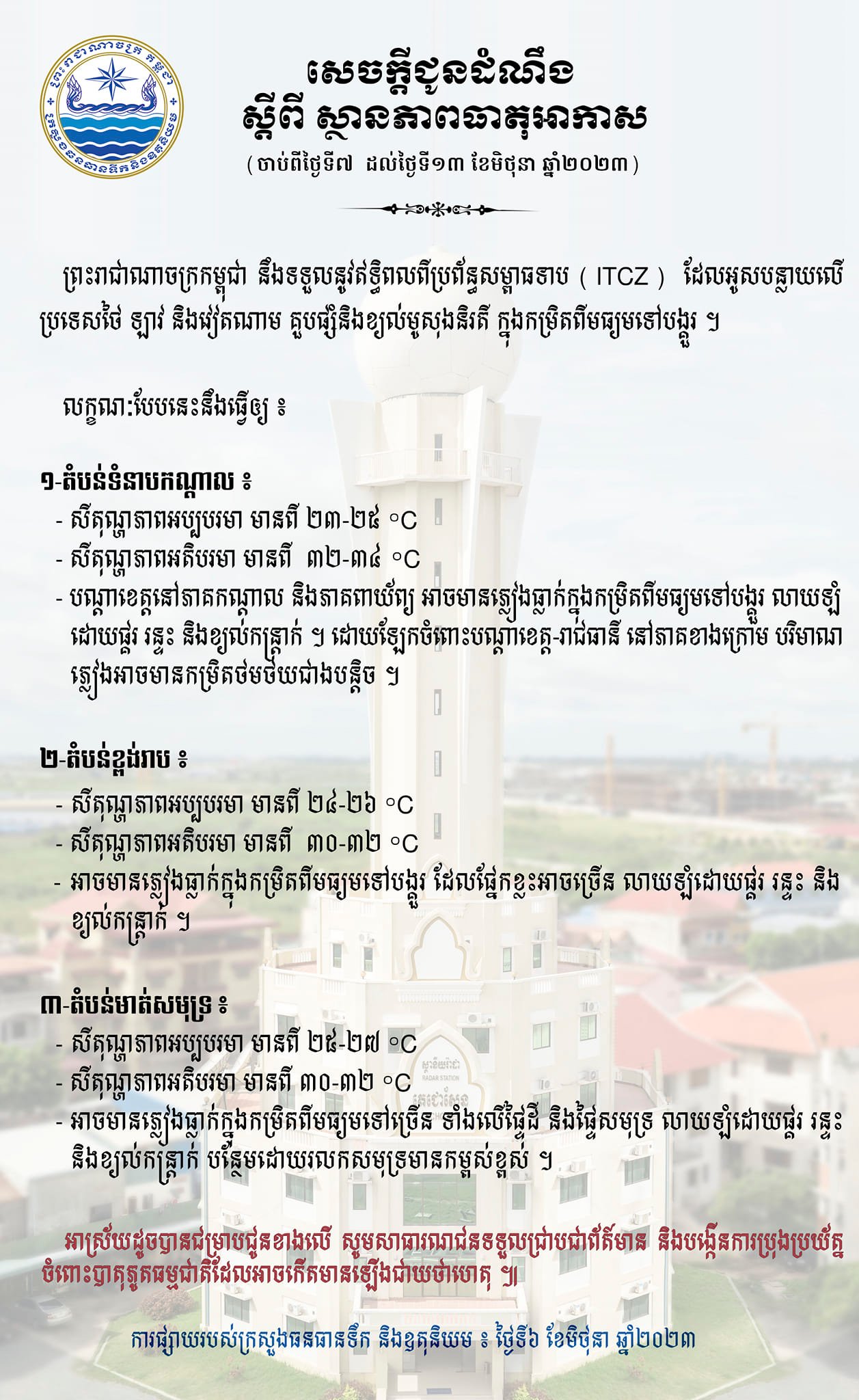 ក្រសួងបញ្ជាក់ថា ព្រះរាជាណាចក្រកម្ពុជា នឹងទទួលនូវឥទ្ធិពលពីប្រព័ន្ធសម្ពាធទាប (ITCZ) ដែលអូសបន្លាយលើប្រទេសថៃ ឡាវ និងវៀតណាម គួបផ្សំនិងខ្យល់មូសុងនិរតី ក្នុងកម្រិតពីមធ្យមទៅបង្គួរ។ លក្ខណៈបែបនេះនឹងធ្វើឲ្យ៖