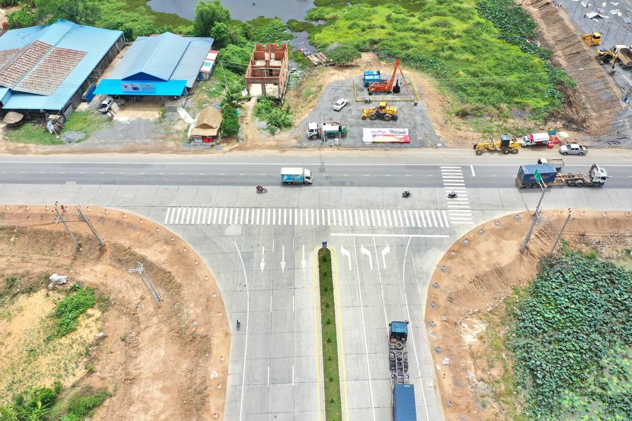 * ក្រាលបេតុងកៅស៊ូ(AC) កម្រាស់ ១០សង់ទីម៉ែត្រ និងថ្មលាយកៅស៊ូ(ATB) ១២ សង់ទីម៉ែត្រ ទទឹងតួផ្លូវ ២៤,៥ម៉ែត្រ មានគន្លងផ្លូវសម្រាប់រថយន្ដធ្វើចរាចរណ៍ចំនួន ៤គន្លង (២គន្លងទៅ-២គន្លងមក) ដែលគន្លងនីមួយៗមានទទឹង ៣,៧៥ម៉ែត្រ ខឿនសួនចែកទិសចរាចរណ៍ នៅចំកណ្តាលទ្រូងផ្លូវ ទទឹង ៣ម៉ែត្រ ចិញ្ចើមផ្លូវក្រាលបេតុងកៅស៊ូ ទទឹង ២,៥ម៉ែត្រ និងចិញ្ចើមផ្លូវក្រាលក្រួសក្រហម ទទឹង ០,៧៥ម៉ែត្រ ទាំងសងខាង។