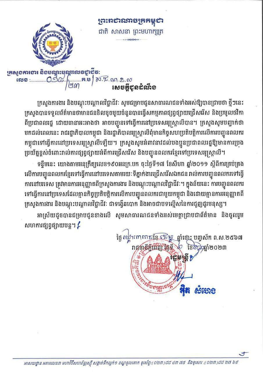 ក្រសួងសូមបញ្ជាក់ថា មកដល់ពេលនេះ រាជរដ្ឋាភិបាលកម្ពុជា និងរដ្ឋាភិបាលអូស្ត្រាលីពុំមានកិច្ចសហប្រតិបត្តិការលើការបញ្ចូនពលករ កម្ពុជាទៅធ្វើការនៅប្រទេសអូស្ត្រាលីឡើយ។ ក្រសួងសូមអំពាវនាវដល់បងប្អូនប្រជាពលរដ្ឋឱ្យមានការប្រុងប្រយ័ត្នខ្ពស់ចំពោះរាល់ការផ្សព្វផ្សាយអំពីការជ្រើសរើស និងបញ្ជូនពលករខ្មែរទៅប្រទេសអូស្ត្រាលី។