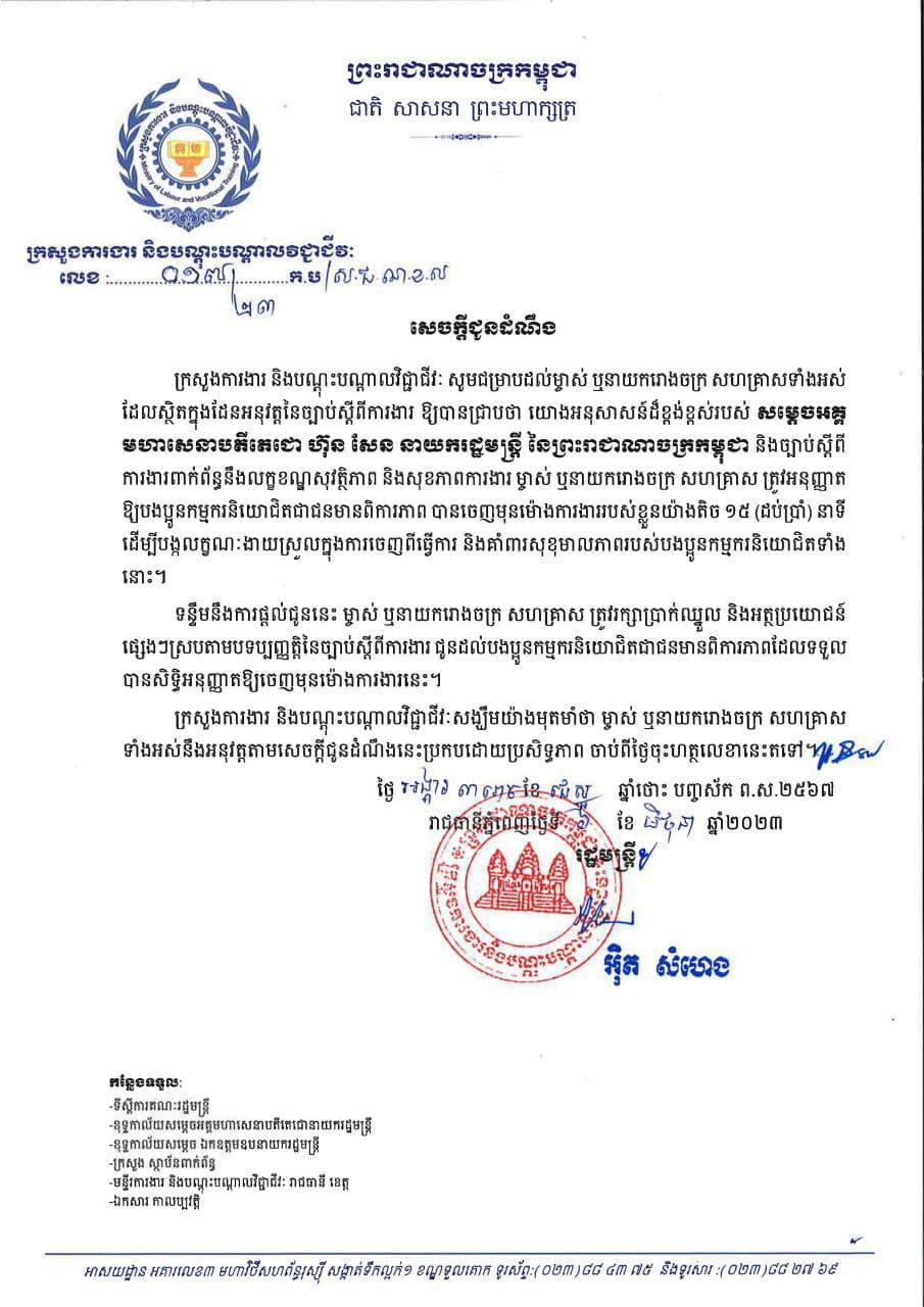 ក្រសួងការងារ និងបណ្តុះបណ្តាលវិជ្ជាជីវៈ សង្ឃឹមយ៉ាងមុតមាំថា ម្ចាស់ ឬនាយករោងចក្រ សហគ្រាស ទាំងអស់នឹងអនុវត្តតាមសេចក្តីជូនដំណឹងនេះប្រកបដោយប្រសិទ្ធភាព៕ ផ្តល់សិទ្ធិដោយ៖ freshnews