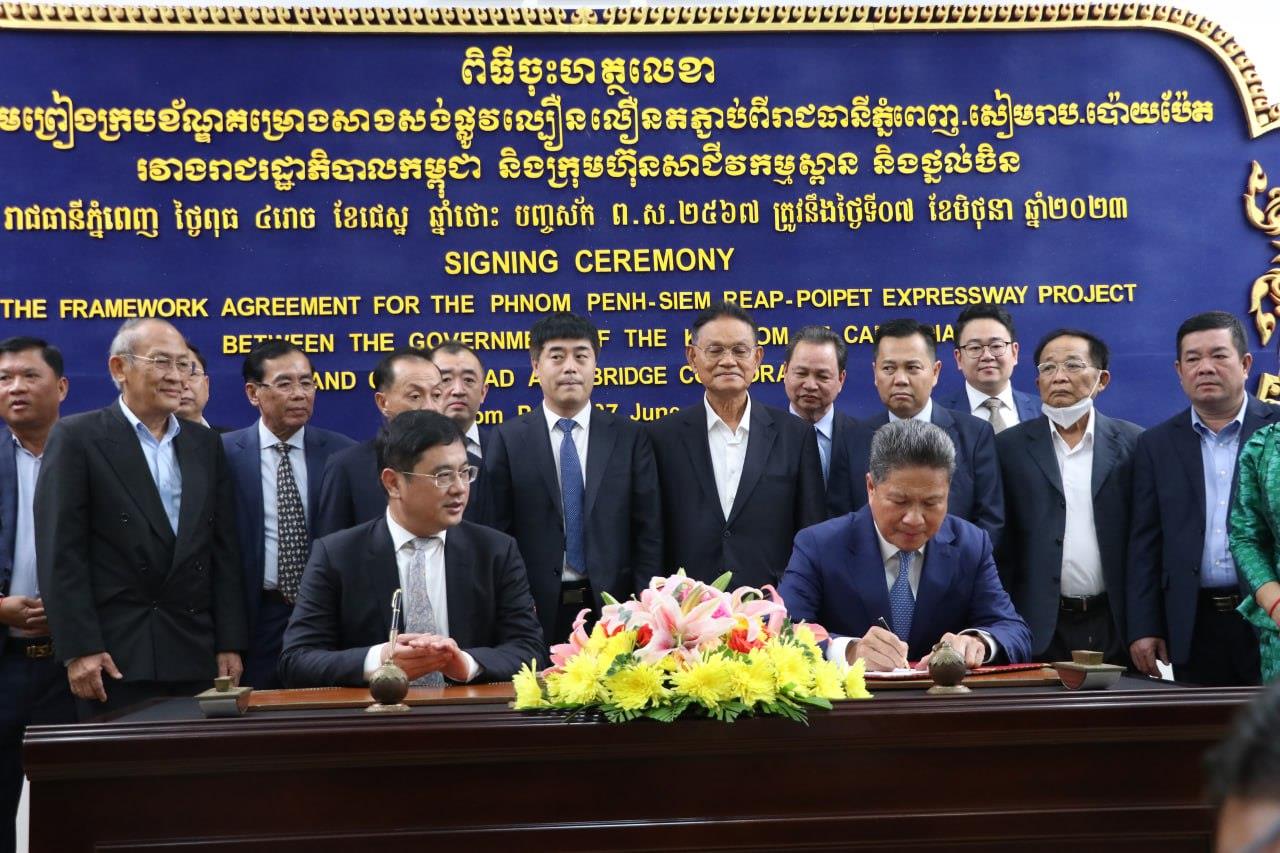 (ភ្នំពេញ)៖​ លោកទេសរដ្ឋមន្ត្រី ស៊ុន ចាន់ថុល រដ្ឋមន្ត្រីក្រសួងសាធារណការ និងដឹកជញ្ជូន​ នារសៀលថ្ងៃទី០៧​ ខែមិថុនា​ ឆ្នាំ២០២៣នេះ​ បានចុះហត្ថលេខាលើកិច្ចព្រមព្រៀងក្របខ័ណ្ឌ គម្រោងសាងសង់ផ្លូវល្បឿនលឿន តភ្ជាប់ពីរាជធានីភ្នំពេញ-សៀមរាប-ប៉ោយប៉ែត ជាមួយលោកតំណាងក្រុមហ៊ុនសាជីវកម្មស្ពាន និងថ្នល់ចិន (CRBC) នៅទីស្តីការក្រសួងសាធារណការ និងដឹកជញ្ជូន។