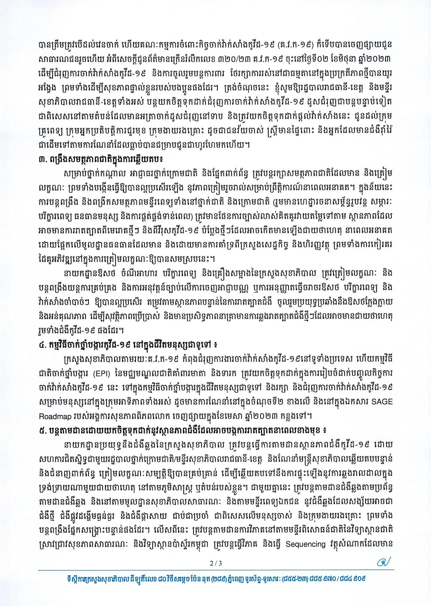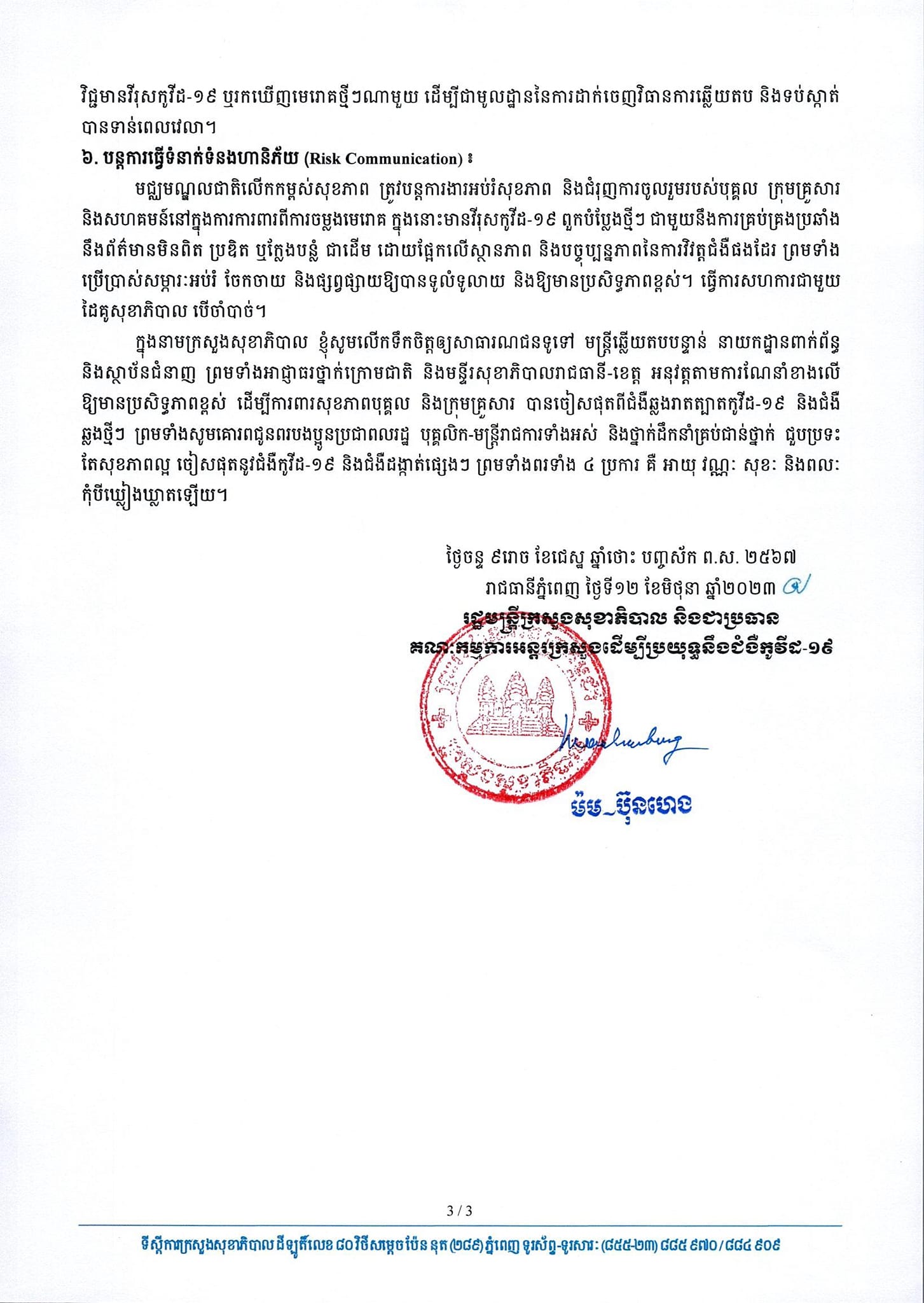 ក្រសួងសុខាភិបាល ណែនាំពីវិធានការសុខាភិបាលបន្តសម្រាប់ការឆ្លើយតបវិបត្តិកូវីដ-១៩ និងការត្រៀមលក្ខណៈសម្រាប់បង្ការការផ្ទុះឡើងនូវជំងឺឆ្លងថ្មីៗ ដែលអាចកើតមាននាពេលខាងមុខ