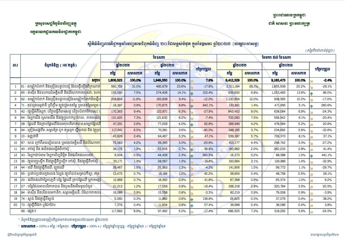 ទិន្នន័យដដែលនេះបានបង្ហាញថា ពីខែមករា ដល់ខែឧសភា ឆ្នាំ២០២៣ ការនាំចេញសម្លៀកបំពាក់ និងគ្រឿងបន្ទាប់បន្សំ ដែលធ្វើឡើងពីក្រណាត់ចាក់ដោយម្ជុលពីរ ឬមួយ មានតម្លៃ ១.៨ពាន់លានដុល្លារធ្លាក់ចុះ ២៦.១% និងការនាំចេញសម្លៀកបំពាក់ និងគ្រឿងបន្ទាប់បន្សំនៃសម្លៀកបំពាក់មិនធ្វើឡើងពីការចាក់ដោយម្ជុលពីរ ឬមួយមានតម្លៃ ៩៣៨លានដុល្លារ ធ្លាក់ចុះ១៧% ខណៈនាំចេញស្បែកជើងក្នុងរយៈពេល៥ខែនេះ ក្នុងទំហំទឹកប្រាក់ ៥៥៨លានដុល្លារ ធ្លាក់ចុះ២០.៤%។