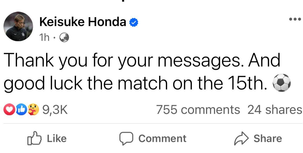 ទោះចប់ភារកិច្ចជាមួយក្រុមជម្រើសជាតិកម្ពុជាក៏ពិតមែន តែលោក Honda នៅតែតាមដាន និងគាំទ្រក្រុមជម្រើសជាតិកម្ពុជា ជាក់ស្ដែងព្រឹកនេះលោកបានបង្ហោះសារមួយថា «សូមអរគុណចំពោះសាររបស់អ្នក ហើយសូមជូនពរសំណាងល្អសម្រាប់ការប្រកួតនៅថ្ងៃទី១៥»។