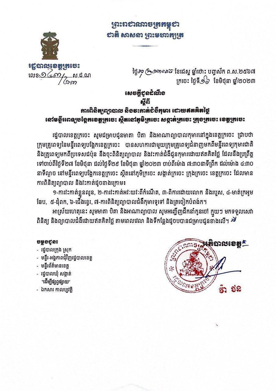 (ក្រចេះ)៖ រដ្ឋបាលខេត្តក្រចេះ នៅថ្ងៃទី១៦ ខែមិថុនា ឆ្នាំ២០២៣ បានចេញសេចក្ដីជូនដំណឹងដល់ប្រជាពលរដ្ឋ ក៏ដូចជាមាតា បិតាអាណាព្យាបាលកុមារទាំងអស់ថា ក្រុមគ្រូពេទ្យ នៃមន្ទីរពេទ្យបង្អែកខេត្តក្រចេះ សហការជាមួយគ្រូពេទ្យមន្ទីរពេទ្យកុមារជាតិ និងគ្រូពេទ្យជំនាញមកពីប្រទេសជប៉ុន នឹងចុះពិនិត្យ ព្យាបាល និងវះកាត់ជំងឺជូនកុមារដោយឥតគិតថ្លៃ។
