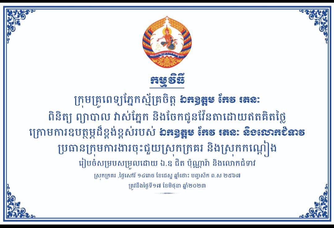 ក្រុមគ្រូពេទ្យភ្នែកស្ម័គ្រចិត្ត លោក កែវ រតនៈ បន្តចុះពិនិត្យ ព្យាបាល វាស់ភ្នែក និងចែកជូនវ៉ែនតា ដោយឥតគិតថ្លៃ ជូនប្រជាពលរដ្ឋ ក្នុងស្រុកក្រគរបានជាង២ពាន់នាក់