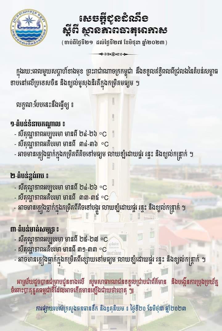(ភ្នំពេញ)៖ ក្រសួងធនធានទឹក និងឧតុនិយម បានចេញសេចក្តីជូនដំណឹង ស្ដីពី ស្ថានភាពធាតុអាកាស ចាប់ពីថ្ងៃទី២១ ដល់ថ្ងៃទី២៧ ខែមិថុនា ឆ្នាំ២០២៣។