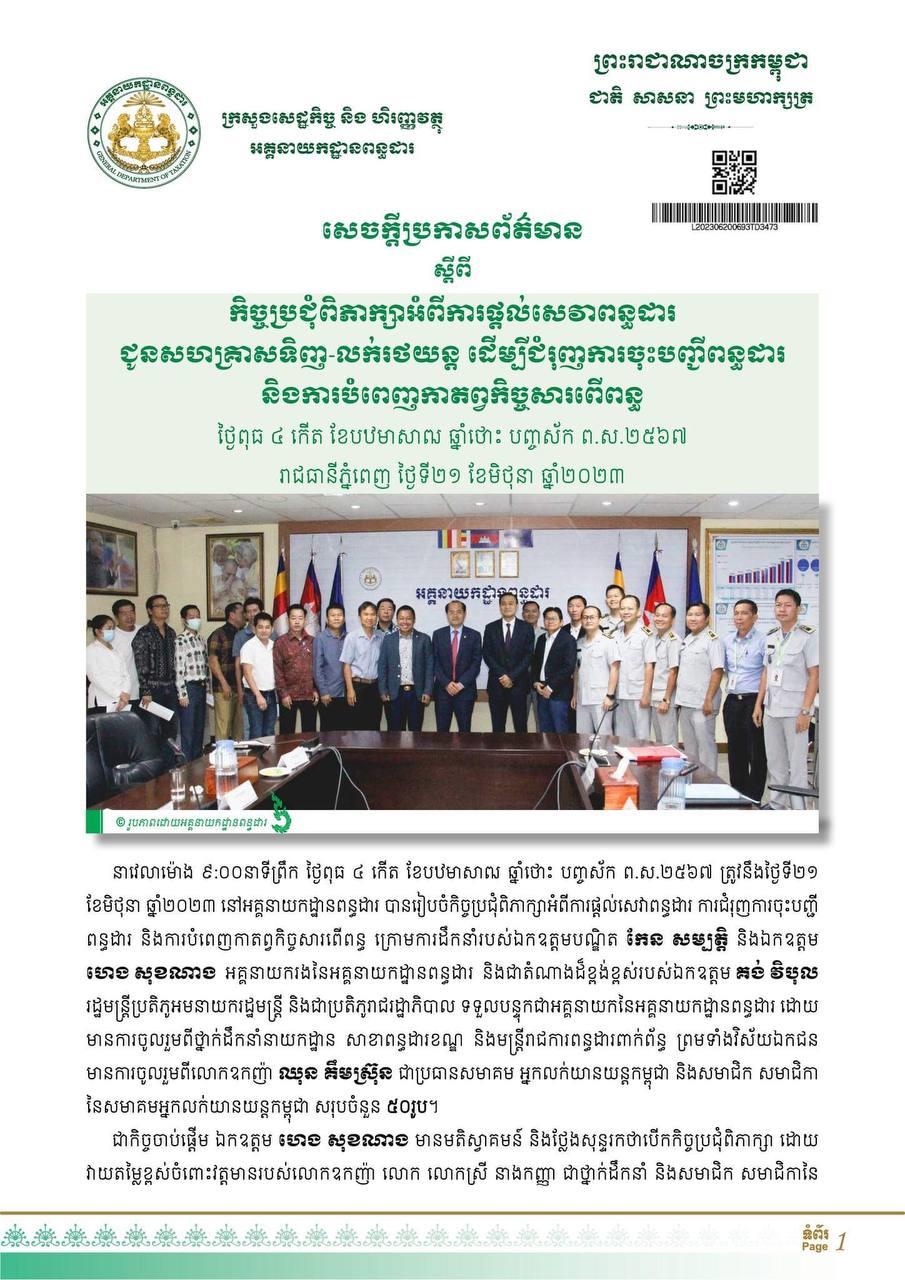 ការជំរុញរបស់លោកបណ្ឌិត កែន សម្បត្តិ ធ្វើឡើងក្នុងកម្មវិធីកិច្ចប្រជុំពិភាក្សាអំពីការផ្តល់សេវាពន្ធដារ ជូនសហគ្រាសទិញ-លក់រថយន្ត ដើម្បីជំរុញការចុះបញ្ជីពន្ធដារ និងការបំពេញកាតព្វកិច្ចសារពើពន្ធ នៅថ្ងៃទី២១ ខែមិថុនា ឆ្នាំ២០២៣។