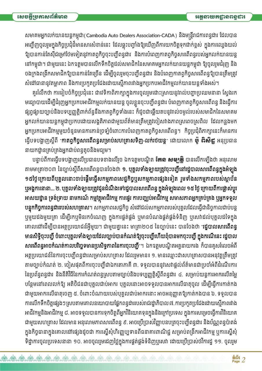 លោកសូមលើកលើកទឹកចិត្ត ដល់សមាជិកនៃសមាគមអ្នកលក់យានយន្តកម្ពុជា ឱ្យចូលរួមជំរុញ និងចងក្រងពង្រីកសមាជិកឱ្យបានកាន់តែច្រើន ដើម្បីចូលរួមចុះបញ្ជីពន្ធដារ និងបំពេញកាតព្វកិច្ចសារពើពន្ធឱ្យបានត្រឹមត្រូវ សំដៅធានានូវតម្លាភាព និងការប្រកួតប្រជែងដោយស្មើភាព រវាងអ្នកប្រកបអាជីវកម្មលក់យានយន្តទាំងអស់៕ ផ្តល់សិទ្ធិដោយ៖ freshnews