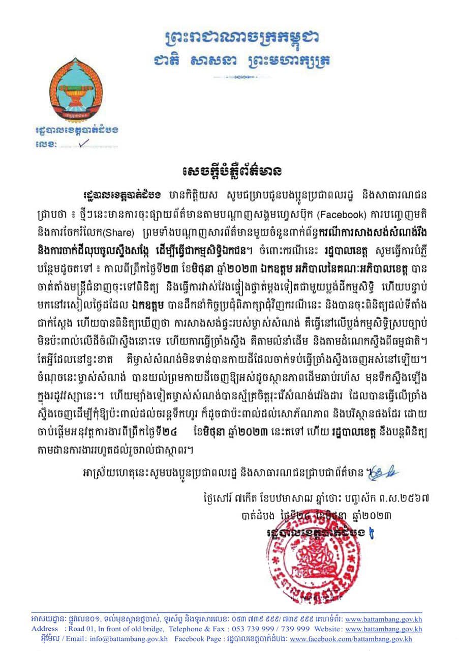 រដ្ឋបាលខេត្តបាត់ដំបង បានចេញសេចក្ដីបំភ្លឺព័ត៌មានជុំវិញបញ្ហាពាក់ព័ន្ធករណី ការសាងសង់សំណង់រឹង និងការចាក់ដីលុបចូលស្ទឹងសង្កែ