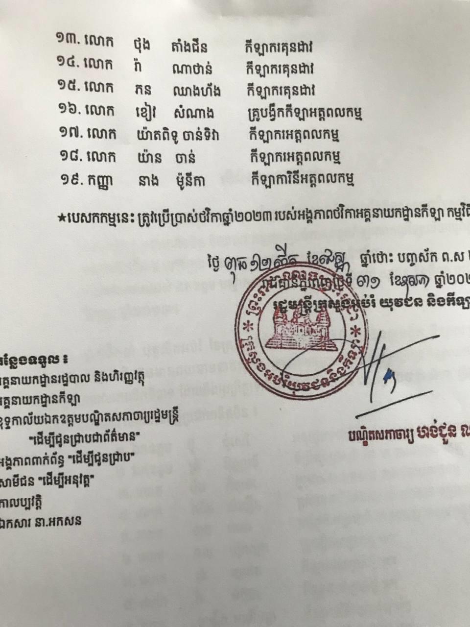 បេសកកម្មខាងលើ គឺមានប្រតិភូ គ្រូបង្វឹក និងកីឡាករ-កីឡាការិនីសរុប ១៩នាក់ ក្រោមការដឹកនាំរបស់លោក ប៊ូ ជុំសេរី អនុរដ្ឋលេខាធិការក្រសួងអប់រំ យុវជន និងកីឡា និងជាប្រធានប្រតិភូ ។ សម្រាប់កីឡាអត្តពលកម្ម គឺមានគ្រូបង្វឹកម្នាក់ និងកីឡាករ-កីឡាការិនី ៣នាក់, កីឡាតេក្វាន់ដូ WT មានគ្រូបង្វឹកម្នាក់ និងកីឡាករ-កីឡាការិនី ៤នាក់ និងកីឡាគុនដាវ មានគ្រូបង្វឹកម្នាក់ និងកីឡាករ ៤នាក់ ។