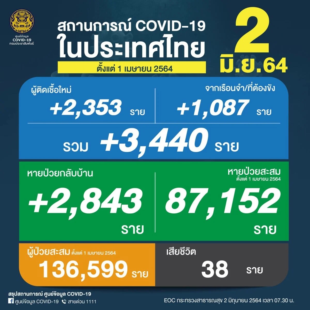 ថៃ៖ យោងតាមការចុះផ្សាយនៅក្នុងសារព័ត៌មាន បាងកកប៉ុស្តិ៍ បានឲ្យដឹងថា នៅក្នុងថ្ងៃពុធ ទី២ ខែ មិថុនានេះ អាជ្ញាធរសុខាភិបាលនៃប្រទេសថៃបានរកឃើញអ្នកឆ្លងជំងឺកូវីដ ១៩ ថ្មីចំនួន ៣,៤៤០នាក់ រីឯអ្នកស្លាប់ដោយសារជំងឺកូវីដ ១៩ វិញគឺមានចំនួន ៣៨នាក់។