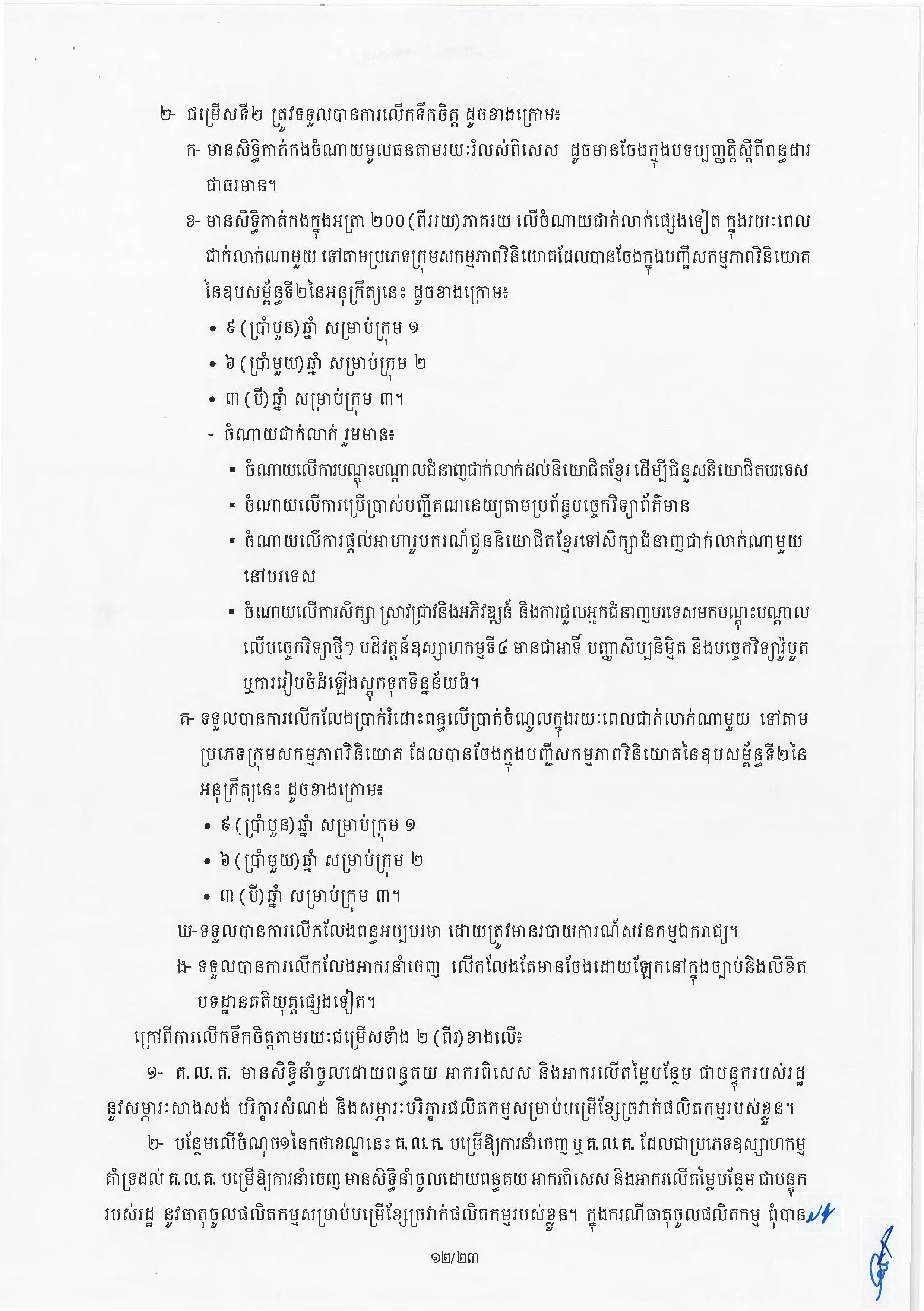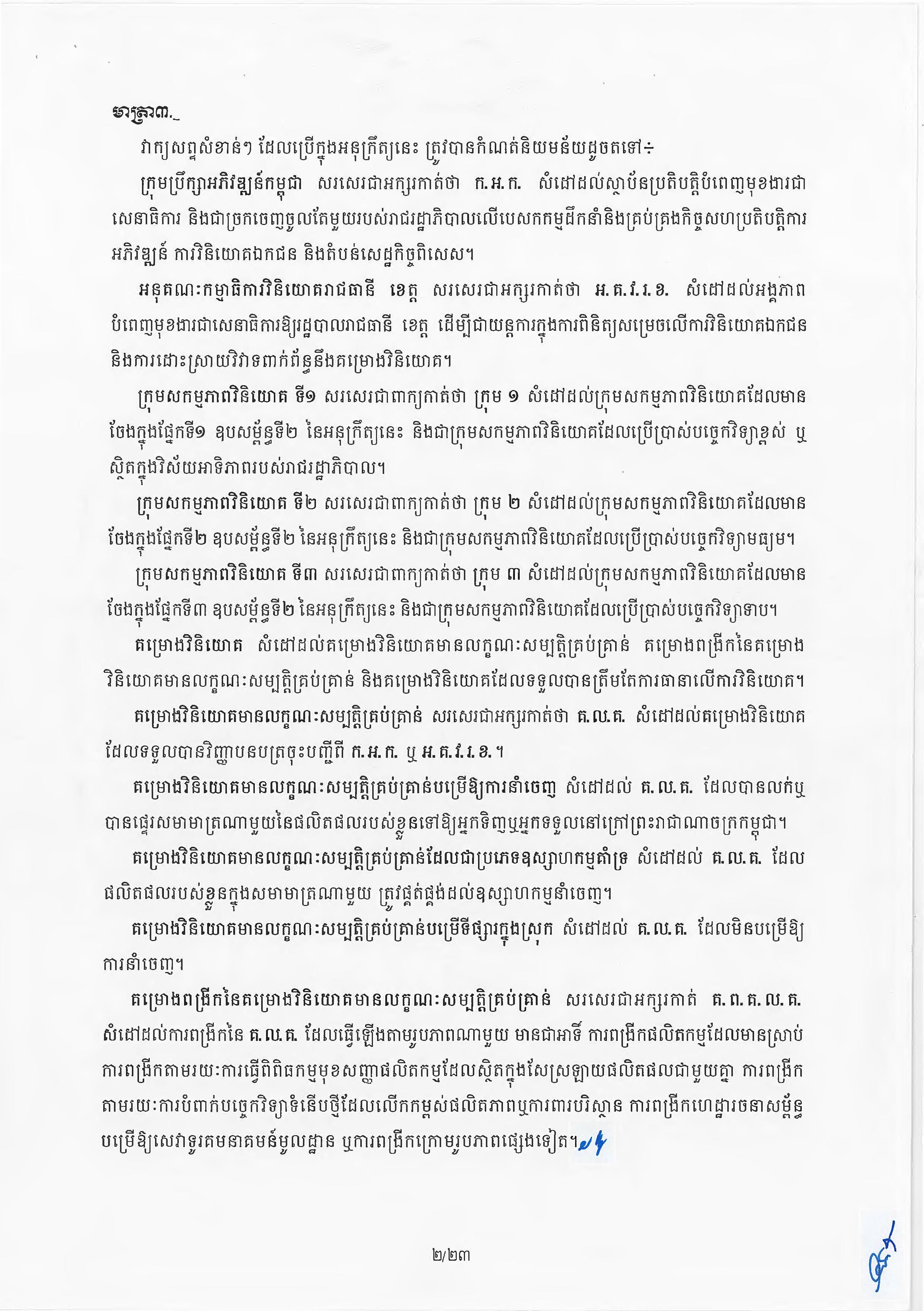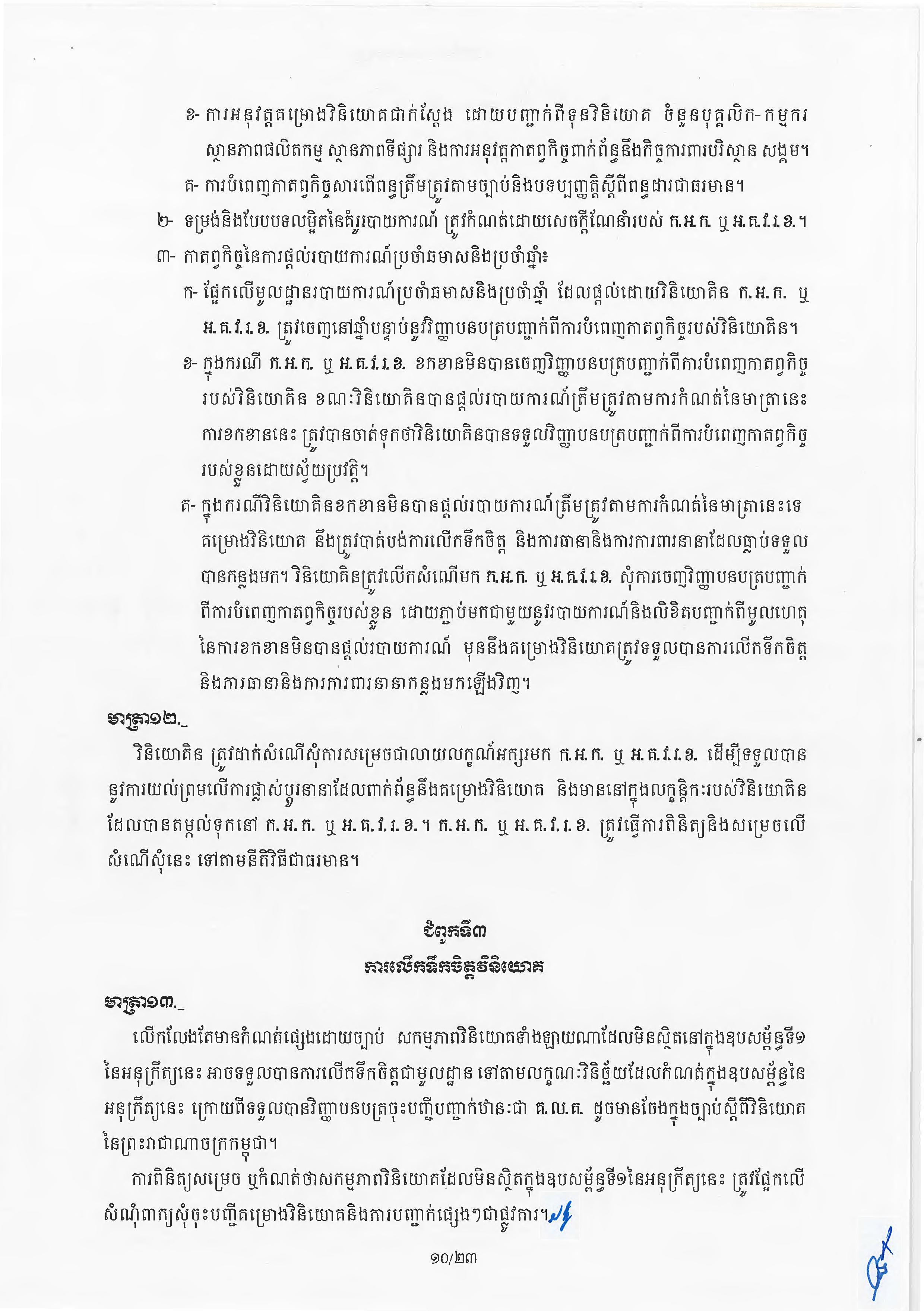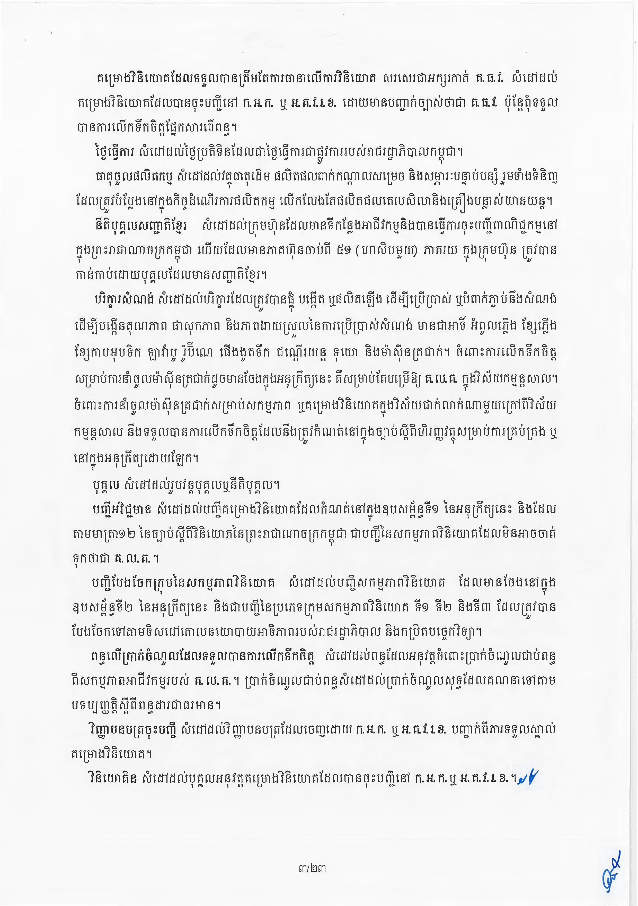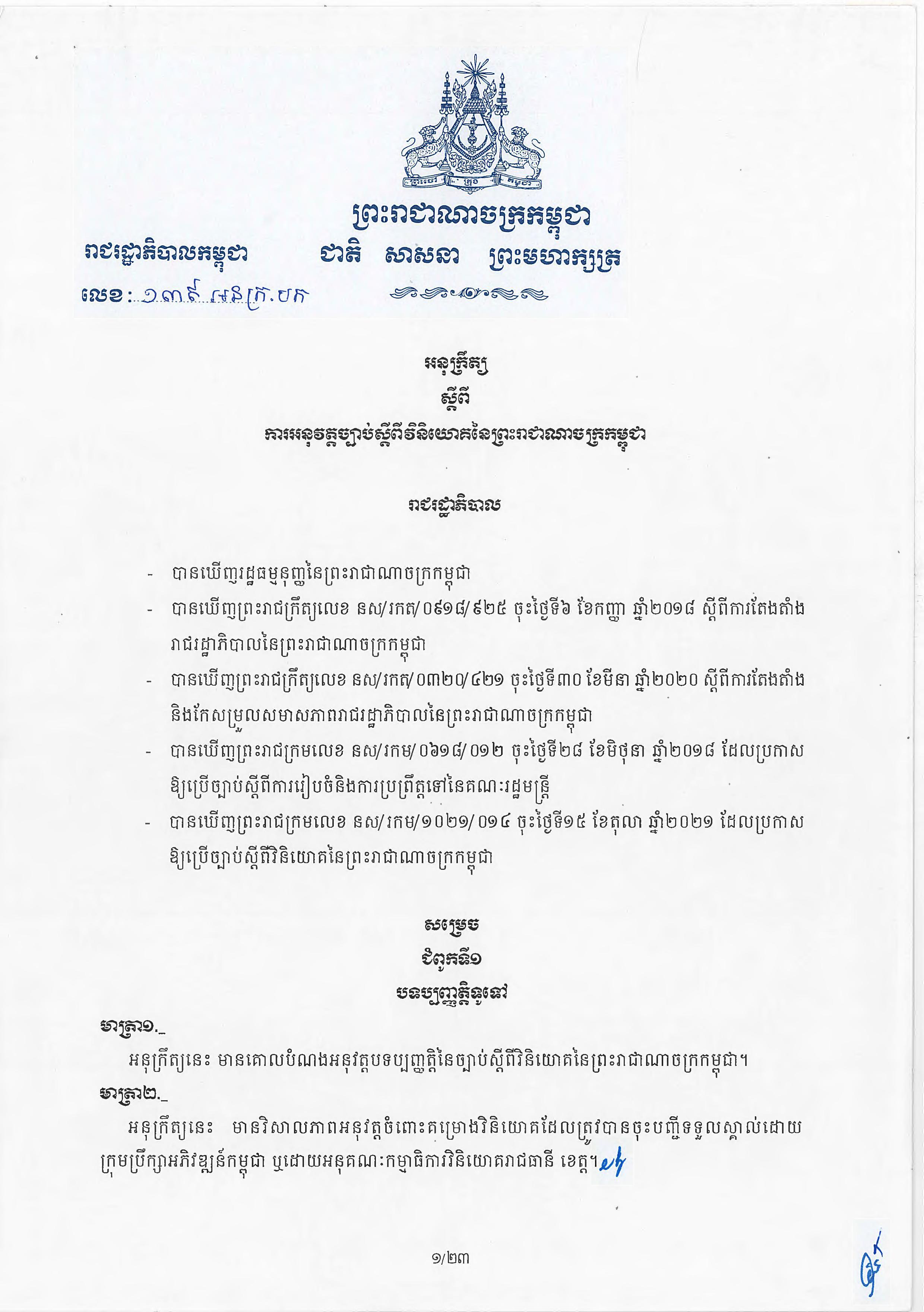 (ភ្នំពេញ)៖ សម្តេចតេជោ ហ៊ុន សែន នាយករដ្ឋមន្ត្រីនៃកម្ពុជា បានចេញអនុក្រឹត្យស្តីពីការអនុវត្ត ច្បាប់ស្តីពីការវិនិយោគនៅព្រះរាជាណាចក្រកម្ពុជា។ នេះបើតាមអនុក្រឹត្យដែលបណ្តាញព័ត៌មាន Fresh News ទទួលបាននៅថ្ងៃទី២៧ ខែមិថុនា ឆ្នាំ២០២៣នេះ៕