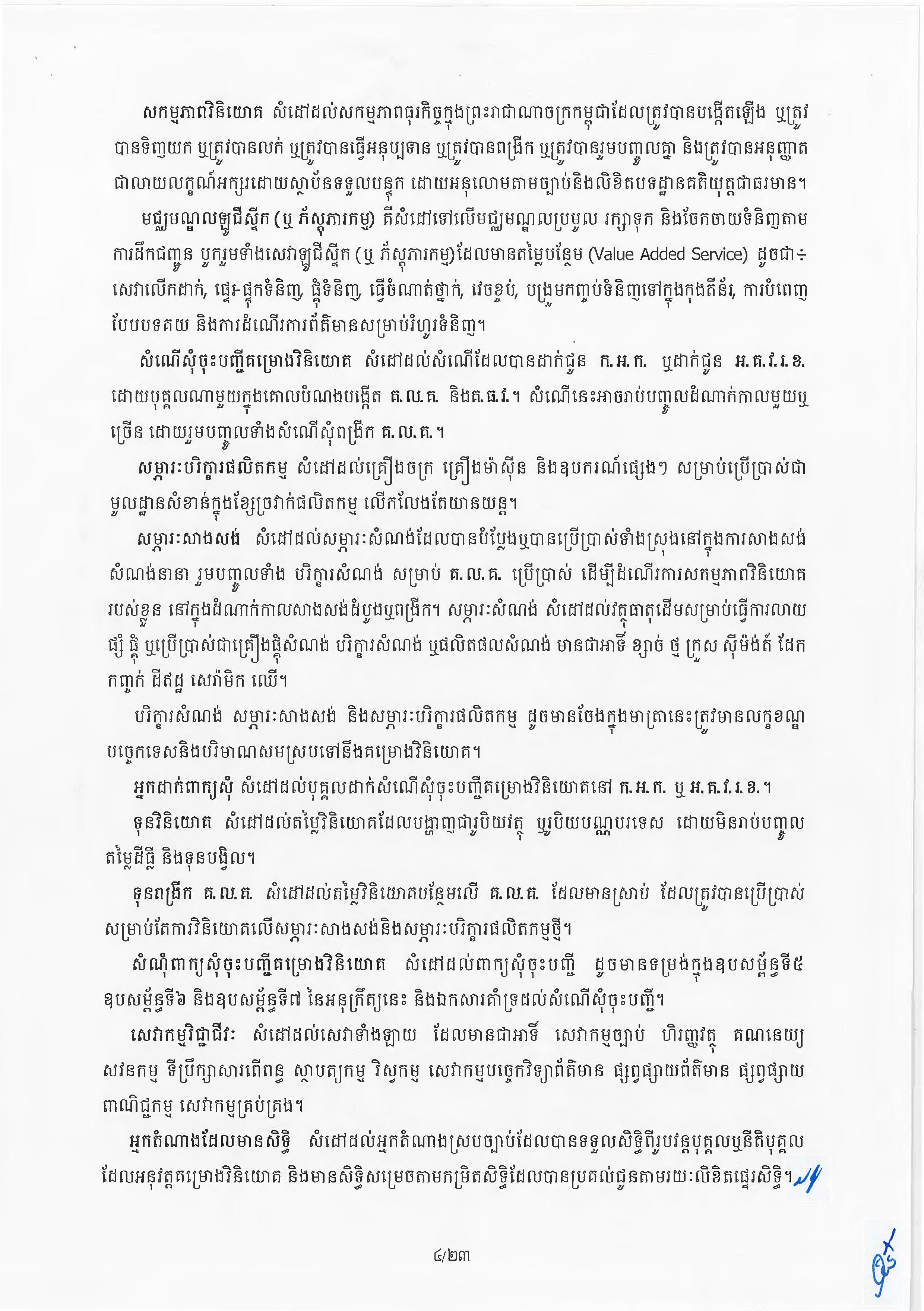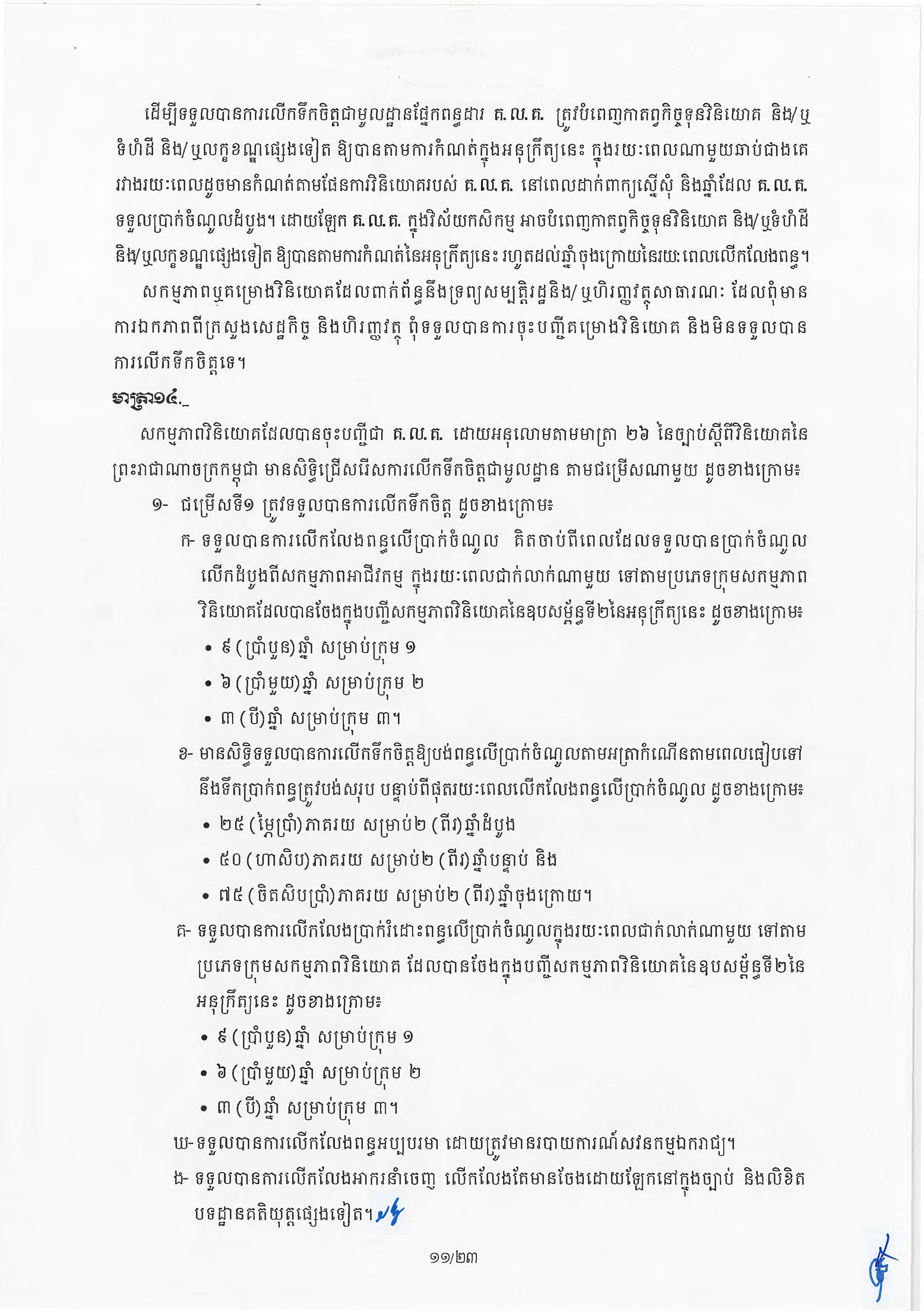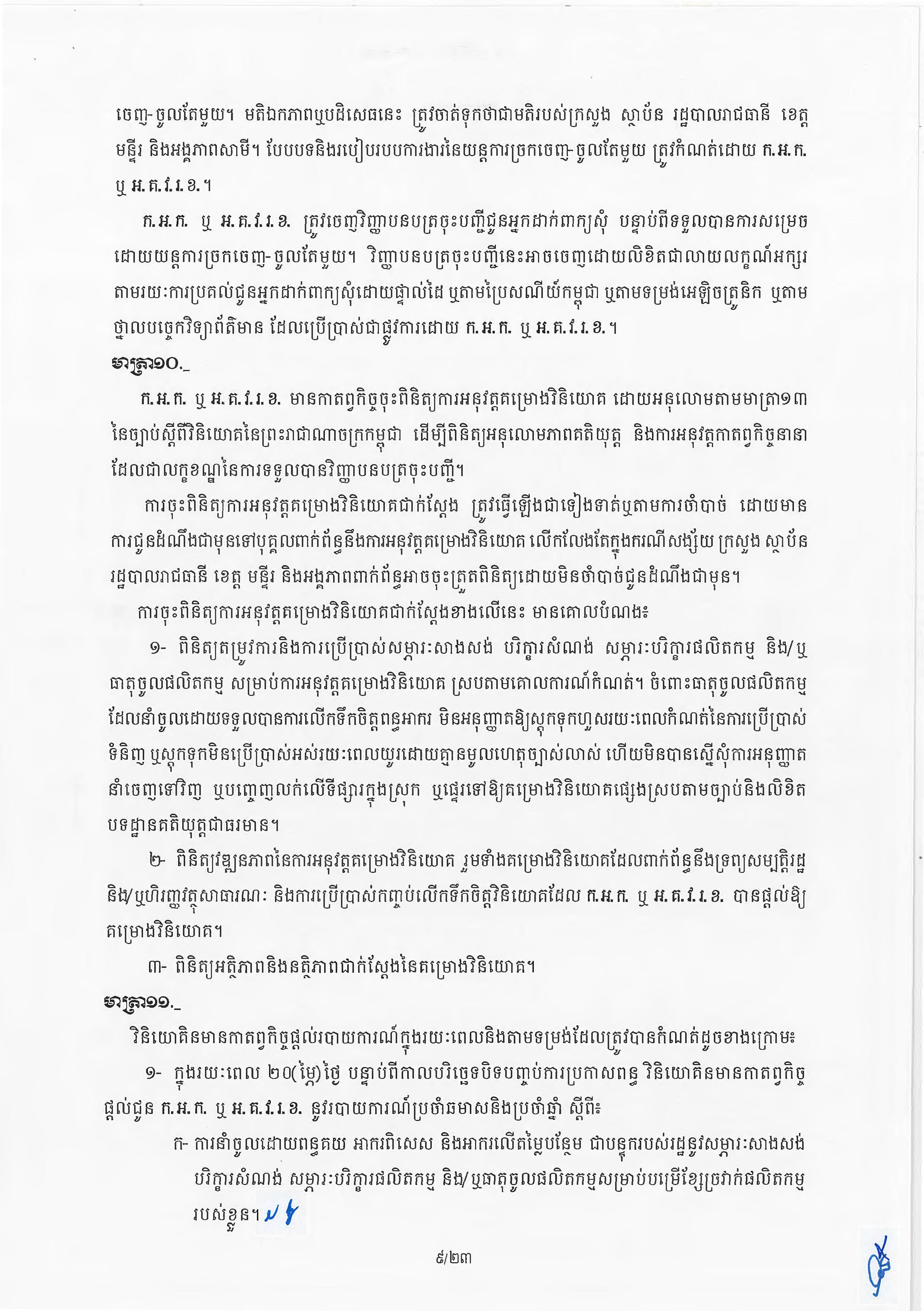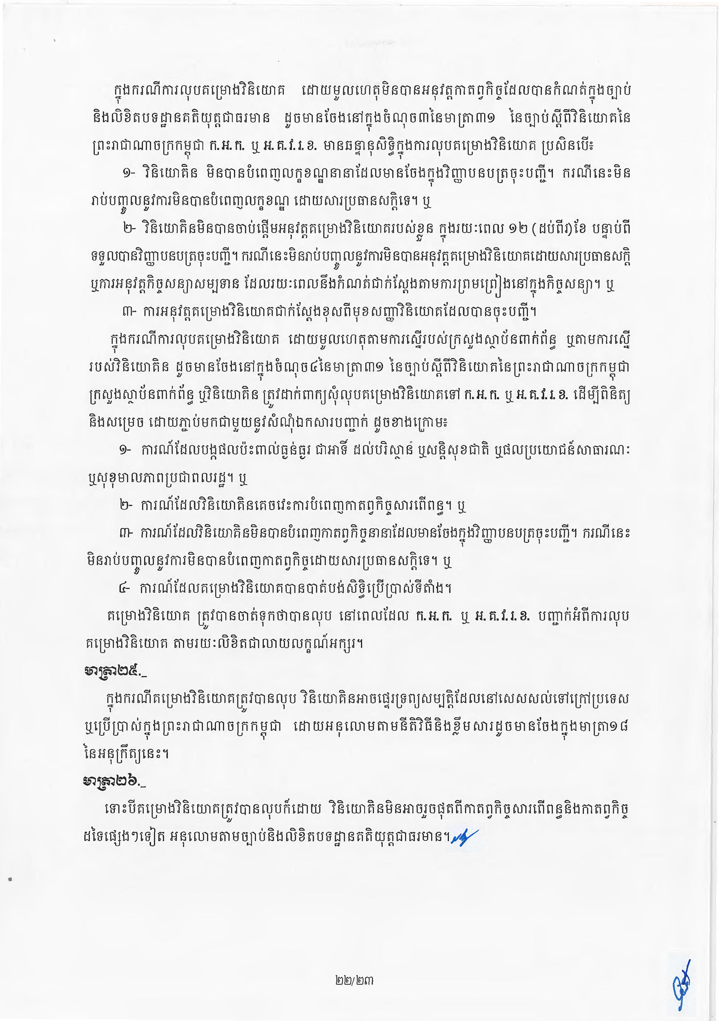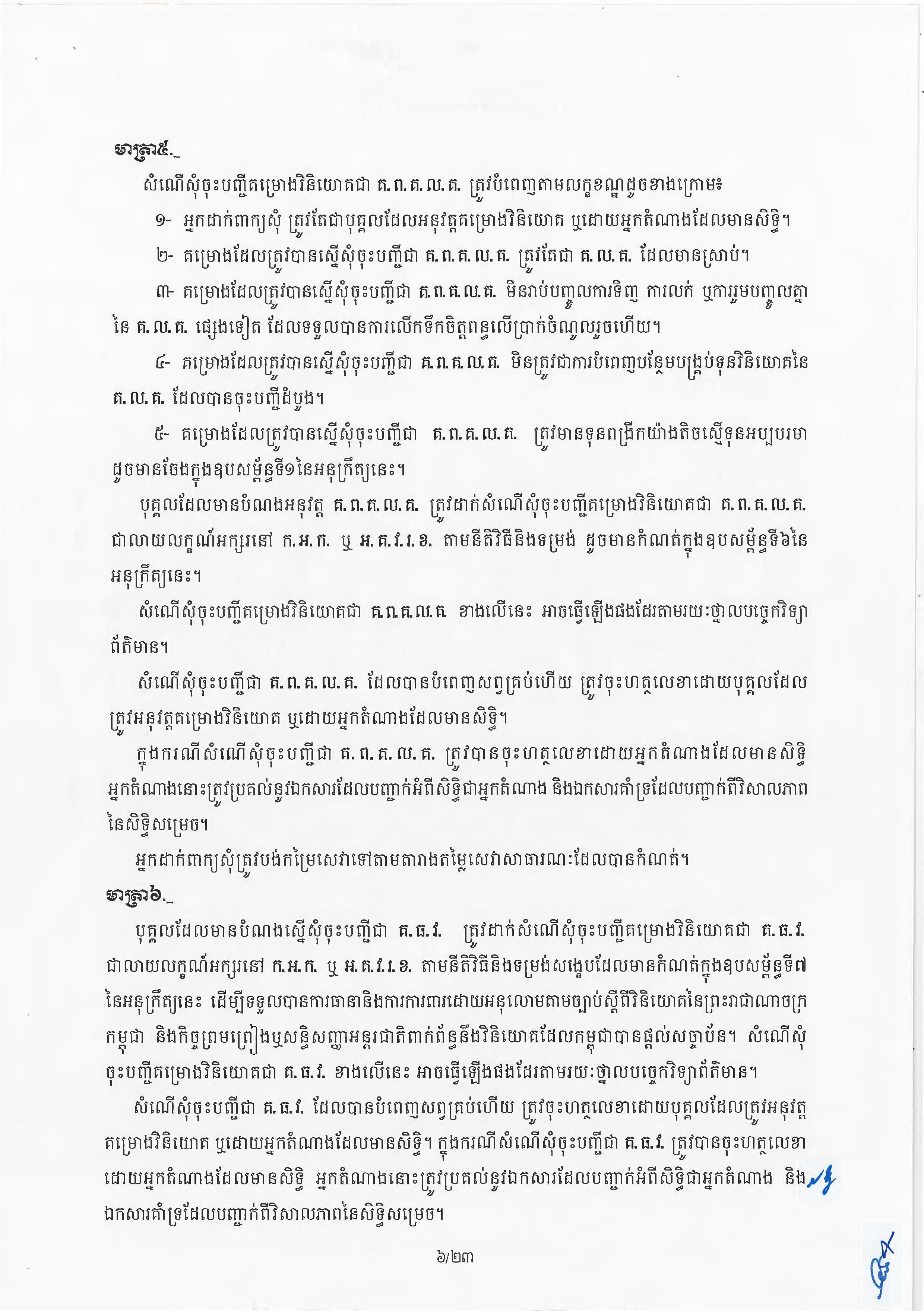 (ភ្នំពេញ)៖ សម្តេចតេជោ ហ៊ុន សែន នាយករដ្ឋមន្ត្រីនៃកម្ពុជា បានចេញអនុក្រឹត្យស្តីពីការអនុវត្ត ច្បាប់ស្តីពីការវិនិយោគនៅព្រះរាជាណាចក្រកម្ពុជា។ នេះបើតាមអនុក្រឹត្យដែលបណ្តាញព័ត៌មាន Fresh News ទទួលបាននៅថ្ងៃទី២៧ ខែមិថុនា ឆ្នាំ២០២៣នេះ៕
