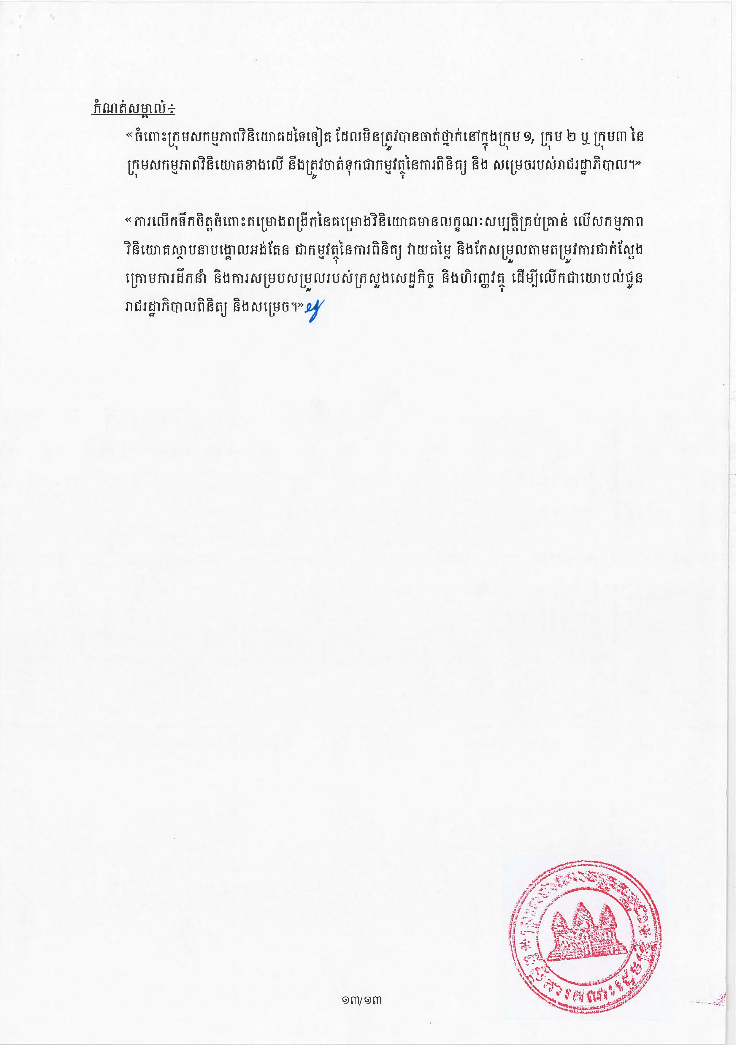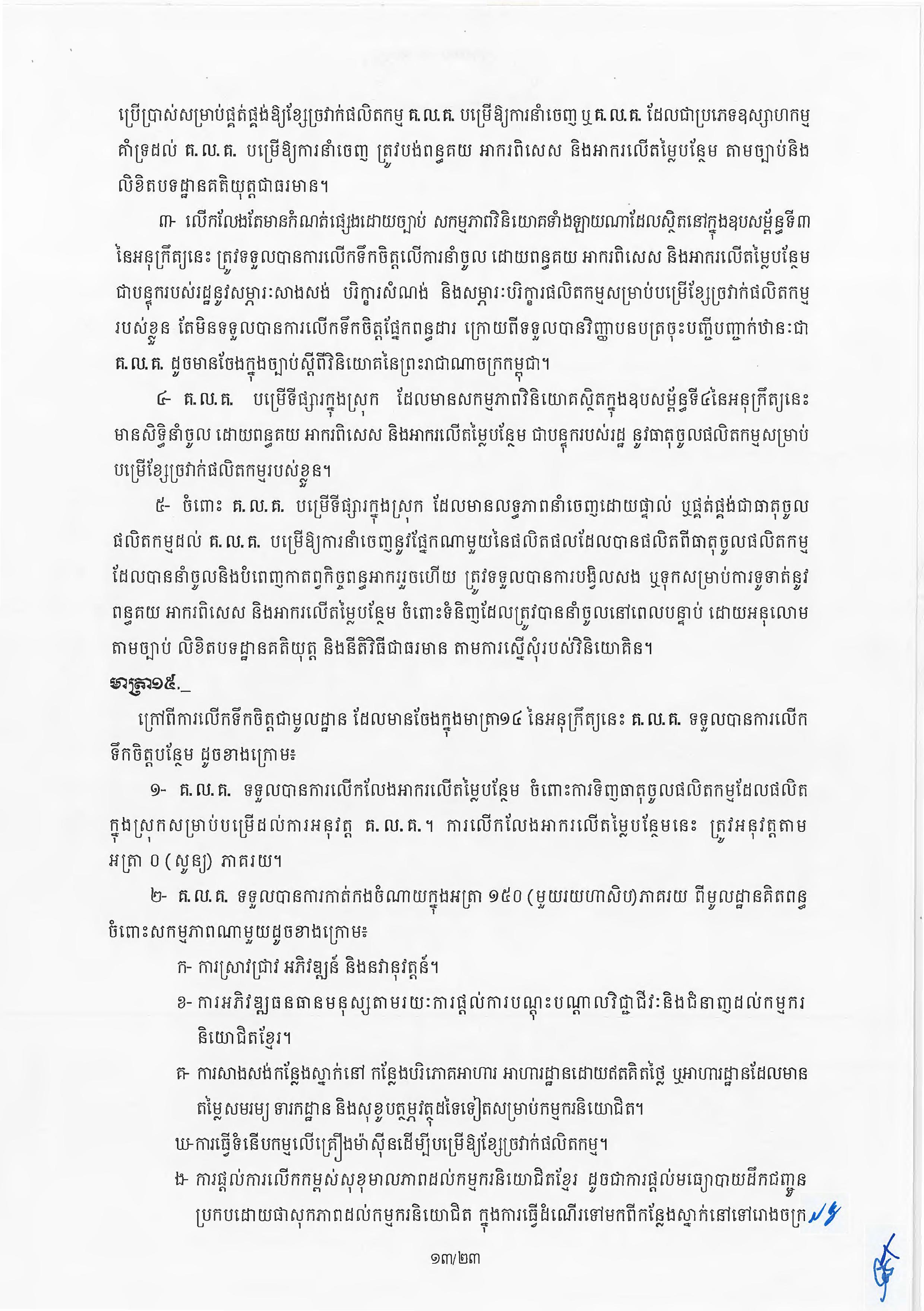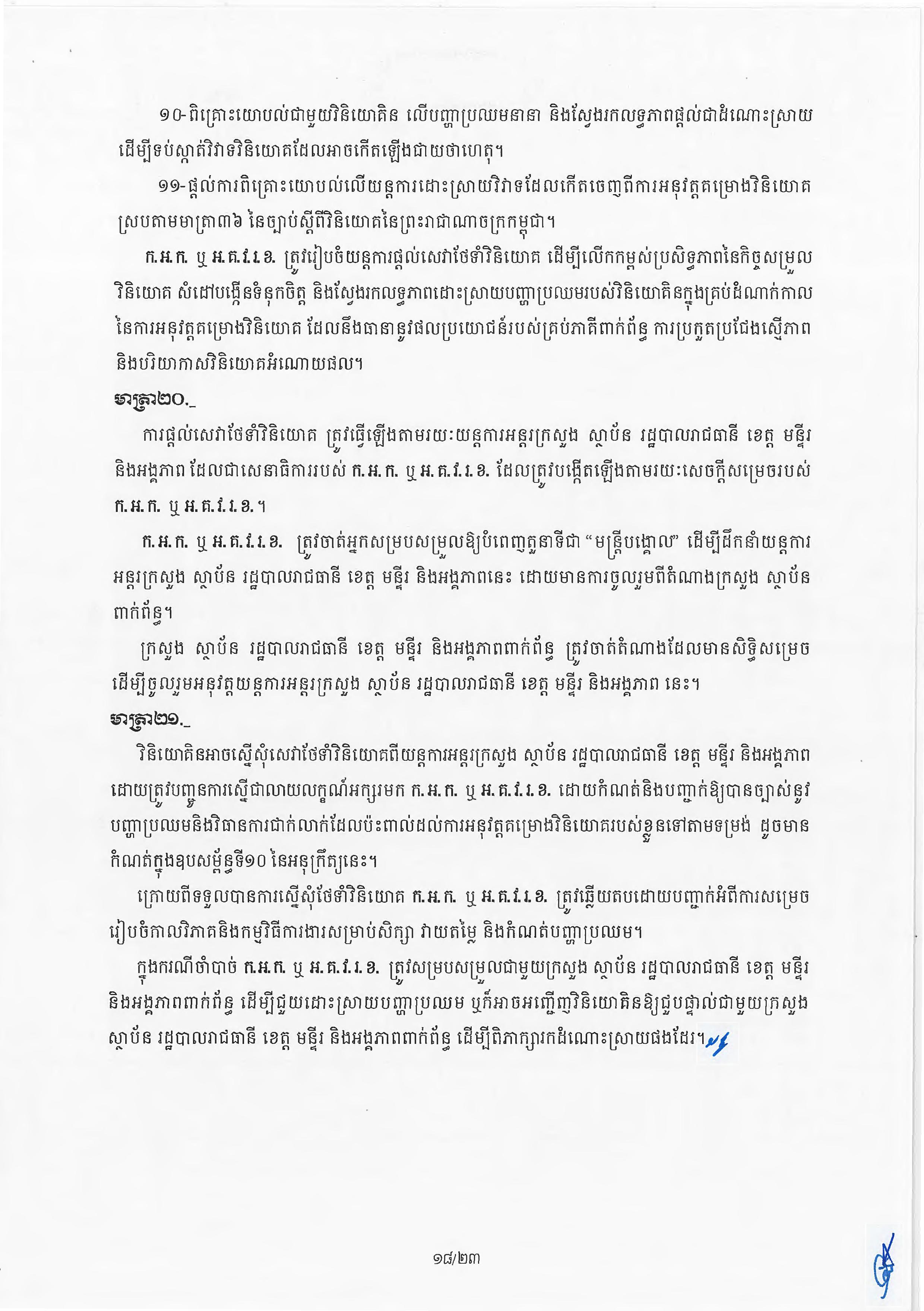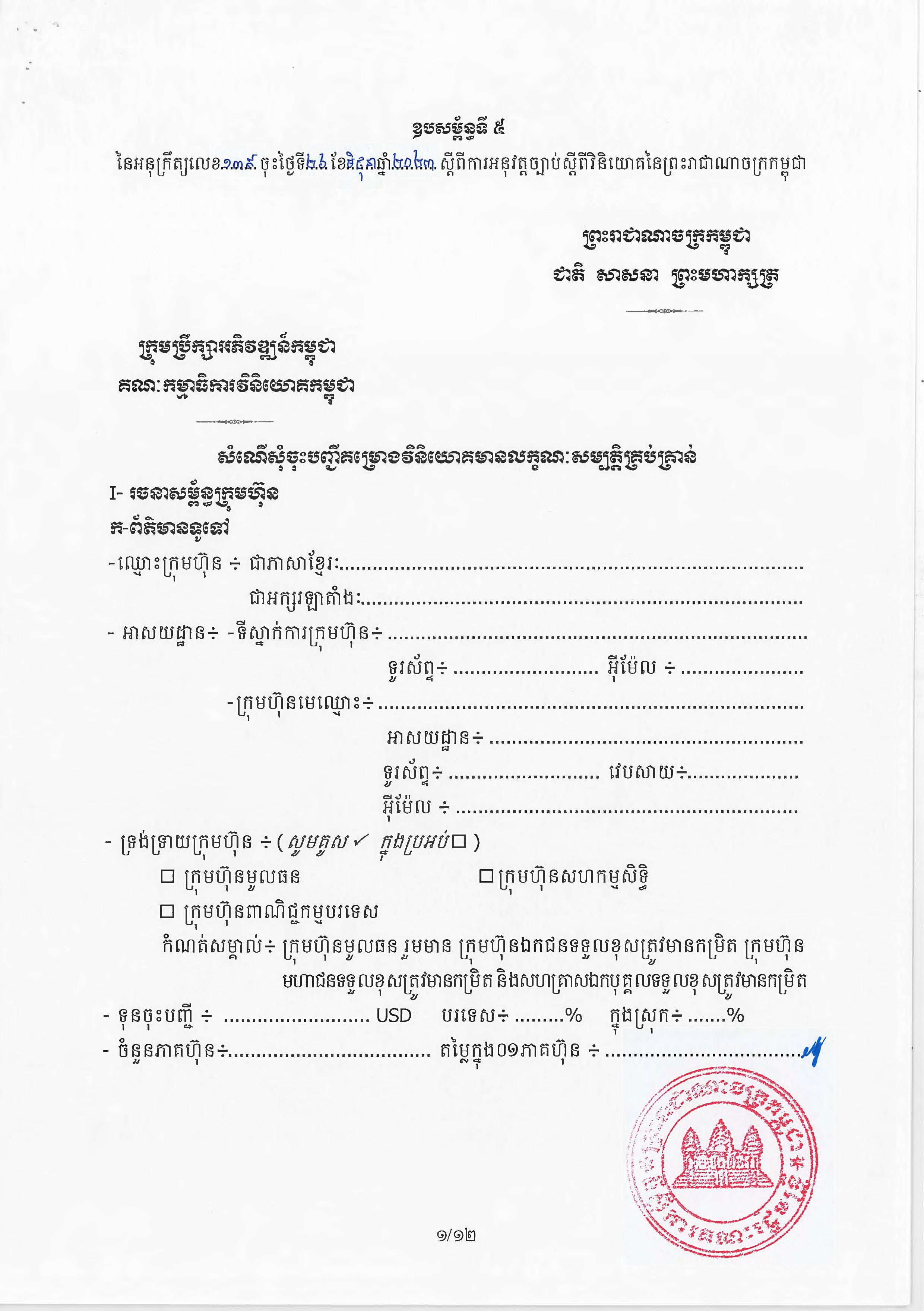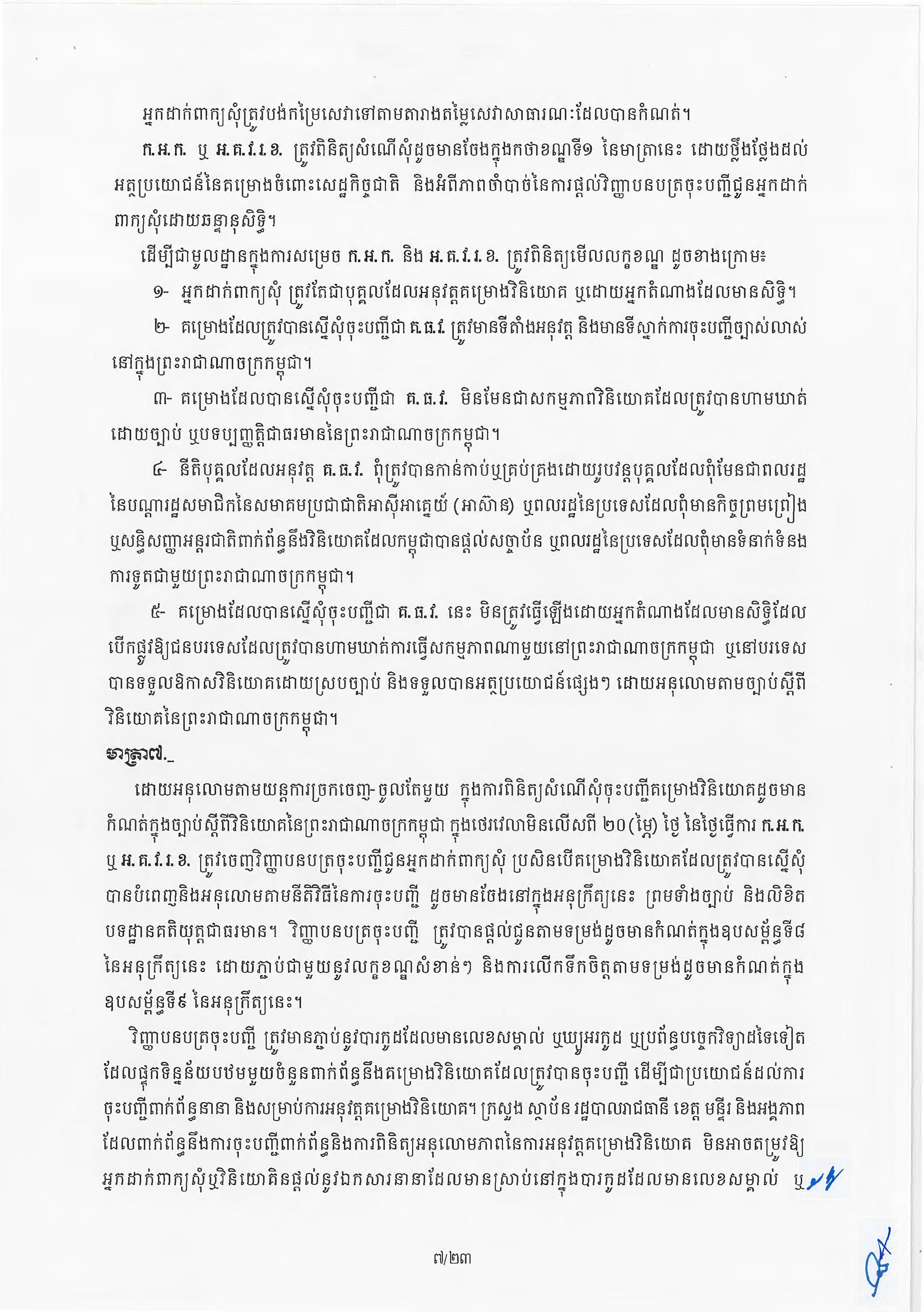 (ភ្នំពេញ)៖ សម្តេចតេជោ ហ៊ុន សែន នាយករដ្ឋមន្ត្រីនៃកម្ពុជា បានចេញអនុក្រឹត្យស្តីពីការអនុវត្ត ច្បាប់ស្តីពីការវិនិយោគនៅព្រះរាជាណាចក្រកម្ពុជា។ នេះបើតាមអនុក្រឹត្យដែលបណ្តាញព័ត៌មាន Fresh News ទទួលបាននៅថ្ងៃទី២៧ ខែមិថុនា ឆ្នាំ២០២៣នេះ៕