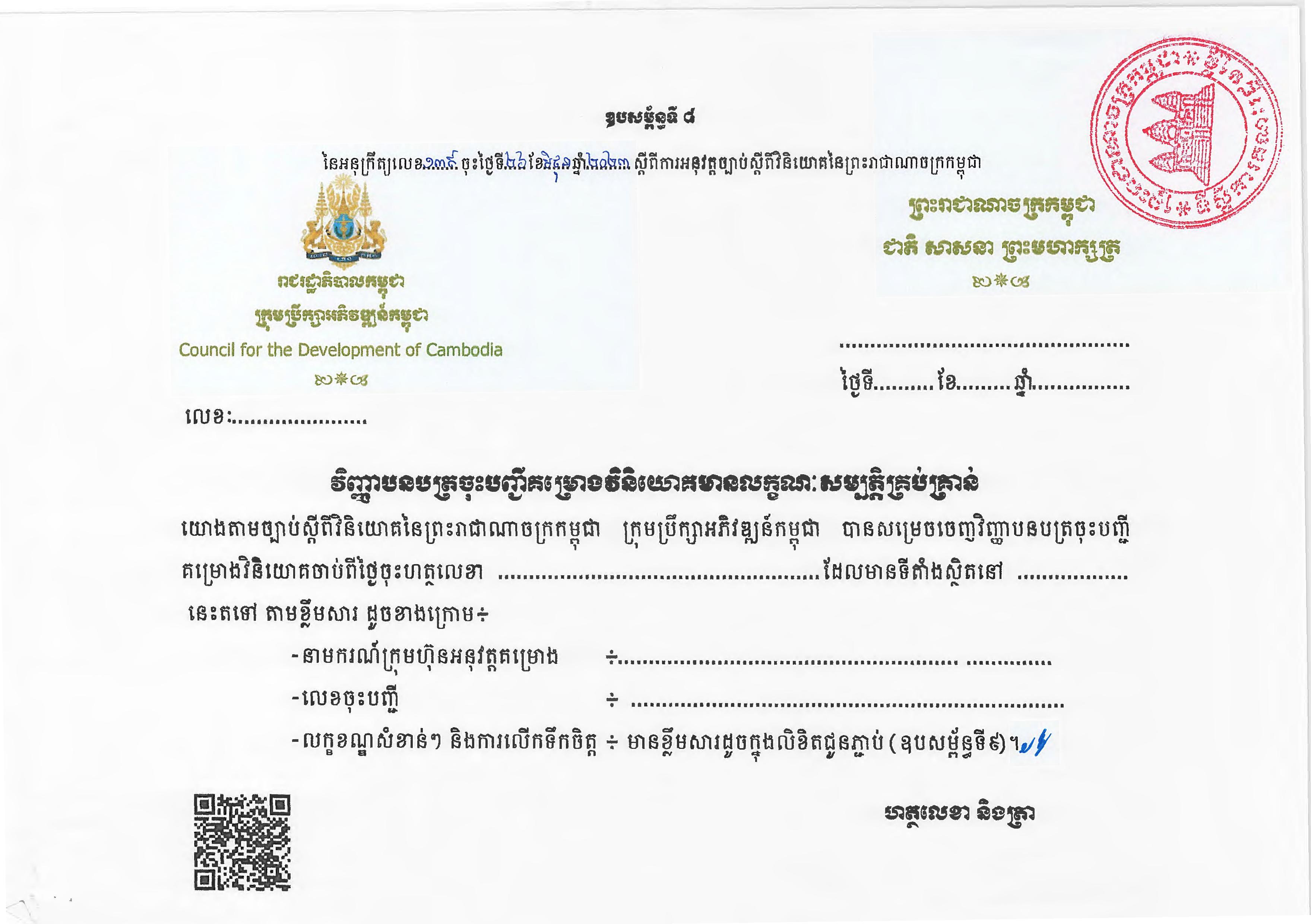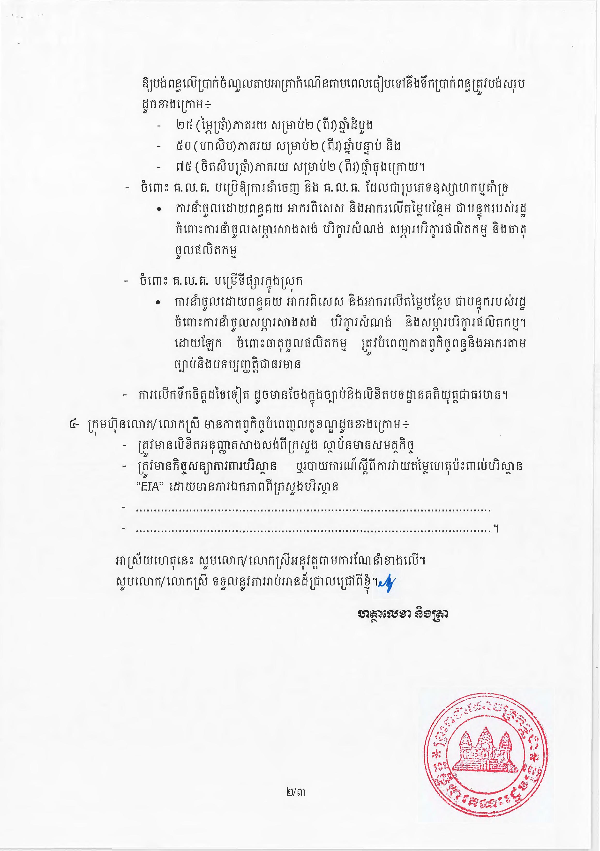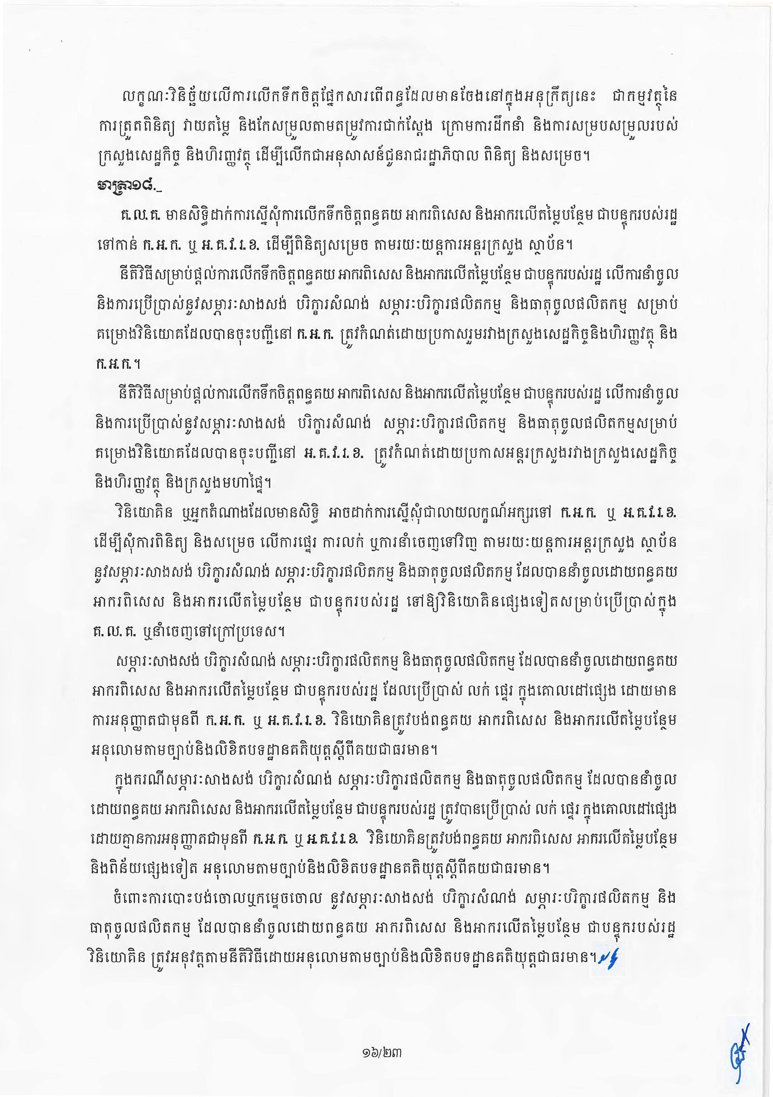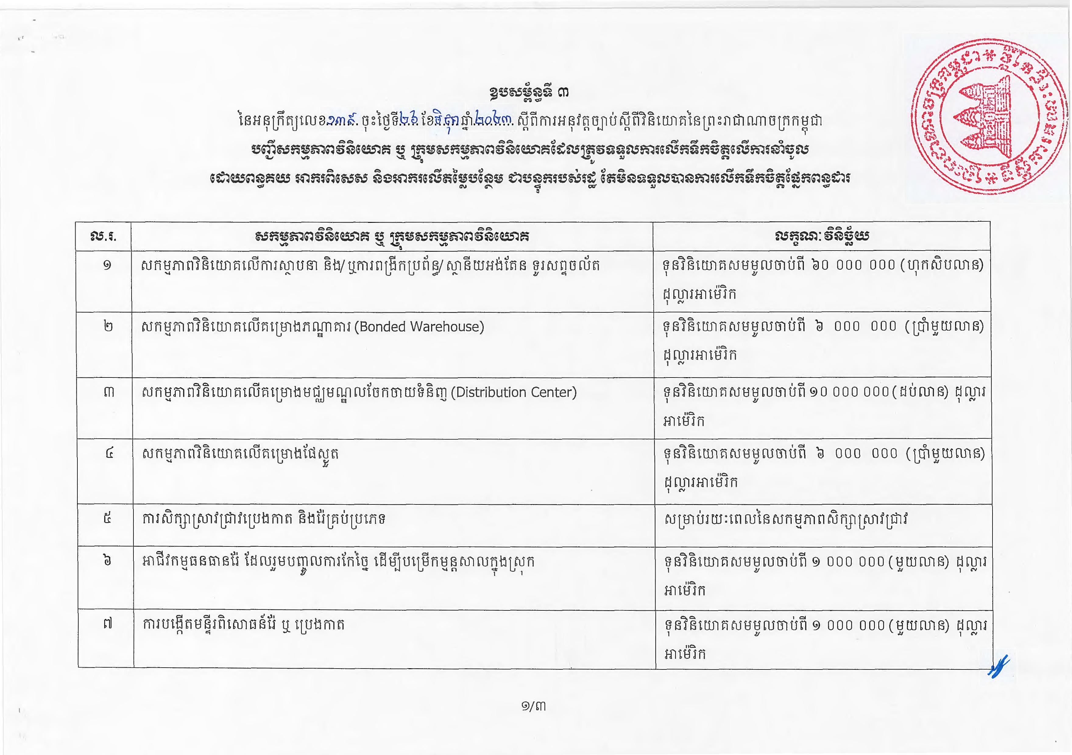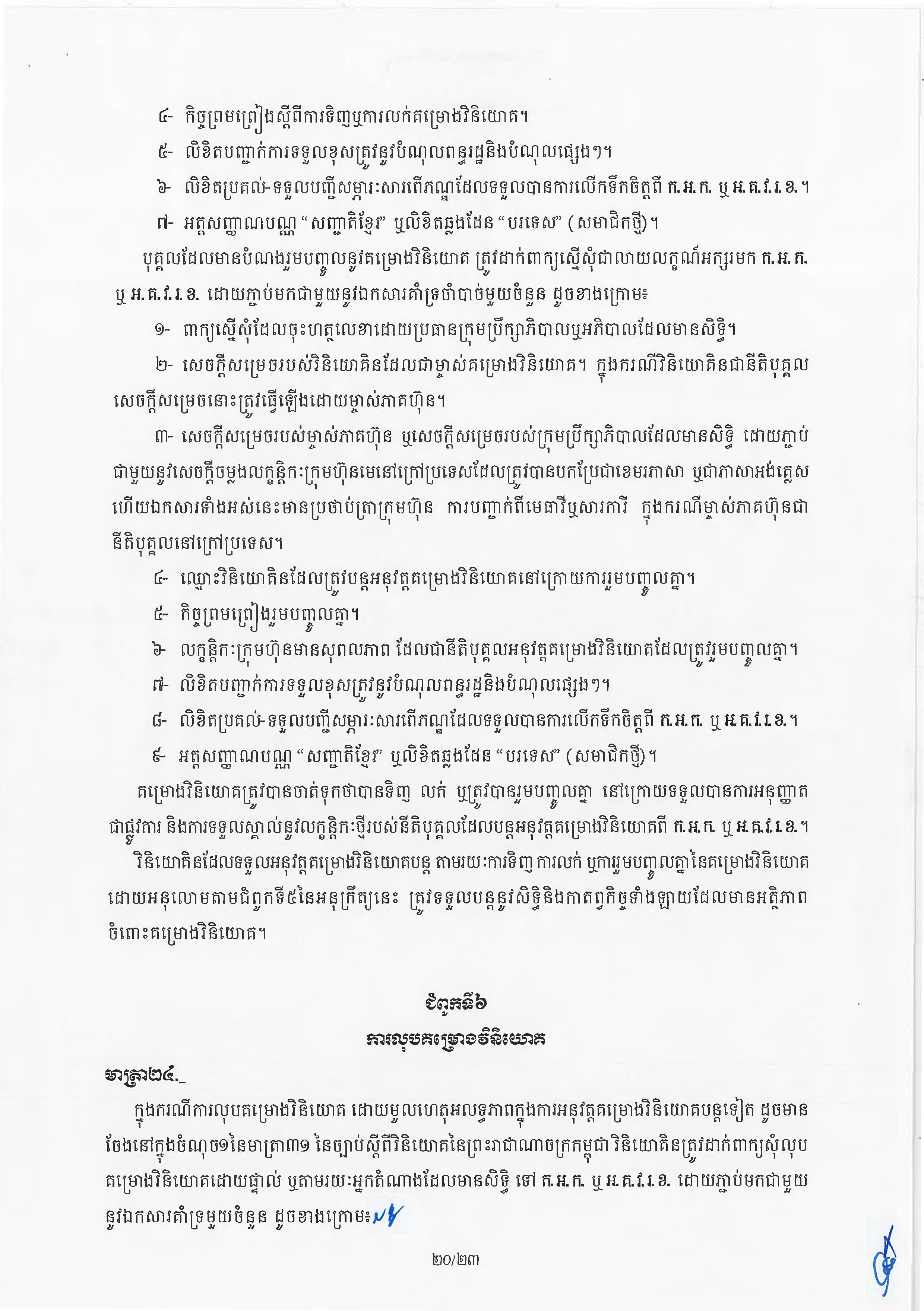 (ភ្នំពេញ)៖ សម្តេចតេជោ ហ៊ុន សែន នាយករដ្ឋមន្ត្រីនៃកម្ពុជា បានចេញអនុក្រឹត្យស្តីពីការអនុវត្ត ច្បាប់ស្តីពីការវិនិយោគនៅព្រះរាជាណាចក្រកម្ពុជា។ នេះបើតាមអនុក្រឹត្យដែលបណ្តាញព័ត៌មាន Fresh News ទទួលបាននៅថ្ងៃទី២៧ ខែមិថុនា ឆ្នាំ២០២៣នេះ៕