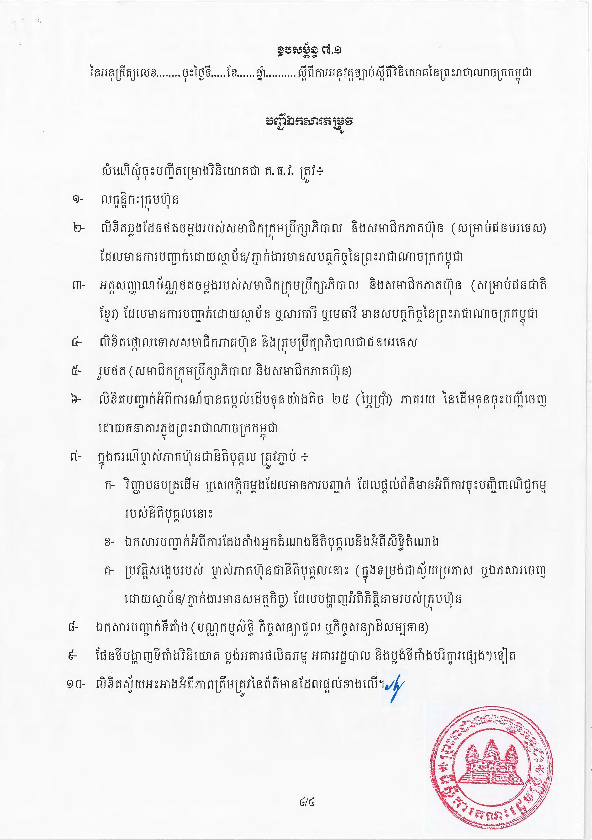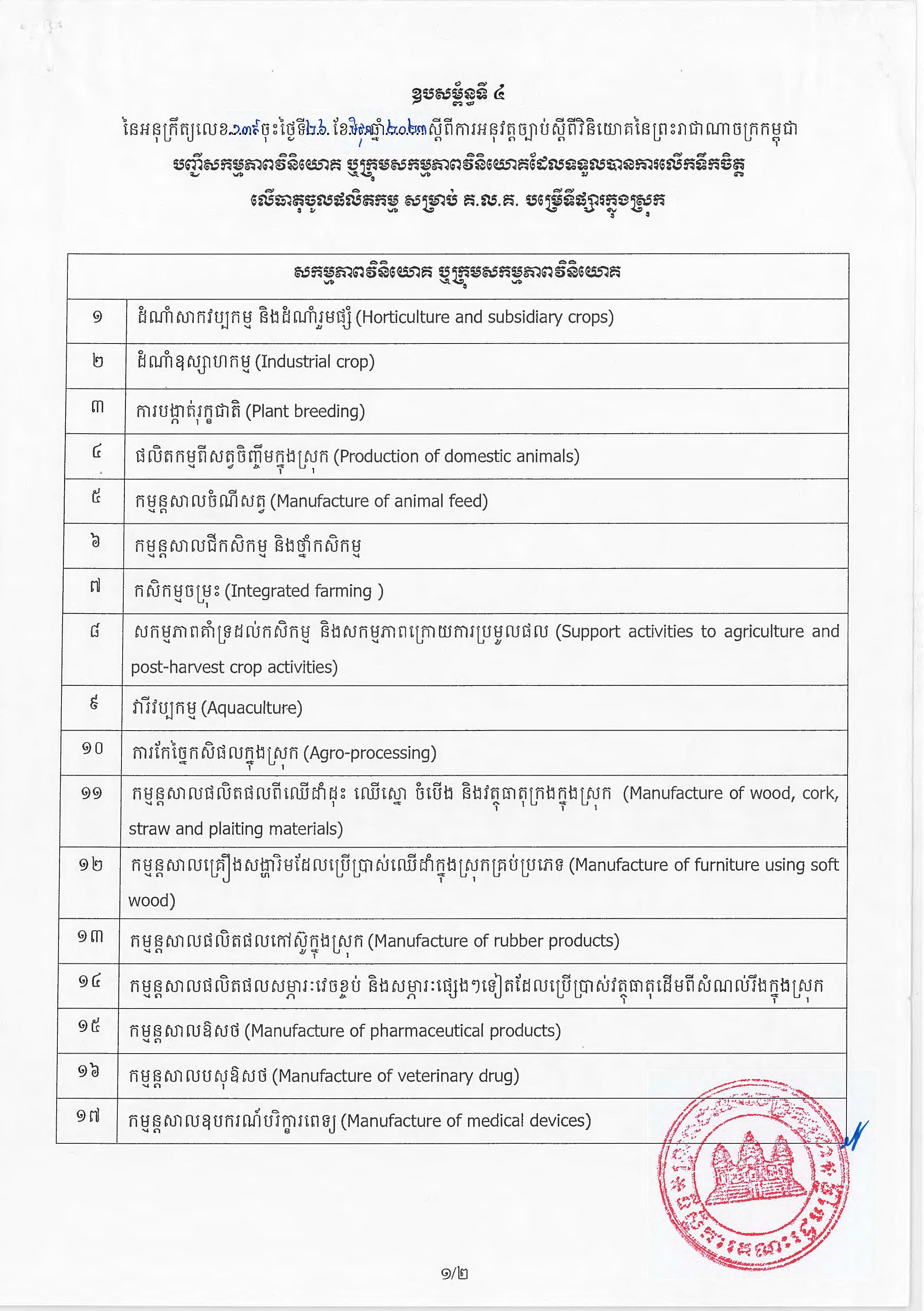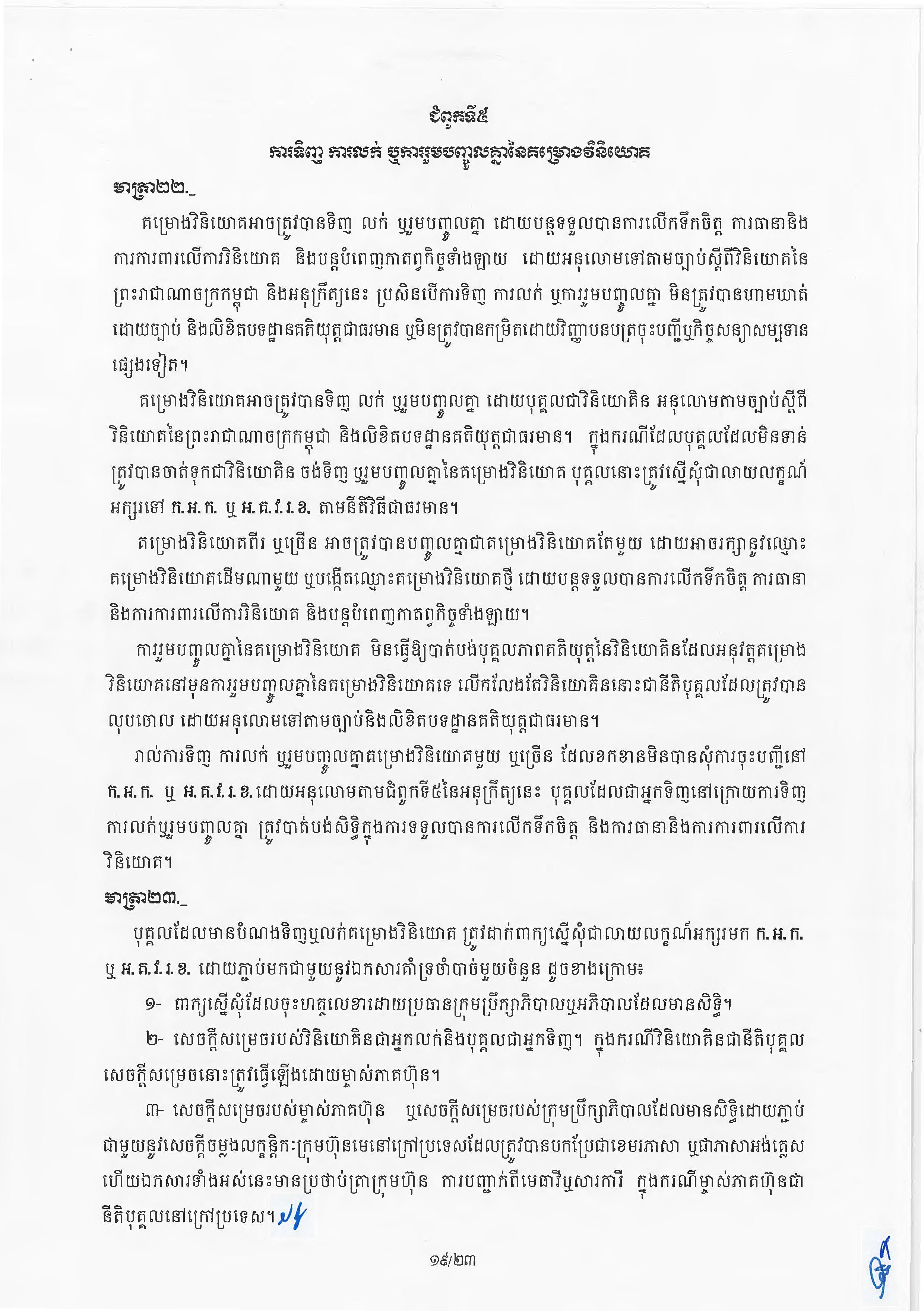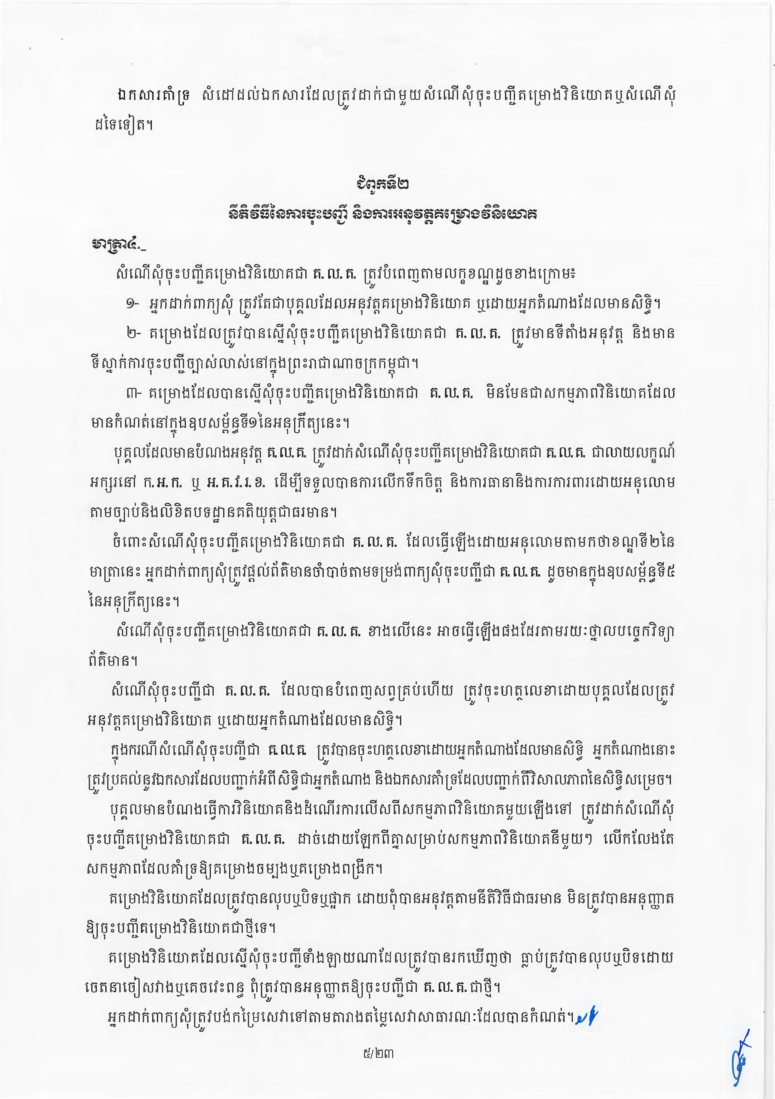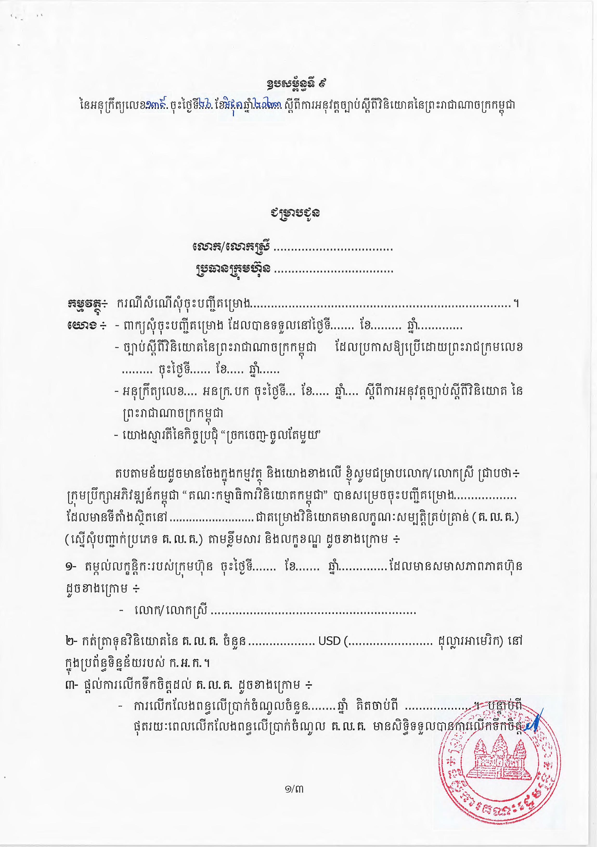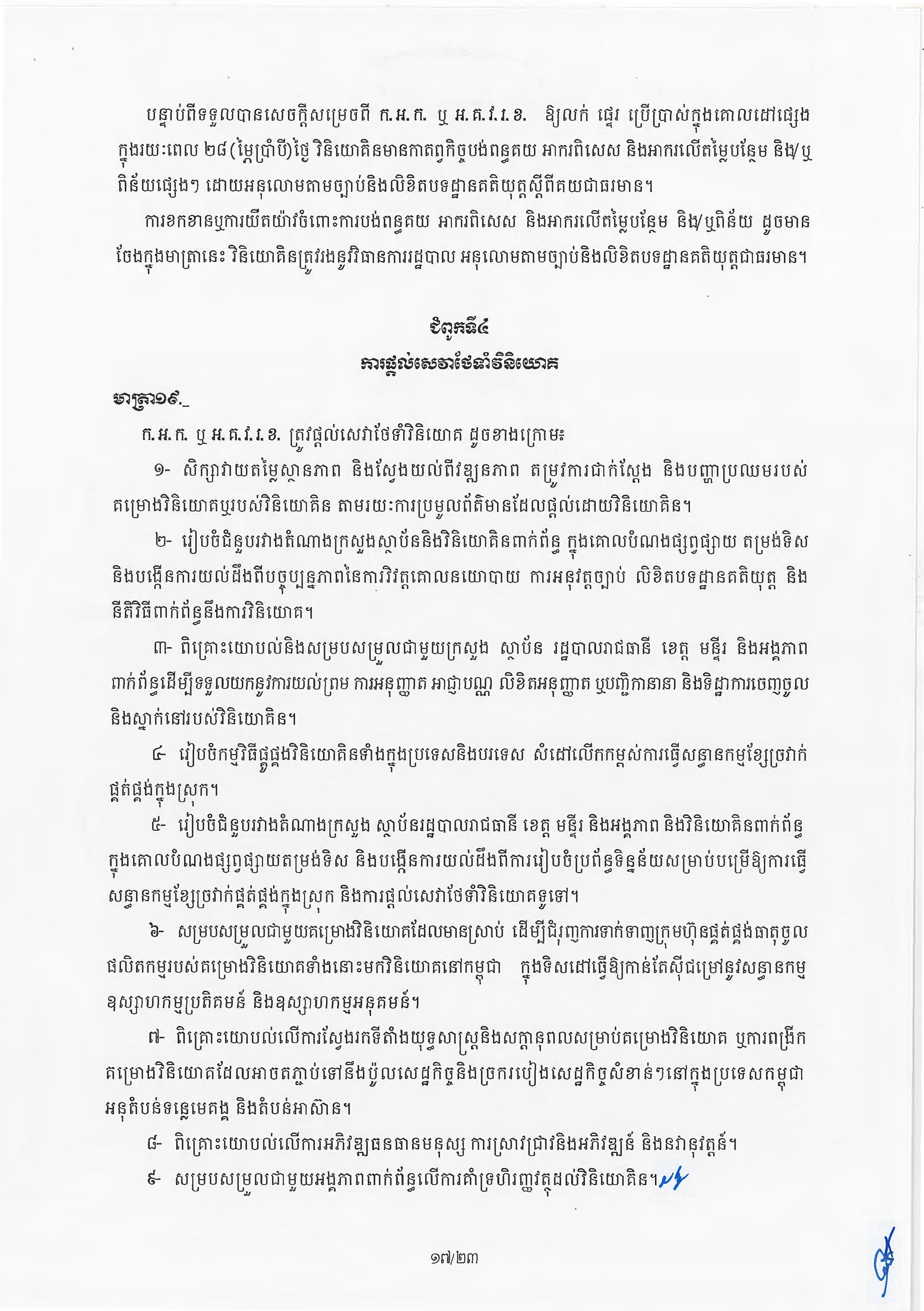(ភ្នំពេញ)៖ សម្តេចតេជោ ហ៊ុន សែន នាយករដ្ឋមន្ត្រីនៃកម្ពុជា បានចេញអនុក្រឹត្យស្តីពីការអនុវត្ត ច្បាប់ស្តីពីការវិនិយោគនៅព្រះរាជាណាចក្រកម្ពុជា។ នេះបើតាមអនុក្រឹត្យដែលបណ្តាញព័ត៌មាន Fresh News ទទួលបាននៅថ្ងៃទី២៧ ខែមិថុនា ឆ្នាំ២០២៣នេះ៕