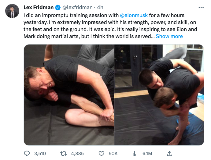 នៅក្នុងការបង្ហោះរបស់លោក Lex Fridman គាត់បានសរសេរថា៖ «ខ្ញុំបានធ្វើការហ្វឹកហាត់ជាមួយលោក @elonmusk រយៈពេលពីរបីម៉ោងកាលពីម្សិលមិញ។ ខ្ញុំចាប់អារម្មណ៍យ៉ាងខ្លាំងចំពោះកម្លាំង ថាមពល និងជំនាញរបស់គាត់ ទាំងជើង និងលើដី។ វាល្អខ្លាំងណាស់។ វាពិតជាគួរឱ្យគោរព ក្នុងការបានឃើញលោក Elon និងលោក Mark បង្ហាញពីសិល្បៈក្បាច់គុន ប៉ុន្តែខ្ញុំគិតថា ពិភពលោកនឹងកាន់តែល្អជាងនេះ ប្រសិនបើពួកគេហ្វឹកហាត់ក្បាច់គុន ប៉ុន្តែមិនប្រយុទ្ធគ្នាក្នុងទ្រុង។ ប៉ុន្តែយ៉ាងណា ដូចដែលលោក Elon ធ្លាប់បាននិយាយ “The most entertaining outcome is the most likely.” ខ្ញុំនឹងនៅមើលពួកគាត់ មិនថាមានរឿងអ្វីនោះទេ»។ ជម្រាបដែរថា លោក Lex Fridman ក៏ធ្លាប់ហាត់សម Jiu Jitsu ជាមួយលោក Mark Zuckerberg ផងដែរ៕ ផ្តល់សិទ្ធិដោយ៖ ខ្មែរណូត