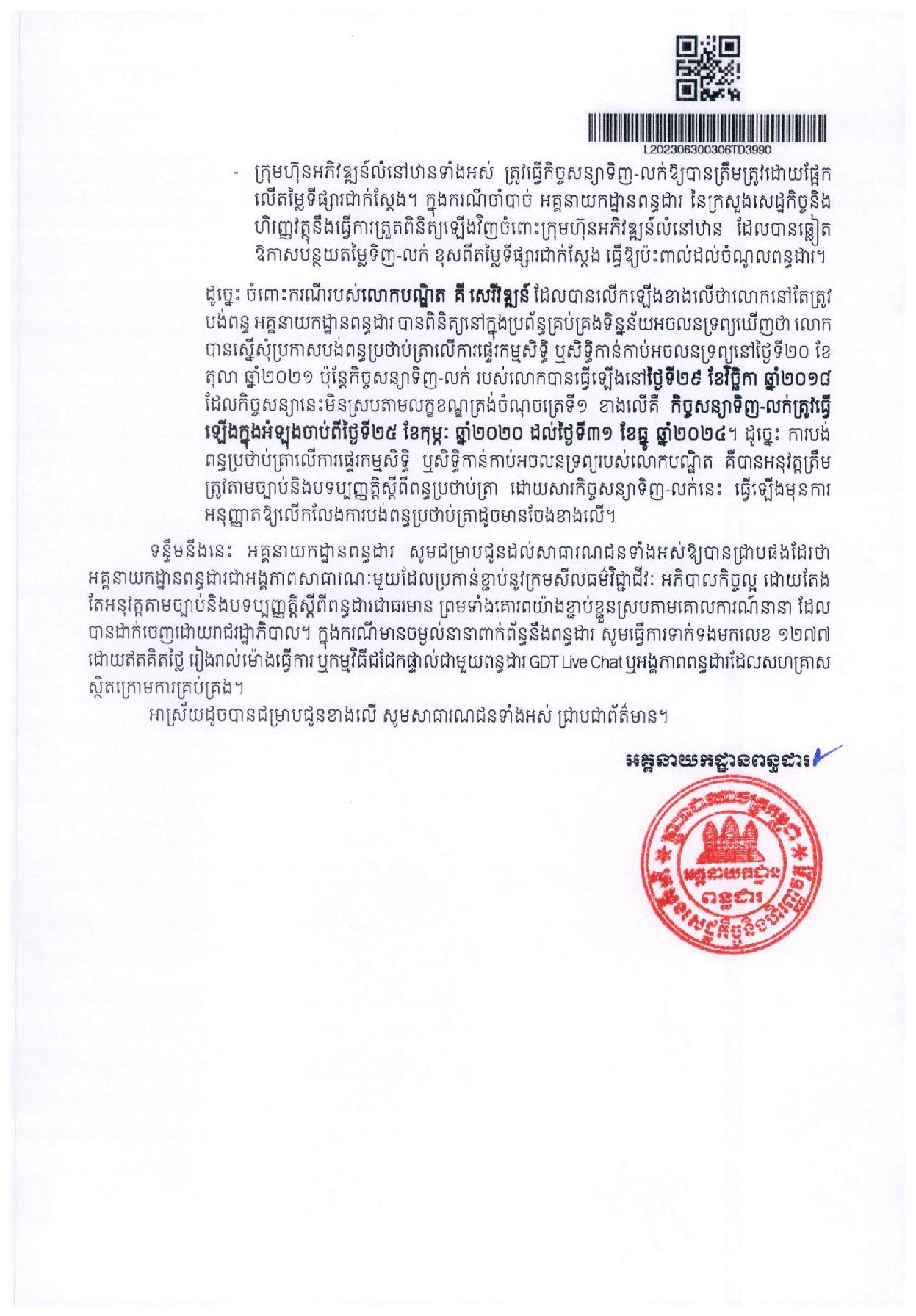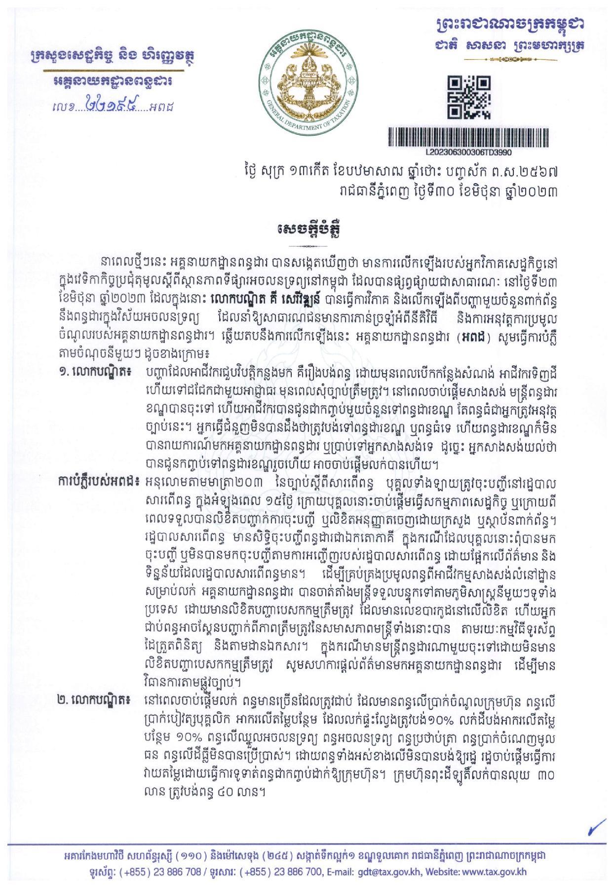 អគ្គនាយកដ្ឋានពន្ធដារ ចេញសេចក្តីបំភ្លឺជុំវិញការលើកឡើងរបស់បណ្ឌិត គី សេរីវឌ្ឍន៍ ពាក់ព័ន្ធនឹងពន្ធដារក្នុងវិស័យអចលនទ្រព្យ