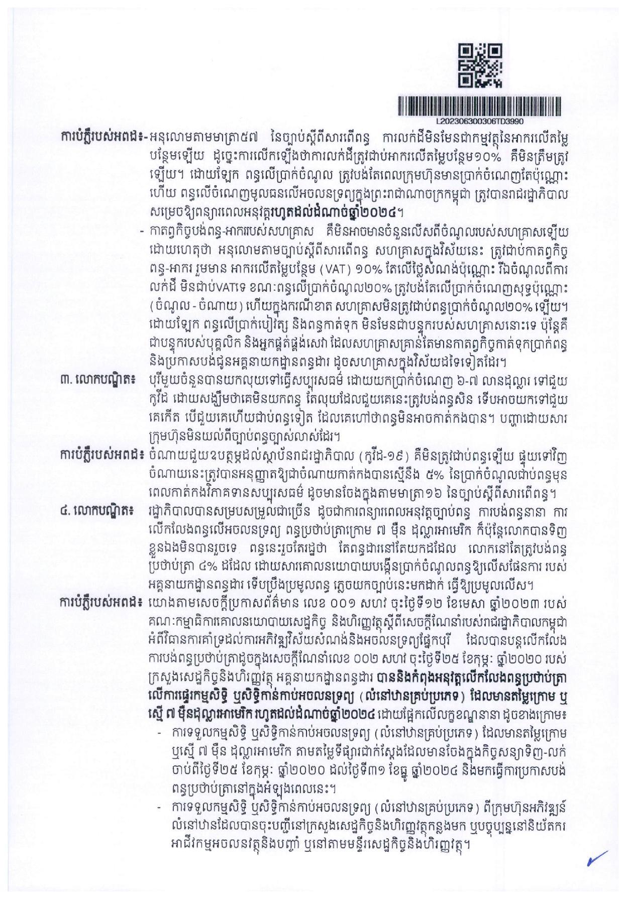 (ភ្នំពេញ)៖ អគ្គនាយកដ្ឋានពន្ធដារ នៅថ្ងៃទី៣០ ខែមិថុនា ឆ្នាំ២០២៣នេះ បានចេញសេចក្តីបំភ្លឺ ជុំវិញការលើកឡើងរបស់បណ្ឌិត គី សេរីវឌ្ឍន៍ កាលពីពេលថ្មីៗកន្លងទៅនេះ ពាក់ព័ន្ធនឹងពន្ធដារក្នុងវិស័យអចលនទ្រព្យ។