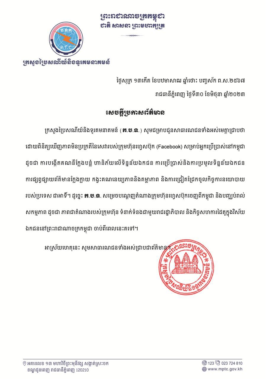 (ភ្នំពេញ)៖ ក្រសួងប្រៃសណីយ៍ និងទូរគមនាគមន៍ បានប្រកាសសម្រេចបណ្តេញតំណាងក្រុមហ៊ុន Facebook ចេញពីប្រទេសកម្ពុជា និងបញ្ឈប់រាល់សកម្មភាព ដូចជាភាពជាតំណាងរបស់ក្រុមហ៊ុន ទំនាក់ទំនងជាមួយរាជរដ្ឋាភិបាល និងកិច្ចសហការដៃគូក្នុងវិស័យឯកជន នៅប្រទេសកម្ពុជា ចាប់ពីថ្ងៃទី៣០ ខែមិថុនា ឆ្នាំ២០២៣នេះតទៅ។