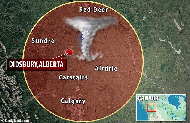 រូបភាពដែលទទួលបាន ក៏ដូចជាបានផ្សព្វផ្សាយនៅក្នុងបណ្ដាញសង្គមភាគច្រើនខ្យល់ព្យុះបានប៉ះពាល់ខ្លាំងនៅទីក្រុង Didsbury រដ្ឋ Alberta។ ទីប្រជុំជនក្បែរៗនោះ រួមទាំងទីក្រុង Carstairs ក៏បានទទួលរងឥទ្ធិពលដោយសារខ្យល់ព្យុះកំបុតត្បូងដ៏ធំនេះផងដែរ បានបន្ថែមទៀតថាខ្យល់ព្យុះកំបុតត្បូងអាចផ្លាស់ទីក្នុងល្បឿន ២៥ ម៉ាយក្នុងមួយម៉ោងដែលវាមានភាពគ្រោះថ្នាក់បំផុត និងអាចគំរាមកំហែងដល់អាយុជីវិត។ លើសពីនេះ ប្រទេសកាណាដាបានចេញសេចក្តីប្រកាសអាសន្នឱ្យប្រជាពលរដ្ឋមានការប្រុងប្រយ័ត្ន ចំពោះខ្យល់ព្យុះកំបុតត្បួងនេះ ព្រោះវាមានខ្យល់បក់បោកខ្លាំង គ្រាប់ព្រឹលធំៗ និងភ្លៀងធ្លាក់ខ្លាំង។ ផ្ដល់សិទ្ធិដោយ៖ Khmernote
