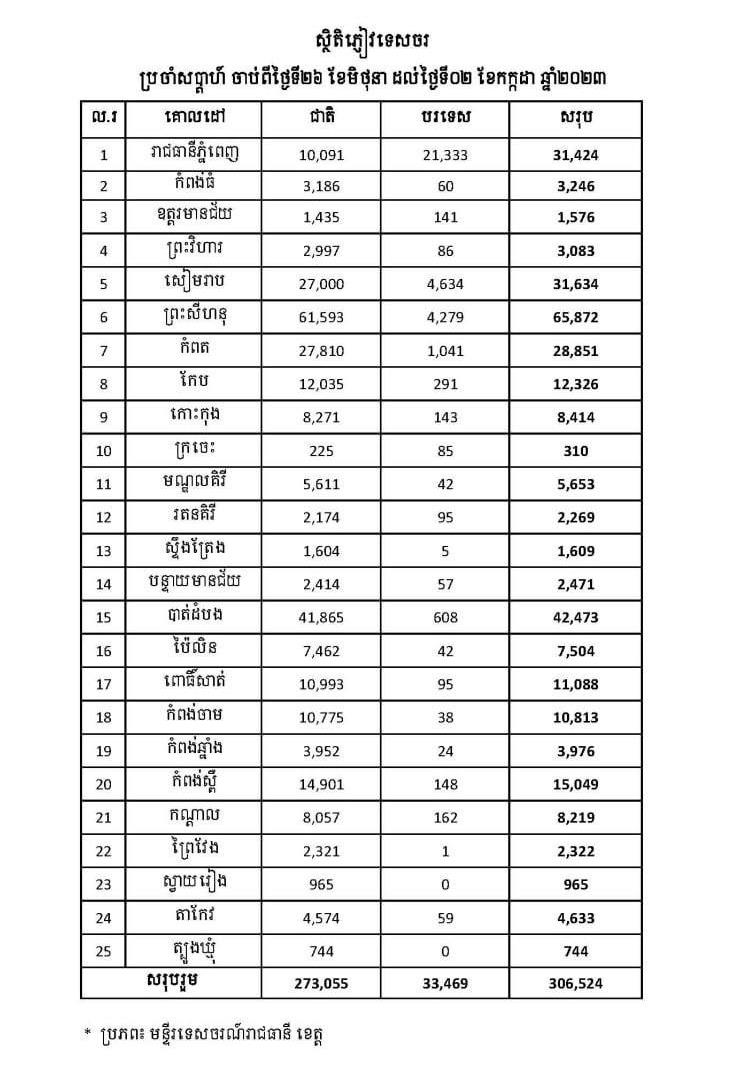 (ភ្នំពេញ)៖ ចាប់ពីថ្ងៃទី២៦ ខែមិថុនា ដល់ថ្ងៃទី២ ខែកក្កដា ឆ្នាំ២០២៣ មានភ្ញៀវទេសចរជាង៣០ម៉ឺននាក់ចេញដើរទស្សនាកម្សាន្តទូទាំងប្រទេស។ នេះបើតាមលោក ថោង ខុន រដ្ឋមន្ត្រីក្រសួងទេសចរណ៍។ លោកថា ភ្ញៀវសរុបមានចំនួន៣០៦,៥២៤នាក់ ក្នុងនោះភ្ញៀវជាតិ២៧៣,០៥៥នាក់ និងភ្ញៀវបរទេសផ្ទៃក្នុង៣៣,៤៦៩នាក់។