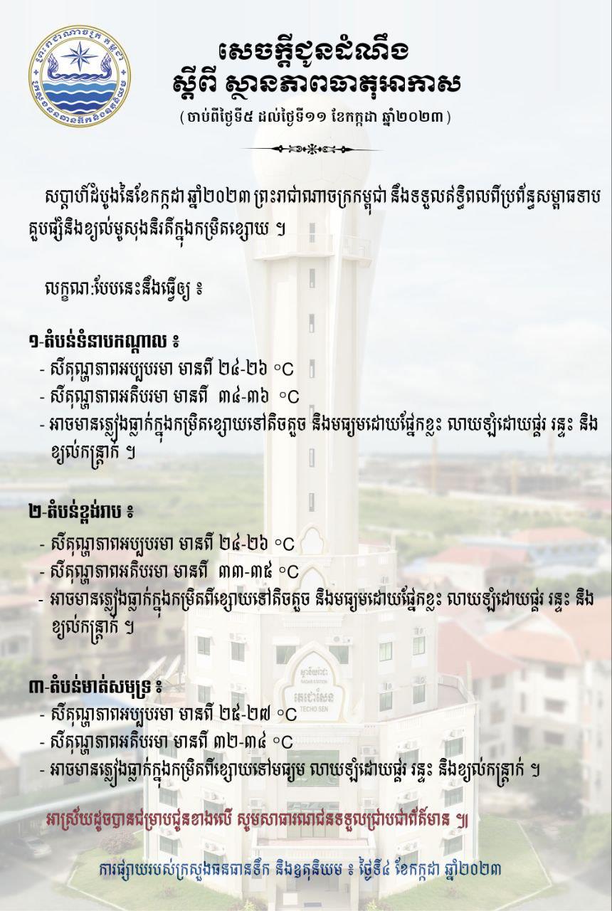 ក្រសួងបញ្ជាក់ថា សប្ដាហ៍ដំបូងនៃខែកក្កដា ឆ្នាំ២០២៣ ព្រះរាជាណាចក្រកម្ពុជា នឹងទទួលឥទ្ធិពលពីប្រព័ន្ធសម្ពាធទាបគួបផ្សំ និងខ្យល់មូសុងនិរតីក្នុងកម្រិតខ្សោយ។ លក្ខណ:បែបនេះនឹងធ្វើឲ្យ៖