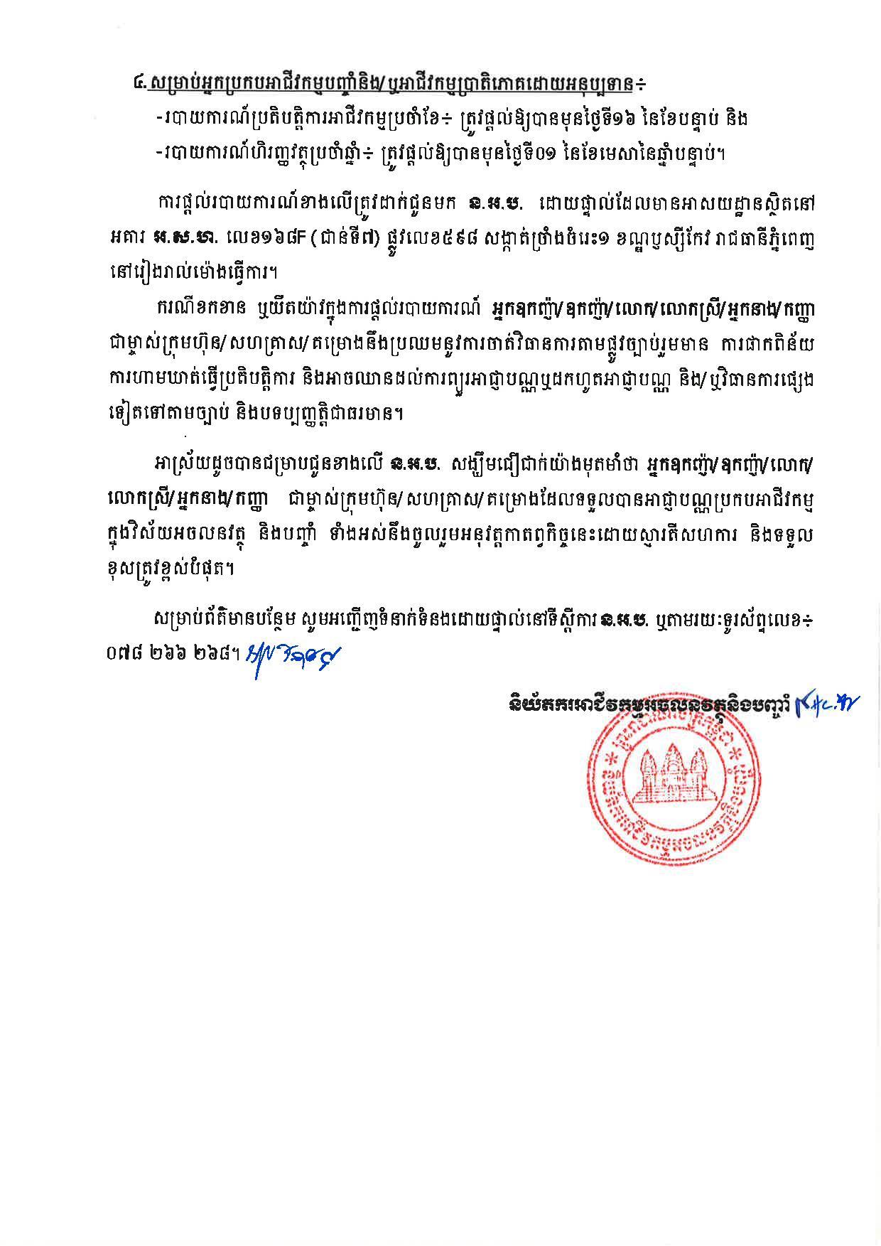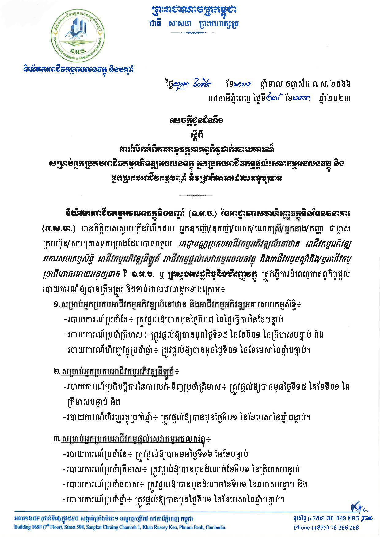 និយ័តករអាជីវកម្មអចលនវត្ថុ និងបញ្ចាំ ក្រើនរំលឹកអំពីកាតព្វកិច្ចដាក់របាយការណ៍ សម្រាប់អ្នកប្រកបអាជីវកម្មអចលនវត្ថុ និងអាជីវកម្មបញ្ចាំ
