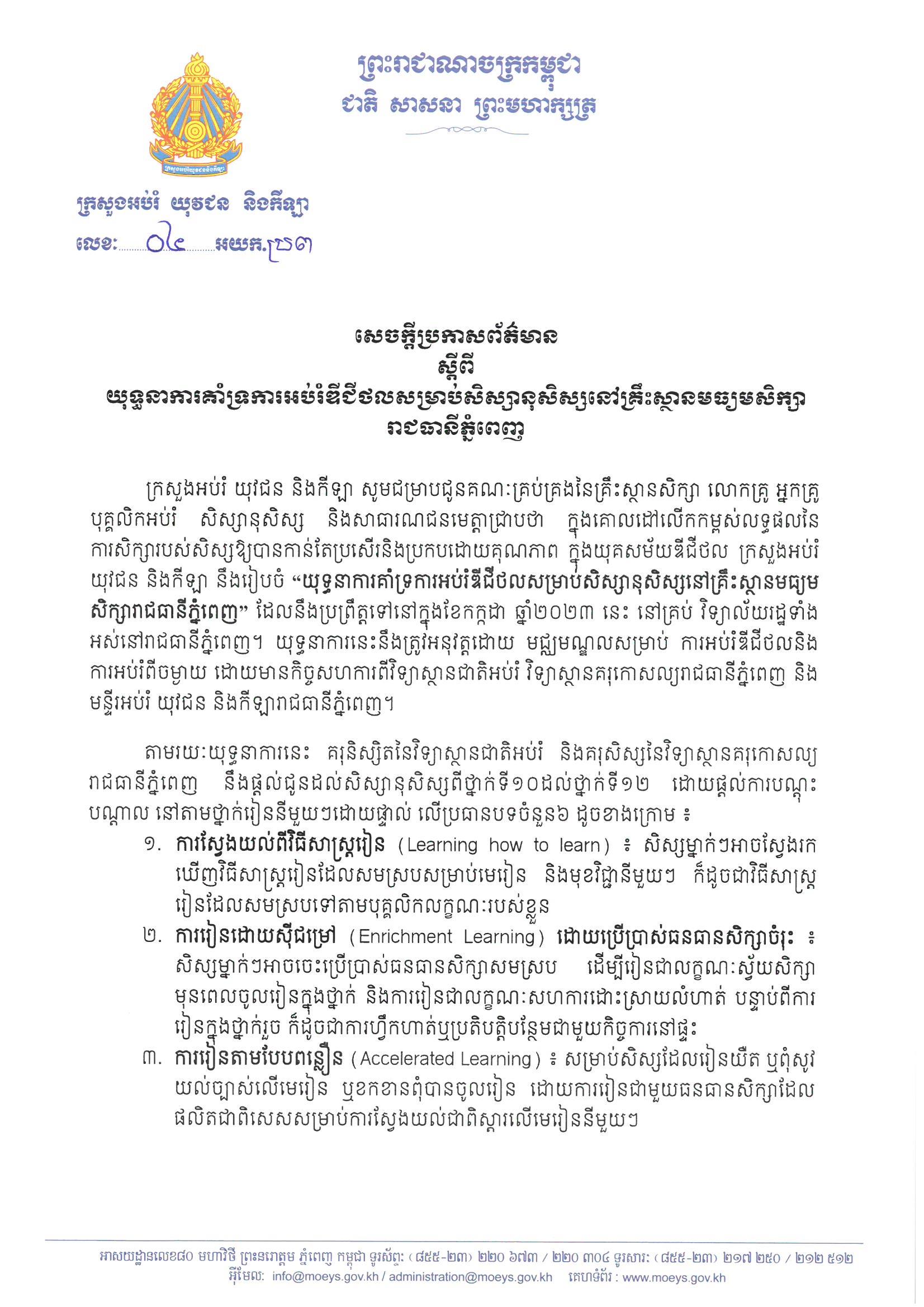 ខាងក្រោមនេះជាសេចក្តីប្រកាសព័ត៌មានរបស់ក្រសួងអប់រំ យុវជន និងកីឡា៖