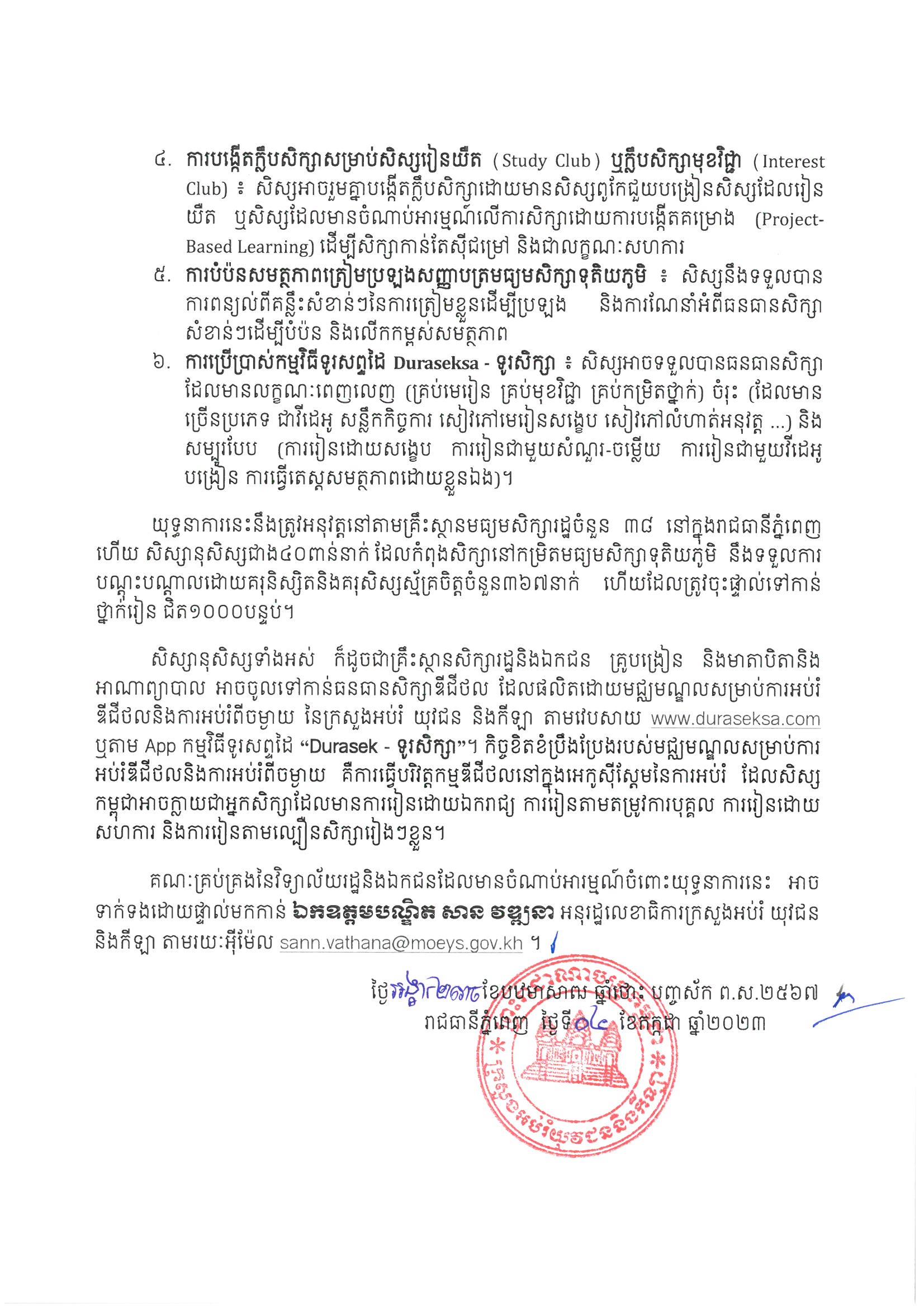 នៅក្នុងសេចក្តីប្រកាសព័ត៌មានរបស់ក្រសួងអប់រំ យុវជន និងកីឡា ដែលបណ្តាញព័ត៌មាន Fresh News ទទួលបាននៅរសៀលថ្ងៃទី០៤ ខែកក្កដា ឆ្នាំ២០២៣នេះ បានឱ្យដឹងទៀតថា យុទ្ធនាការនេះនឹងត្រូវអនុវត្តដោយមជ្ឈមណ្ឌលសម្រាប់ ការអប់រំឌីជីថលនិង ការអប់រំពីចម្ងាយ ដោយមានកិច្ចសហការពីវិទ្យាស្ថានជាតិអប់រំ វិទ្យាស្ថានគរុកោសល្យរាជធានីភ្នំពេញ និងមន្ទីរអប់រំ យុវជន និងកីឡារាជធានីភ្នំពេញ។