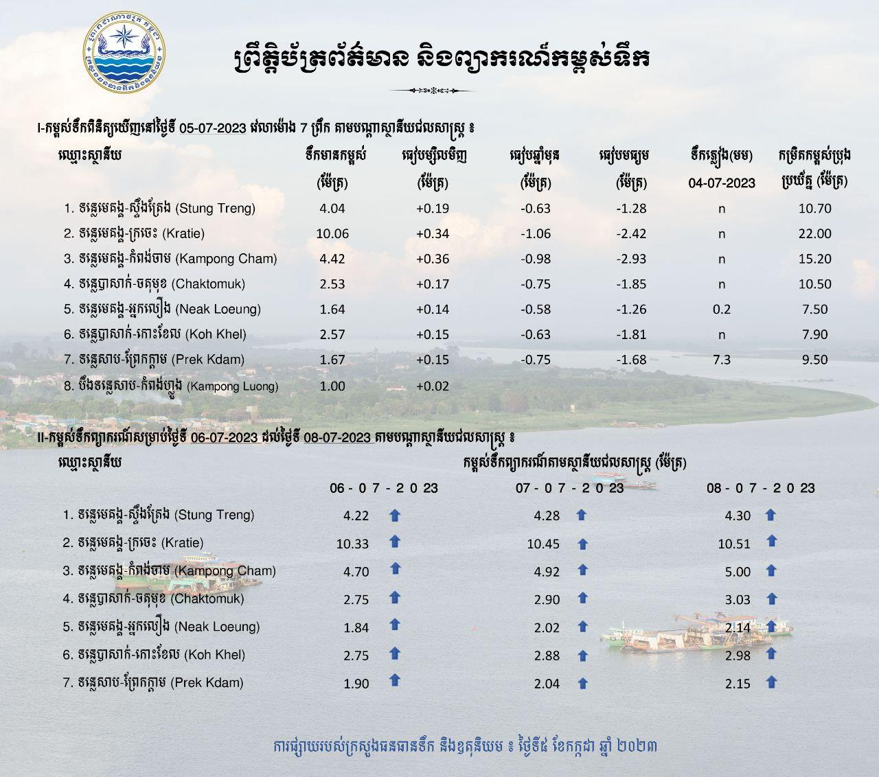 (ភ្នំពេញ)៖ ក្រសួងធនធានទឹក និងឧតុនិយម នៅព្រឹកថ្ងៃទី៥ ខែកក្កដា ឆ្នាំ២០២៣នេះ បានចេញព្រឹត្តបត្រព័ត៌មាន និងព្យាករណ៍កម្ពស់ទឹក នៅតាមបណ្តាស្ថានីយជលសាស្ត្រទាំង៨។