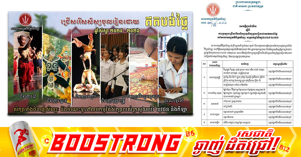 (ភ្នំពេញ)៖ សាលាមធ្យមវិចិត្រសិល្បៈ បានប្រកាសជ្រើសរើសសិស្សចូលរៀនដោយឥតបង់ថ្លៃ សម្រាប់ឆ្នាំសិក្សា២០២៥-២០២៦ ដែលចាប់ផ្ដើមចែកពាក្យនិងទទួលពាក្យចាប់ពីថ្ងៃជូនដំណឹងនេះ រហូតដល់ថ្ងៃ៧ ខែតុលា ឆ្នាំ២០២៥។ កាលបរិច្ឆេទប្រឡង នៅថ្ងៃទី១៥ ខែតុលា ឆ្នាំ២០២៥៕ ខាងក្រោមនេះជាសេចក្តីជូនដំណឹង៖