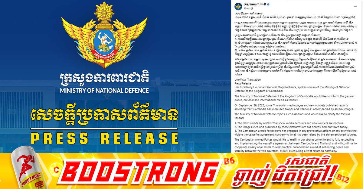 (ភ្នំពេញ)៖ លោកស្រីឧត្តមសេនីយ៍ឯក ម៉ាលី សុជាតា អ្នកនាំពាក្យក្រសួងការពារជាតិ នៅព្រឹកថ្ងៃទី២៦ ខែកញ្ញា ឆ្នាំ២០២៥នេះ បានចេញមកទាត់ចោលទាំងស្រុង ចំពោះការចោទប្រកាន់របស់ភាគីថៃ និងសារព័ត៌មានរបស់ថៃថា «កម្ពុជាបានចល័តទ័ព និងសព្វាវុធ»។ ផ្ទុយទៅវិញ កម្ពុជាមិនបានធ្វើសកម្មភាពបង្កហេតុ ឬធ្វើសកម្មភាពណាមួយរំលោភបំពានលើកិច្ចព្រមព្រៀងបទឈប់បាញ់នោះឡើយ។ តាមរយៈសេចក្ដីប្រកាសព័ត៌មាន ក្រសួងការពារជាតិ បានធ្វើការបដិសេធ និងសូមគូសបញ្ជាក់នូវការពិតថា៖ *១៖ ការលើកឡើងរបស់បណ្តាញសង្គម និងសារព័ត៌មានថៃមួយចំនួនខាងលើ មិនមែនជាការពិតទេ*២៖ ចំពោះរូបភាពដែលបណ្តាញសង្គម និងសារព័ត៌មានថៃបានយកទៅផ្សព្វផ្សាយនោះ គឺជារូបភាពចាស់ៗ ដែលមិនមែនជារូបភាពក្នុងថ្ងៃនេះនោះទេ*៣៖ កងកម្លាំងរបស់កម្ពុជាមិនបានធ្វើសកម្មភាពបង្កហេតុ ឬធ្វើសកម្មភាពណាមួយដែលរំលោភបំពានលើ កិច្ចព្រមព្រៀងបទឈប់បាញ់ ដូចការលើកឡើងរបស់បណ្តាញសង្គម និងសារព័ត៌មានថៃនោះឡើយ។ កងកម្លាំងរបស់កម្ពុជា សូមបញ្ជាក់សាជាថ្មីនូវការប្តេជ្ញាចិត្តយ៉ាងម៉ឺងម៉ាត់ ក្នុងការគោរព និងការអនុវត្ត នូវកិច្ចព្រមព្រៀងបទឈប់បាញ់រវាងកម្ពុជានិងថៃ ឲ្យបានពេញលេញ