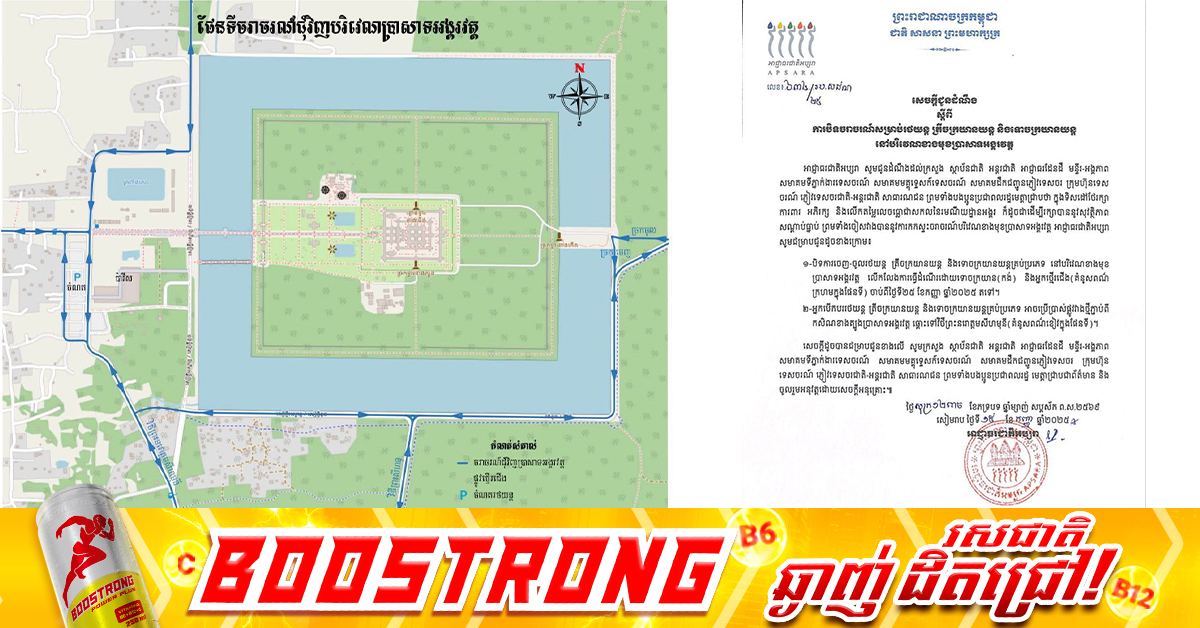 (សៀមរាប)៖ អាជ្ញាធរជាតិអប្សរា បានចេញសេចក្តីជូនដំណឹង ស្តីពី ការបិទចរាចរណ៍ សម្រាប់រថយន្ត ត្រីចក្រយានយន្ត និងទោចក្រយានយន្ត នៅបរិវេណខាងមុខប្រាសាទអង្គរវត្ត។ នេះបើតាមសេចក្ដីជូនដំណឹង ដែលបណ្ដាញព័ត៌មាន Fresh News ទទួលបាននៅថ្ងៃទី១៩ ខែកញ្ញា ឆ្នាំ២០២៥។ អាជ្ញាធរជាតិអប្សរា បានឲ្យដឹងថា ក្នុងទិសដៅថែរក្សា ការពារ អភិរក្ស និងលើកតម្លៃលេចធ្លោជាសកល នៃរមណីយដ្ឋានអង្គរ ក៏ដូចជាដើម្បីរក្សាបាននូវសុវត្ថិភាព សណ្តាប់ធ្នាប់ ព្រមទាំងចៀសវាងបាន នូវការកកស្ទះចរាចរណ៍បរិវេណខាងមុខប្រាសាទអង្គរវត្ត អាជ្ញាធរជាតិអប្សរា សូមជម្រាបជូនដូចខាងក្រោម៖ ១៖ បិទការចេញ-ចូលរថយន្ត ត្រីចក្រយានយន្ត និងទោចក្រយានយន្តគ្រប់ប្រភេទ នៅបរិវេណខាងមុខ ប្រាសាទអង្គរវត្ត