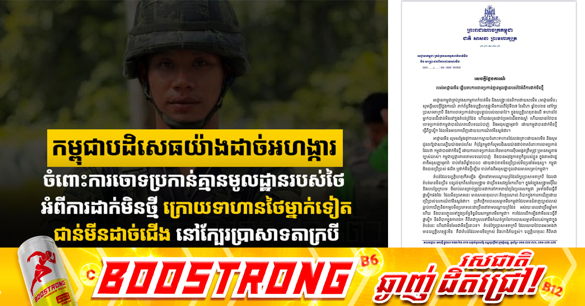 (ភ្នំពេញ)៖ អាជ្ញាធរកម្ពុជាគ្រប់គ្រងសកម្មភាពកំចាត់មីន និងសង្គ្រោះជនពិការដោយសារមីន (អាជ្ញាធរមីន) នៅថ្ងៃទី២៨ ខែសីហា ឆ្នាំ២០២៥នេះ បានចេញសេចក្តីថ្លែងការណ៍ ពាក់ព័ន្ធនឹងឧប្បត្តិហេតុផ្ទុះមីន កាលពីថ្ងៃទី២៧ ខែសីហា ឆ្នាំ២០២៥ នៅក្បែរប្រាសាទតាក្របី និងការចោទប្រកាន់ជាបន្តបន្ទាប់របស់យោធាថៃ។ អាជ្ញាធរមីនបញ្ជាក់ថា ក្នុងឧប្បត្តិហេតុខាងលើទាហានថៃម្នាក់ បានដើរជាន់មីននៅក្នុងតំបន់ព្រំដែន ហើយរងរបួសដាច់ប្រអប់ជើងខាងស្តាំ ហើយយោធាថៃបាន ចោទប្រកាន់ថា កម្ពុជាបានរំលោភលើបទឈប់បាញ់ និងអនុសញ្ញាអូតាវ៉ា ដោយកម្ពុជាបានដាក់មិនថ្មី ធ្វើពីប្លាស្ទិក ដែលមិនអាចរកឃើញដោយឧបករណ៍រាវមីនស្តង់ដារ។ អាជ្ញាធរមីន សូមសម្តែងនូវការសោកស្តាយ ចំពោះទាហានដែលរងគ្រោះដោយសារមីន និងសូមជូនពរឱ្យជាសះស្បើយយ៉ាងឆាប់រហ័ស ក៏ប៉ុន្តែកម្ពុជាក៏សូមបដិសេធយ៉ាងដាច់ខាត ចំពោះការចោទប្រកាន់ដែលថា កម្ពុជាបានដាក់មីនថ្មី ដោយការចោទប្រកាន់នេះ មិនមានការស៊ើបអង្កេតត្រឹមត្រូវ ឬមានភស្តុតាងច្បាស់លាស់។