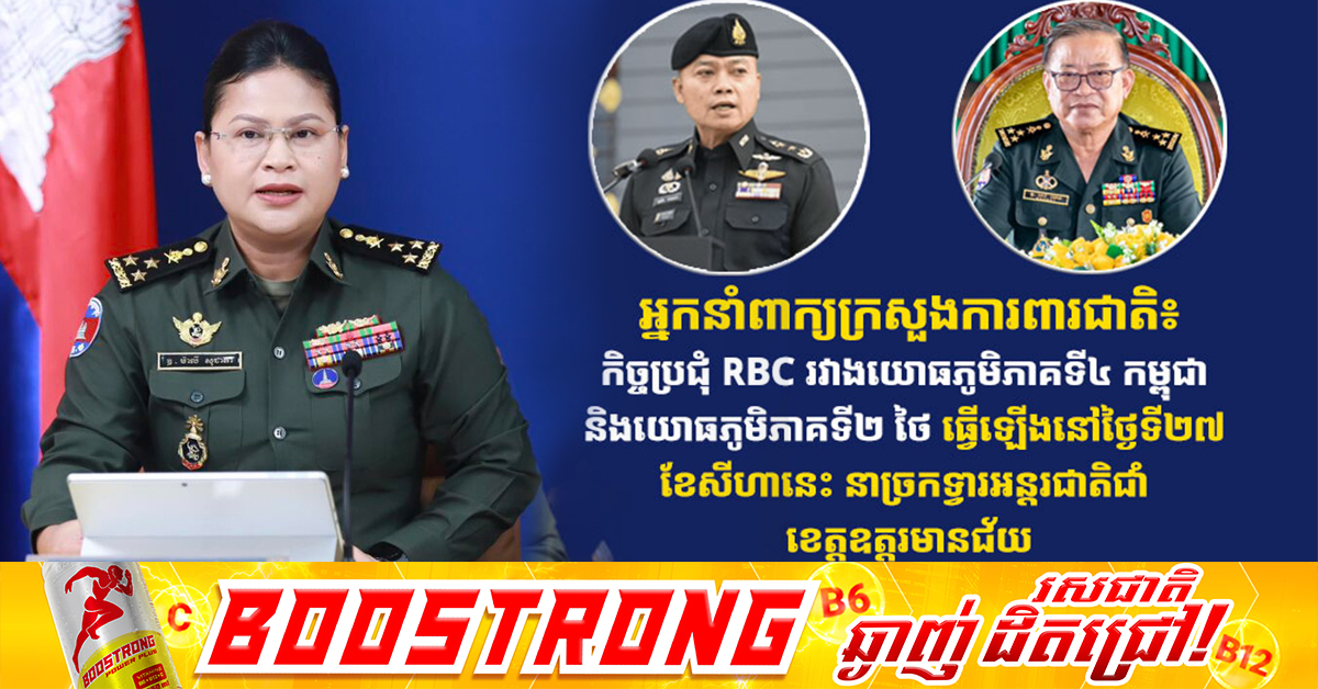 (ភ្នំពេញ)៖ លោកស្រីឧត្តមសេនីយ៍ឯក ម៉ាលី សុជាតា អ្នកនាំពាក្យក្រសួងការពារជាតិកម្ពុជា នៅព្រឹកថ្ងៃទី២៧ ខែសីហា ឆ្នាំ២០២៥នេះ បានឲ្យដឹងថា នៅថ្ងៃនេះនឹងមានកិច្ចប្រជុំវិសាមញ្ញរបស់គណៈកម្មាធិការព្រំដែនថ្នាក់យោធភូមិភាគកម្ពុជា-ថៃ (RBC) ដែលធ្វើឡើងរវាងមេបញ្ជាការយោធភូមិភាគទី៤ កម្ពុជា ជាមួយមេបញ្ជាការយោធភូមិភាគទី២ របស់ថៃ នៅច្រកទ្វារព្រំដែនអន្ដរជាតិជាំ ខេត្តឧត្តរមានជ័យ។ ក្នុងសន្និសីទសារព័ត៌មាន បង្ហាញបច្ចុប្បន្នភាព នៃការអនុវត្តបទឈប់បាញ់កម្ពុជា ថៃ លោកស្រីឧត្តមសេនីយ៍ឯក ម៉ាលី សុជាតា បានអះអាងថា កិច្ចប្រជុំ RBC នេះភាគីកម្ពុជា ដឹកនាំដោយដឹកនាំដោយលោកឧត្តមសេនីយ៍ឯក ពៅ ហេង មេបញ្ជាការយោធភូមិភាគទី៤ និងភាគីថៃ ដឹកនាំដោយលោកឧត្តមសេនីយ៍ឯក ប៊ុនស៊ីន