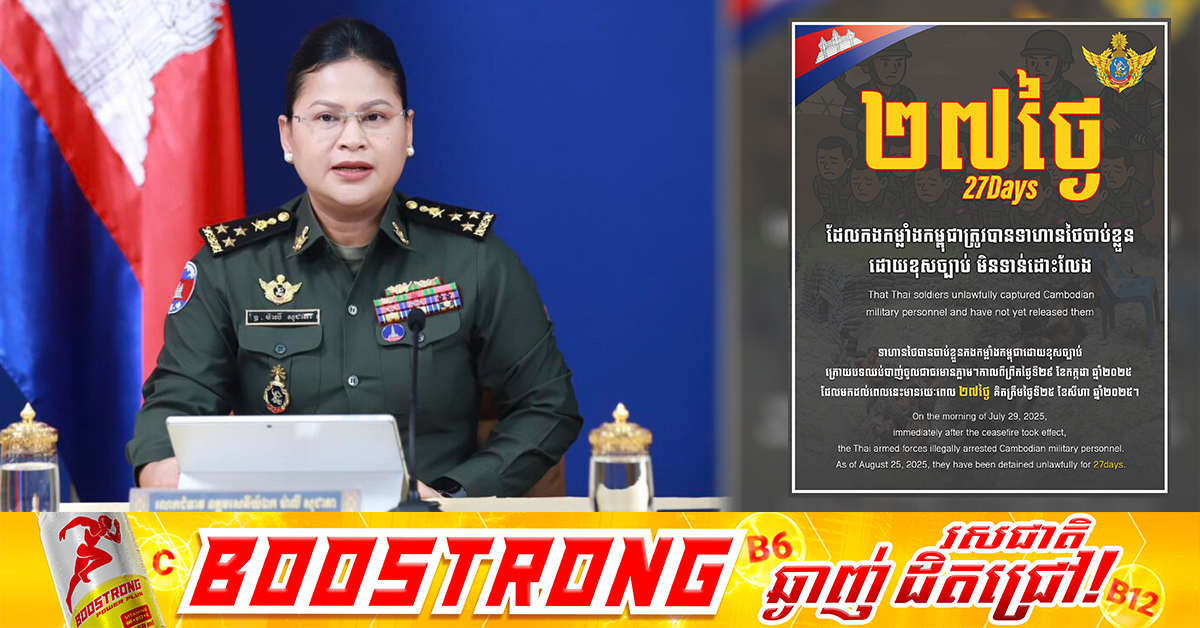 (ភ្នំពេញ)៖ លោកស្រីឧត្តមសេនីយ៍ឯក ម៉ាលី សុជាតា អ្នកនាំពាក្យក្រសួងការពារជាតិ បានថ្លែងបញ្ជាក់ថា ពីការបន្តទាមទារសារជាថ្មីឱ្យភាគីថៃអនុវត្តកិច្ចព្រមព្រៀងបទឈប់បាញ់ ដោយប្រគល់ឱ្យកម្ពុជាវិញនូវកងកម្លាំងកម្ពុជា ១៨រូប ដែលយោធាថៃ បានចូលចាប់ខ្លួនដោយខុសច្បាប់ក្រោយបទឈប់បាញ់ចូលជាធរមាន ដែលគិតមកដល់ពេលនេះមានរយៈពេល ២៦ថ្ងៃ។ តាមរយៈការសង្ខេបព័ត៌មានប្រចាំថ្ងៃ បង្ហាញអំពីបច្ចុប្បន្នភាពនៃការអនុវត្តបទឈប់បាញ់ នាព្រឹកថ្ងៃទី២៥ ខែសីហា ឆ្នាំ២០២៥នេះ លោកស្រីឧត្តមសេនីយ៍ឯក ម៉ាលី សុជាតា បានថ្លែងយ៉ាងដូច្នេះថា «កម្ពុជា ក៏នៅតែបន្តអំពាវនាវឱ្យភាគីថៃអនុវត្តកិច្ចព្រមព្រៀងបទឈប់បាញ់ ដោយប្រគល់ឱ្យកម្ពុជាវិញនូវកងកម្លាំងកម្ពុជា ១៨រូប ដើម្បីឱ្យពួកគាត់អាចវិលត្រឡប់មកជួបជុំក្រុមគ្រួសារដែលទទឹងរង់ចាំទាំងថ្ងៃទាំងយប់»។ លោកស្រីឧត្តមសេនីយ៍ឯក ម៉ាលី សុជាតា បានបន្ថែមថា ទាហ៊ានថៃ បានចូលមកចាប់ខ្លួនកងកម្លាំងកម្ពុជា ដោយខុសច្បាប់ក្រោយបទឈប់បាញ់ចូលជាធរមានភ្លាមៗ កាលពីថ្ងៃទី២៩