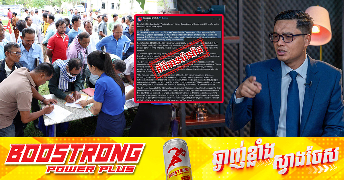 (ភ្នំពេញ)៖ ក្រសួងការងារ និងបណ្តុះបណ្តាលវិជ្ជាជីវៈ នៅថ្ងៃទី០៦ ខែសីហា ឆ្នាំ២០២៥នេះ បានទាត់ចោលការផ្សព្វផ្សាយបែបបំភ្លៃរបស់កាសែតថៃ Khaosod English ដែលបានលើកឡើងថា ពលរដ្ឋកម្ពុជាវិលមកកម្ពុជាយ៉ាងគំហុកនេះ ក្រោមហេតុផលការគំរាមដកសញ្ជាតិ និងការរឹបអូសដីធ្លី។ អ្នកនាំពាក្យក្រសួងការងារ និងបណ្តុះបណ្តាលវិជ្ជាជីវៈ លោក ស៊ុន មេសា បានអះអាងថា កម្ពុជាគ្មានការគំរាមកំហែងបែបនេះឡើយ ហើយមូលហេតុចម្បងដែលធ្វើឱ្យពលរដ្ឋខ្មែរត្រលប់មកកម្ពុជាយ៉ាងគំហុកនេះ គឺដោយសារអំពើហិង្សាពីក្រុមជ្រុលនិយមថៃមកលើពលរដ្ឋខ្មែរ ដែលមិនទាន់មានចំណាត់ការនៅឡើយ ការឈ្លានពានពីយោធាថៃមកកម្ពុជា និងការអំពាវនាវពីសម្តេចអគ្គមហាសេនាបតីតេជោ ហ៊ុន សែន ប្រធានព្រឹទ្ធសភា និងសម្តេចមហាបវរធិបតី ហ៊ុន ម៉ាណែត ប្រមុខរាជរដ្ឋាភិបាល រួមទាំងការចង់វិលមកជួយសេដ្ឋកិច្ចប្រទេសជាតិវិញរបស់ពលរដ្ឋ។ លោក ស៊ុន