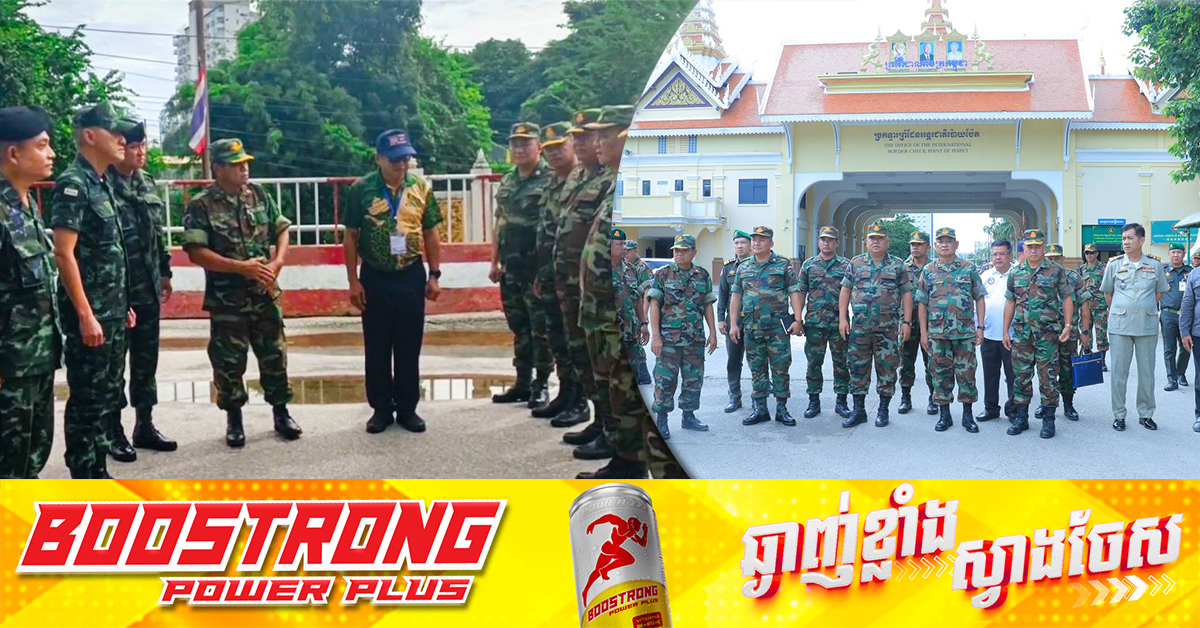 (បន្ទាយមានជ័យ)៖ លោកឧត្តមសេនីយ៍ឯក ឯក សំអូន មេបញ្ជាការយោធភូមិភាគទី៥ កម្ពុជា នៅព្រឹកថ្ងៃទី២៩ ខែកក្កដា ឆ្នាំ២០២៥ បានពិភាក្សាគ្នាជាមួយមេបញ្ជាការភូមិភាគទី១របស់ថៃ។ ជំនួបនេះ បានធ្វើឡើងនៅលើស្ពាន ច្រកទ្វារអន្តរជាតិប៉ោយប៉ែត ខេត្តបន្ទាយមានជ័យ។ ក្នុងជំនួបនោះ ភាគីទាំងពីរឯកភាពគ្នា គោរពកិច្ចព្រមព្រៀងបទឈប់បាញ់របស់ថ្នាក់ដឹកនាំ នៃប្រទេសទាំងពីរ, សន្យាឈប់បង្កើនទ័ព និងចល័តកម្លាំងទ័ពចៀសវាងការប្រឈមមុខដាក់គ្នា និងភ្ជាប់ទំនាក់ទំនង និងផ្តល់ព័ត៌មានឲ្យគ្នា ទៅវិញទៅមក ហើយប្រសិនបើមានបញ្ហាអ្វីកើតឡើងត្រូវទំនាក់ទំនងគ្នាភ្លាមៗ ដើម្បីដោះស្រាយ និងបន្តទំនាក់ទំនងឲ្យល្អប្រសើរឡើងវិញ។ សូមជម្រាបថា កម្ពុជា-ថៃ បានឯកភាពគ្នាលើបទឈប់បាញ់ ដែលអនុវត្តចាប់ពីម៉ោង ១២រំលងអធ្រាត្រថ្ងៃទី២៨ ខែកក្កដា ឆ្នាំ២០២៥។ ការឯកភាពគ្នានេះ បានធ្វើឡើងក្នុងកិច្ចចរចាមួយនៅប្រទេសម៉ាឡេស៉ី